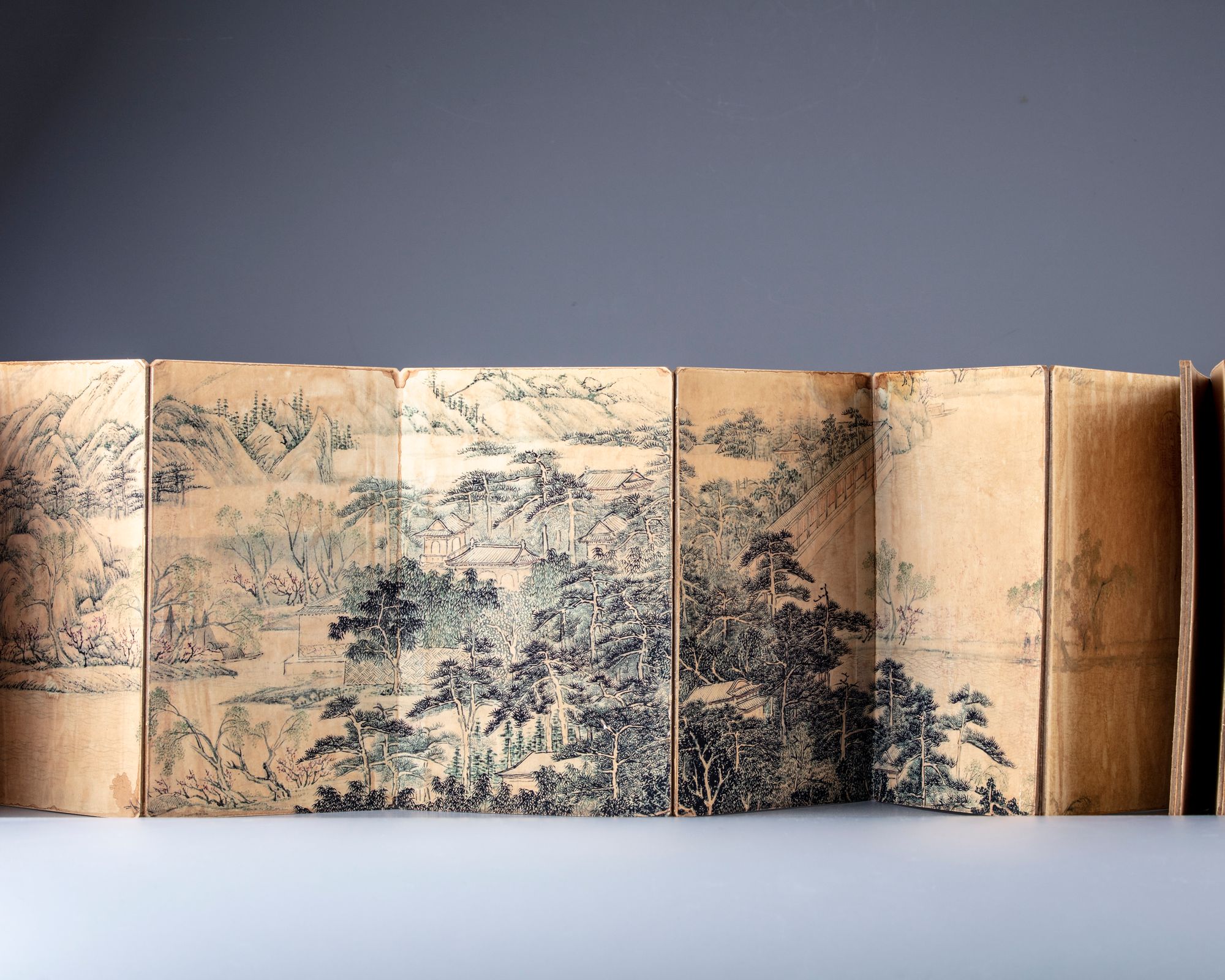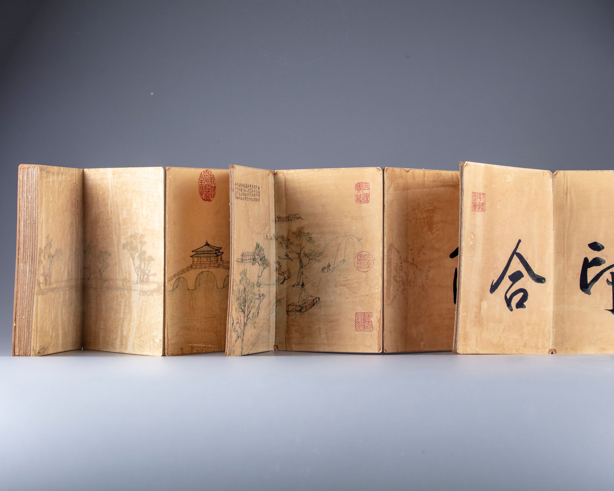 A Chinese book depicting prints with houses in a mountain landscape with Chinese inscriptions.