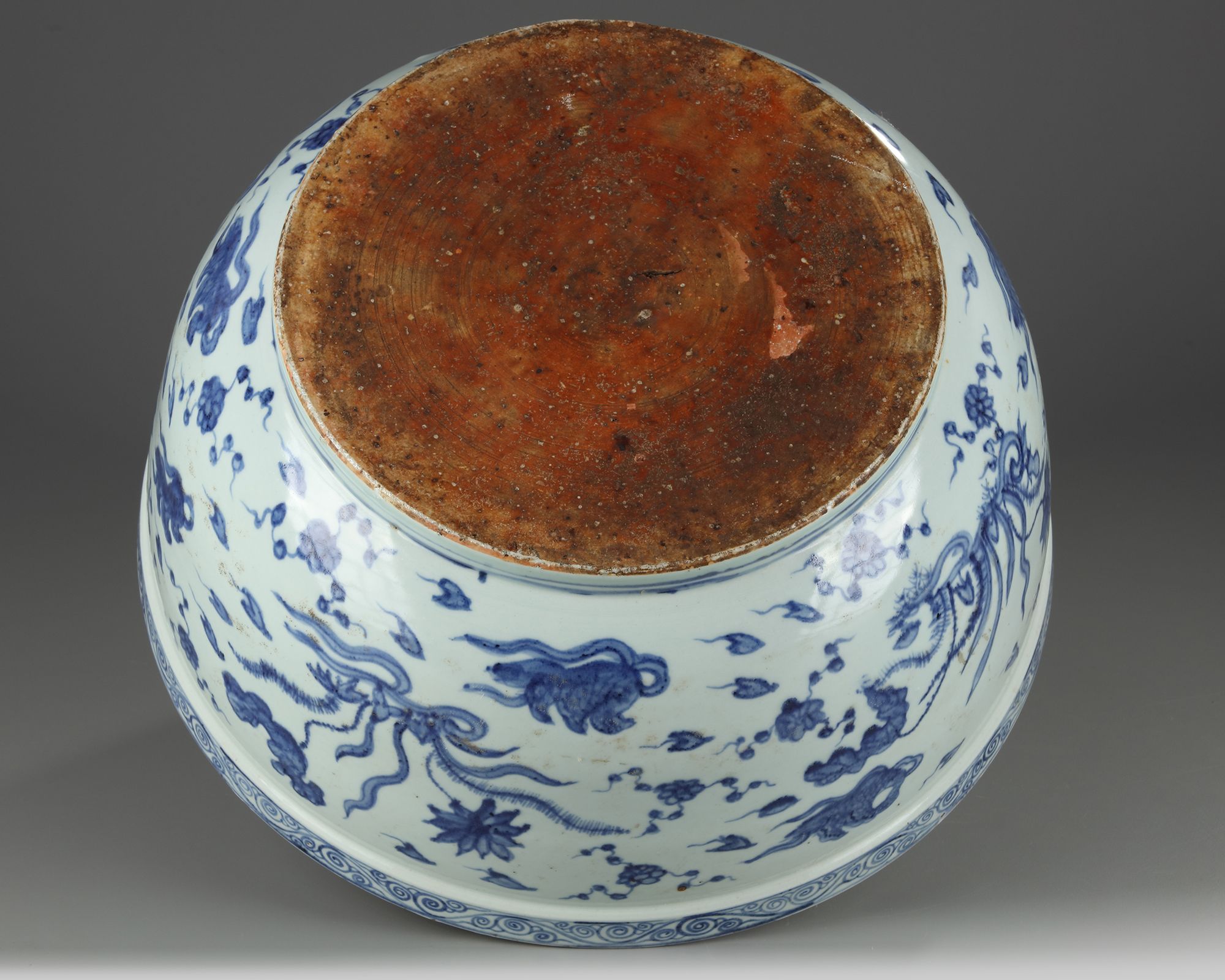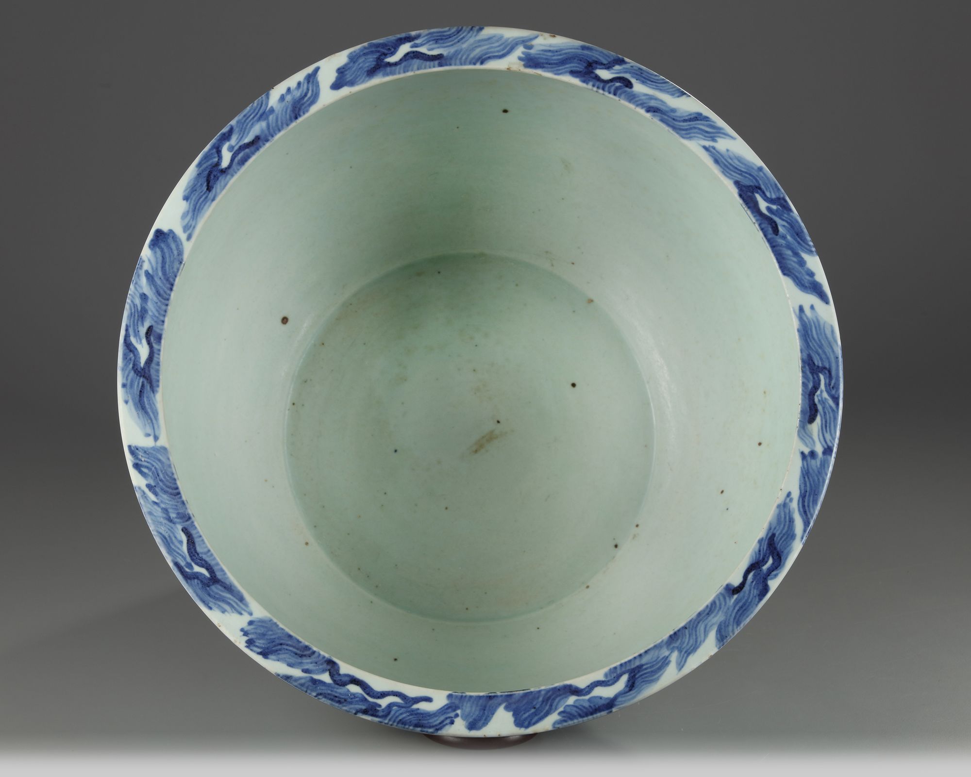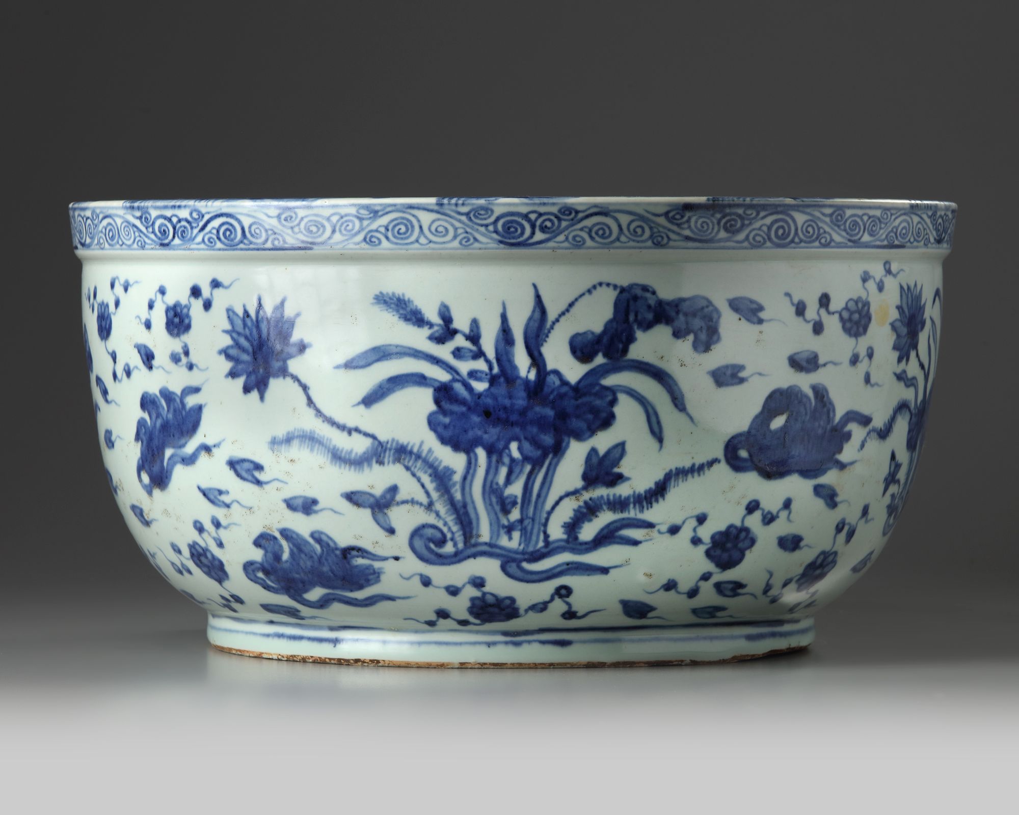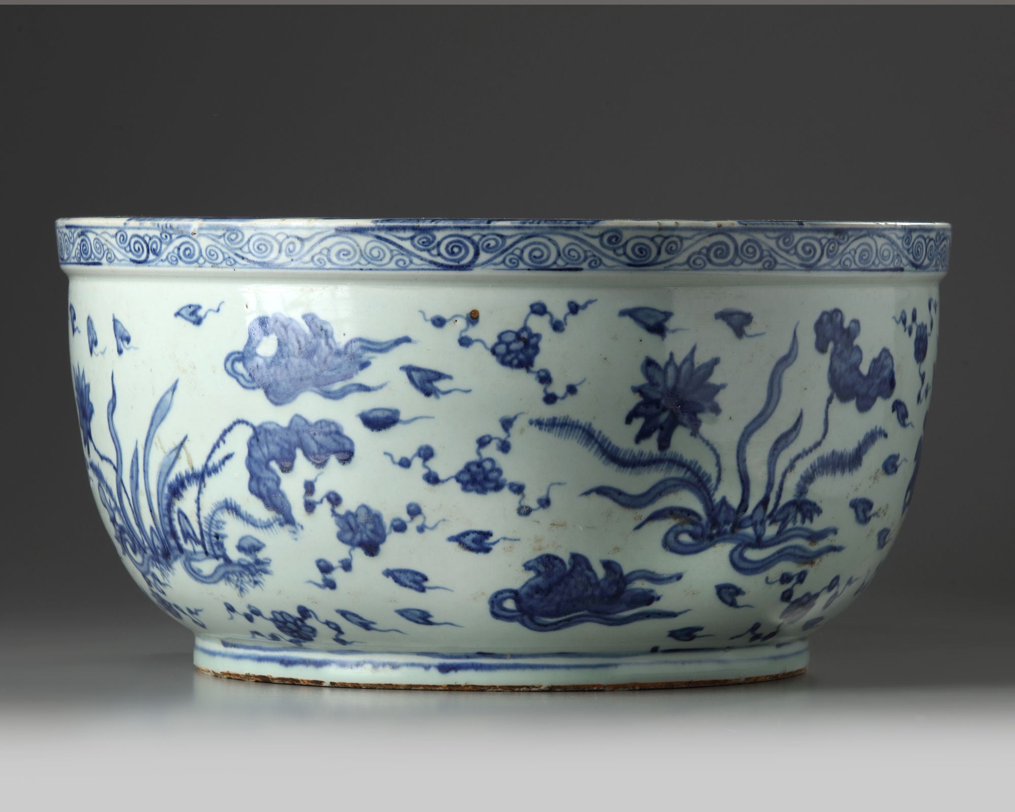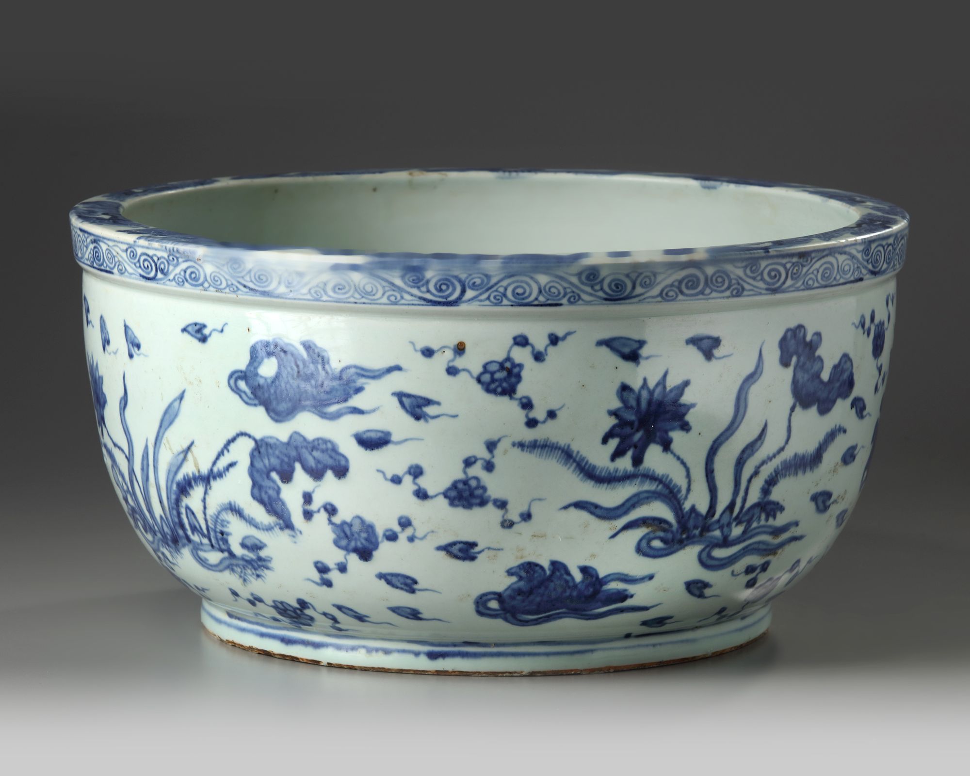 The impressive basin is decorated to the body in various shades of cobalt blue with mandarin ducks swimming amongst lotus leaves, lotus flowers, and sea weed, all below a scroll band to the rim.