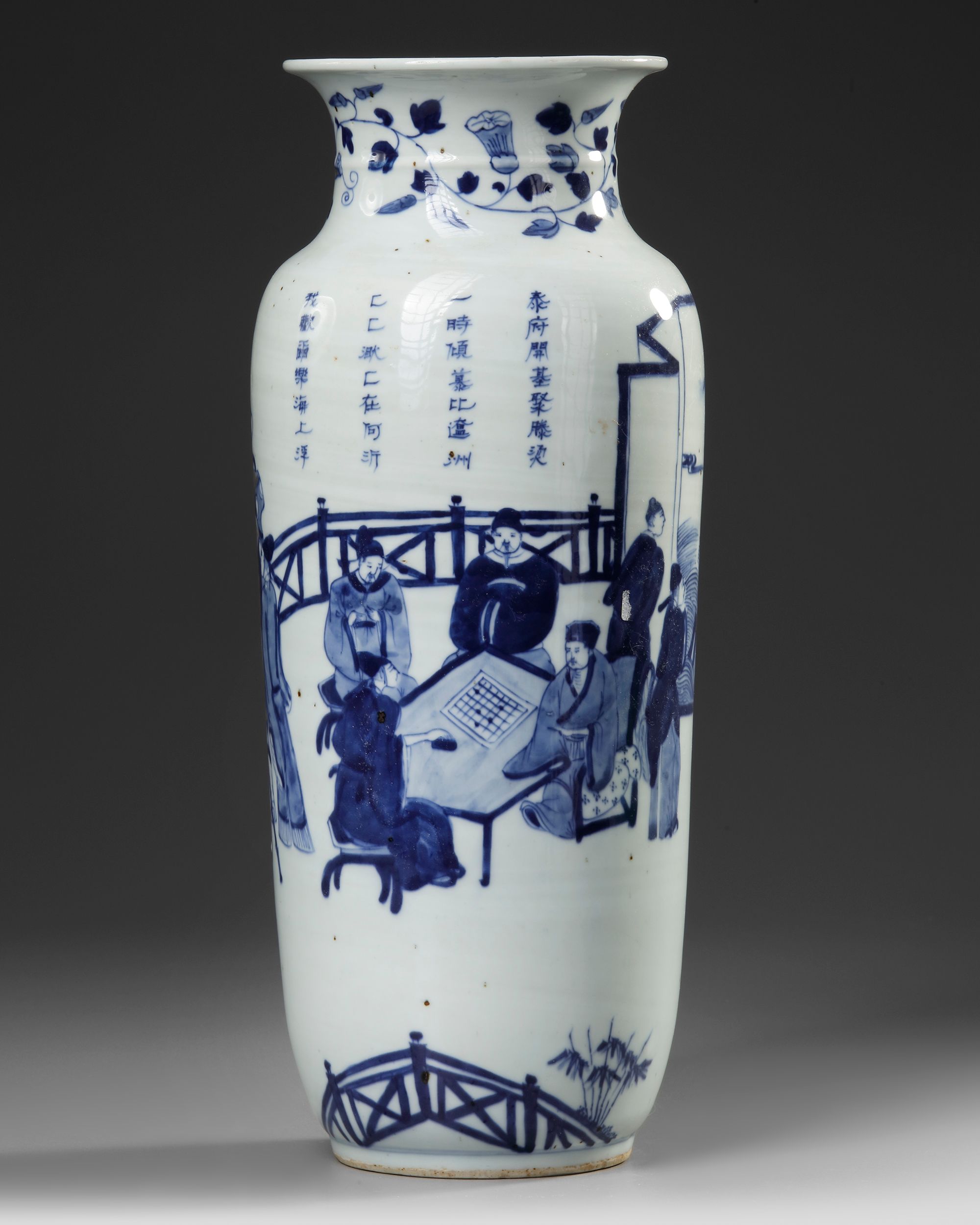 The vase is decorated with two scenes of scholars playing chess, other figures looking at a screen in a fenced garden with a Chinese calligraphy.