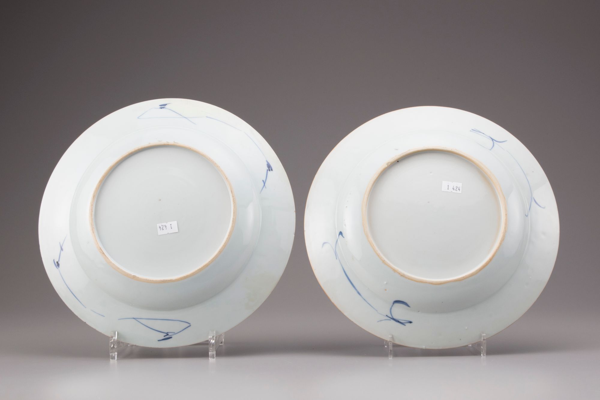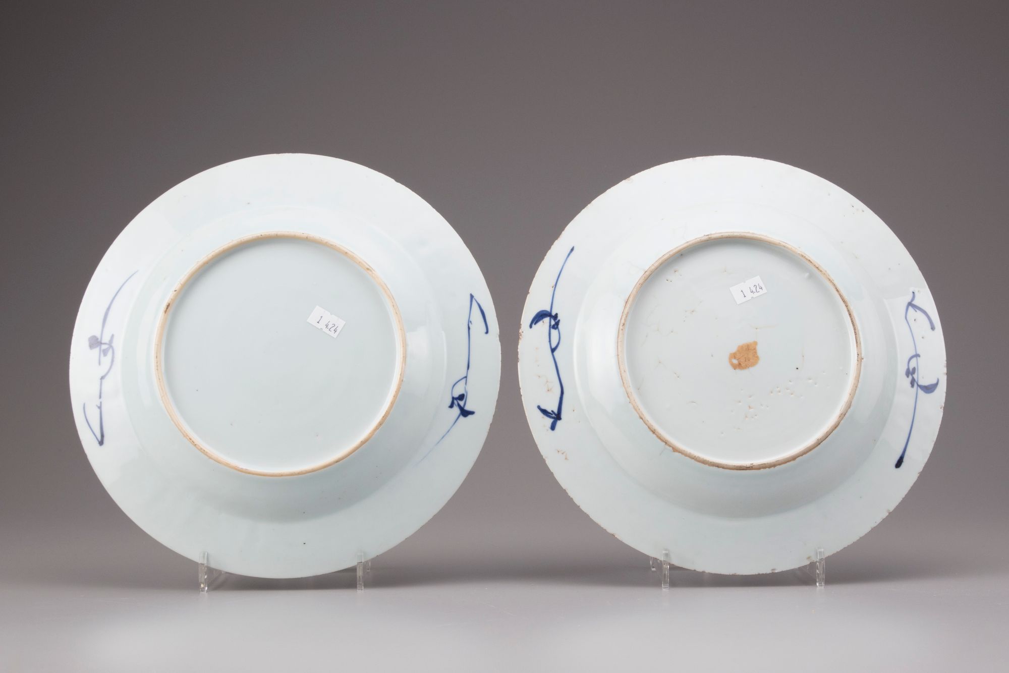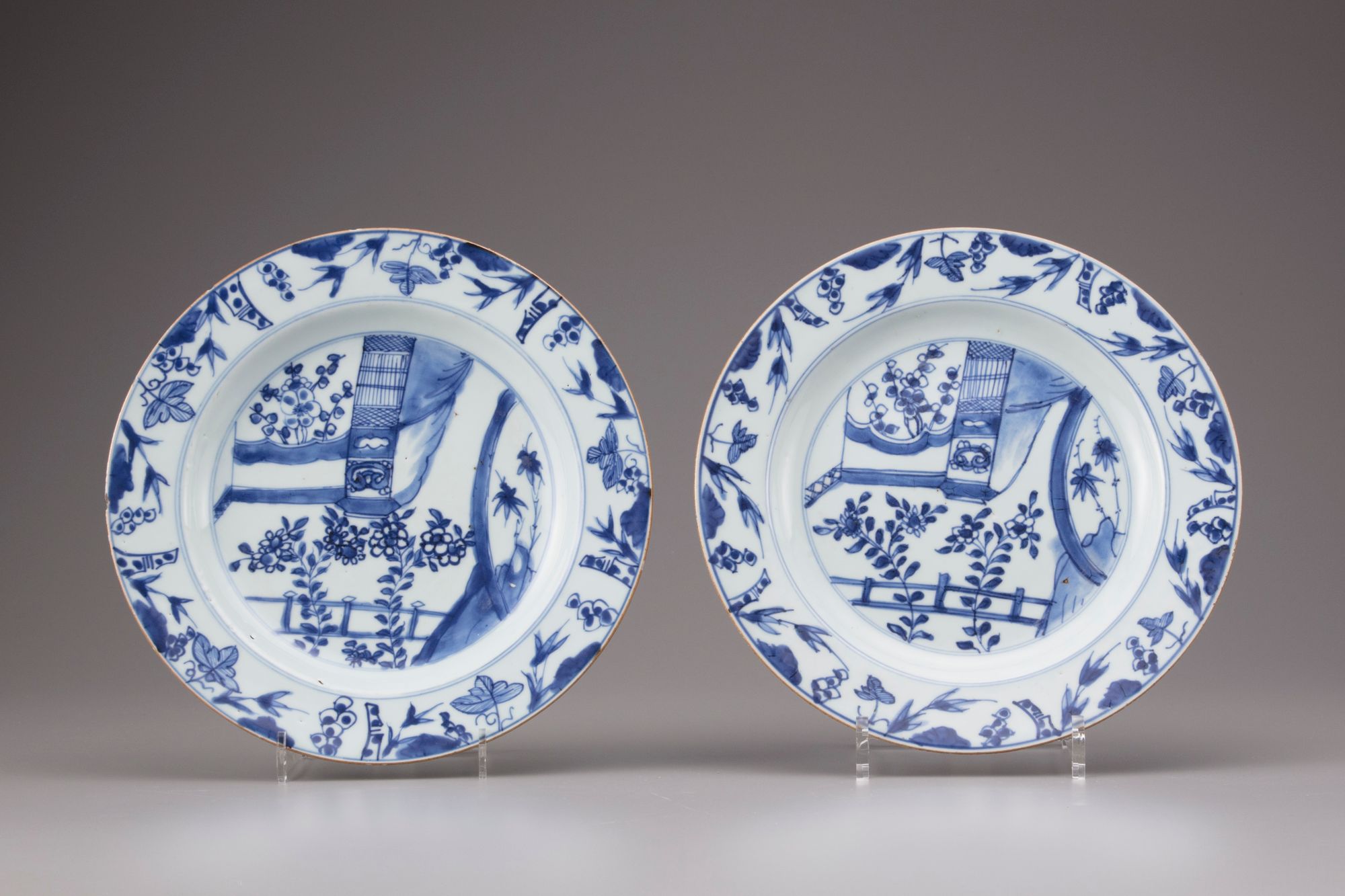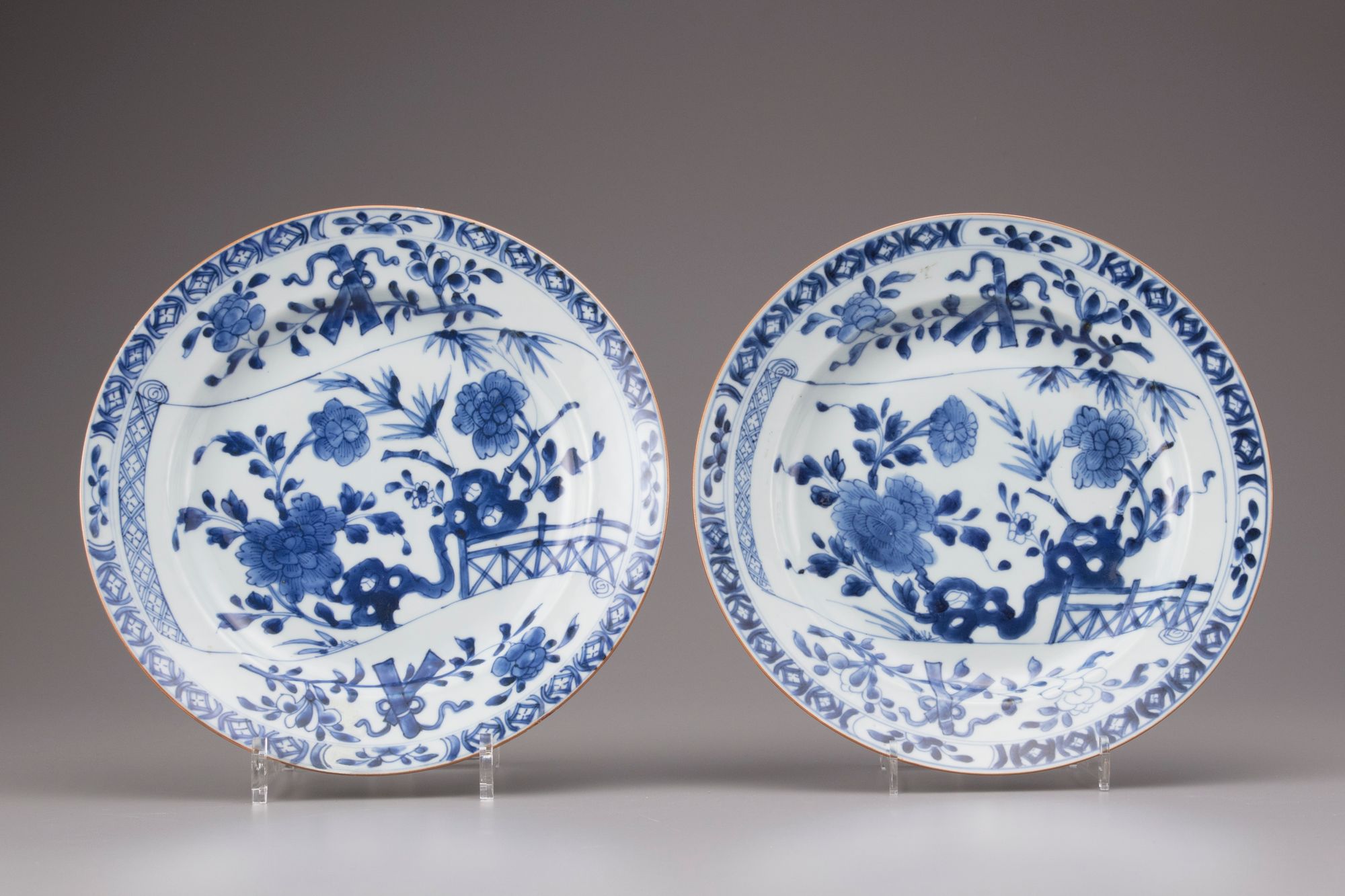 Decorated in underglaze blue with a fenced terrace with peony, prunes and bamboo, the rim decorated with grapes and bamboo. Two plates of different design.