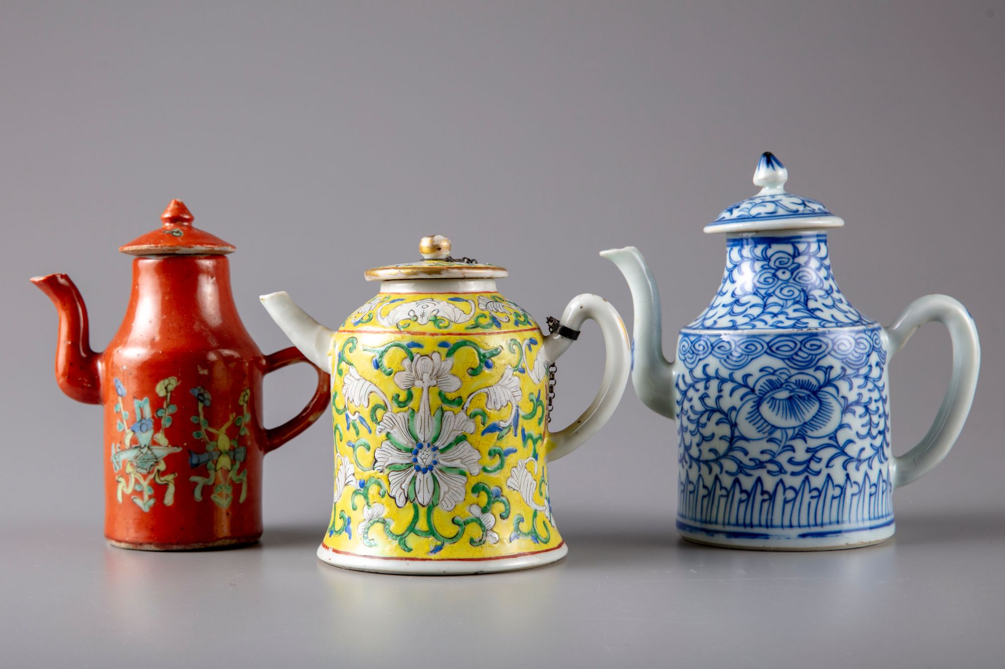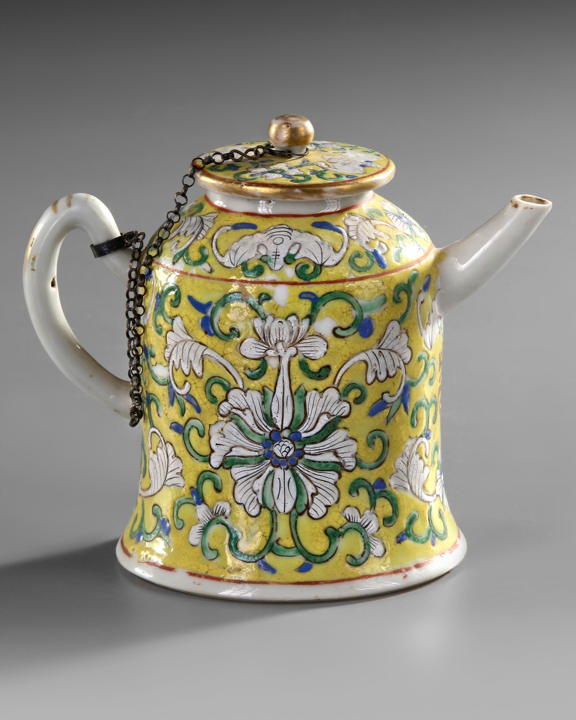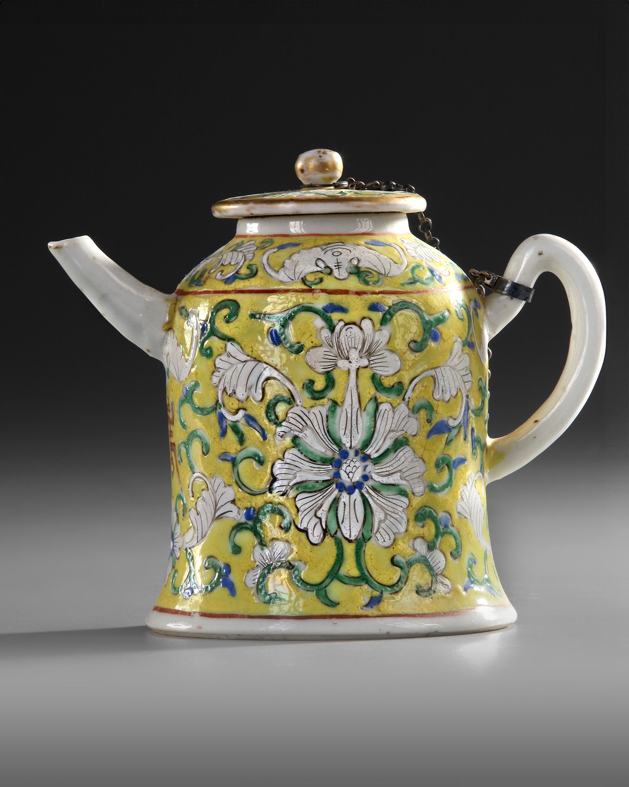 The yellow ground teapot is dcorated with lotus scrolls and fu bats. 12 cm.