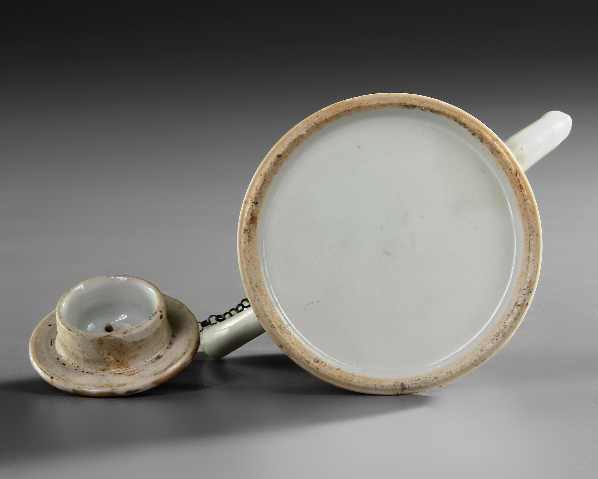 The blue and white teapot is decorated with flower heads and foliage scrolls, 14 cm.