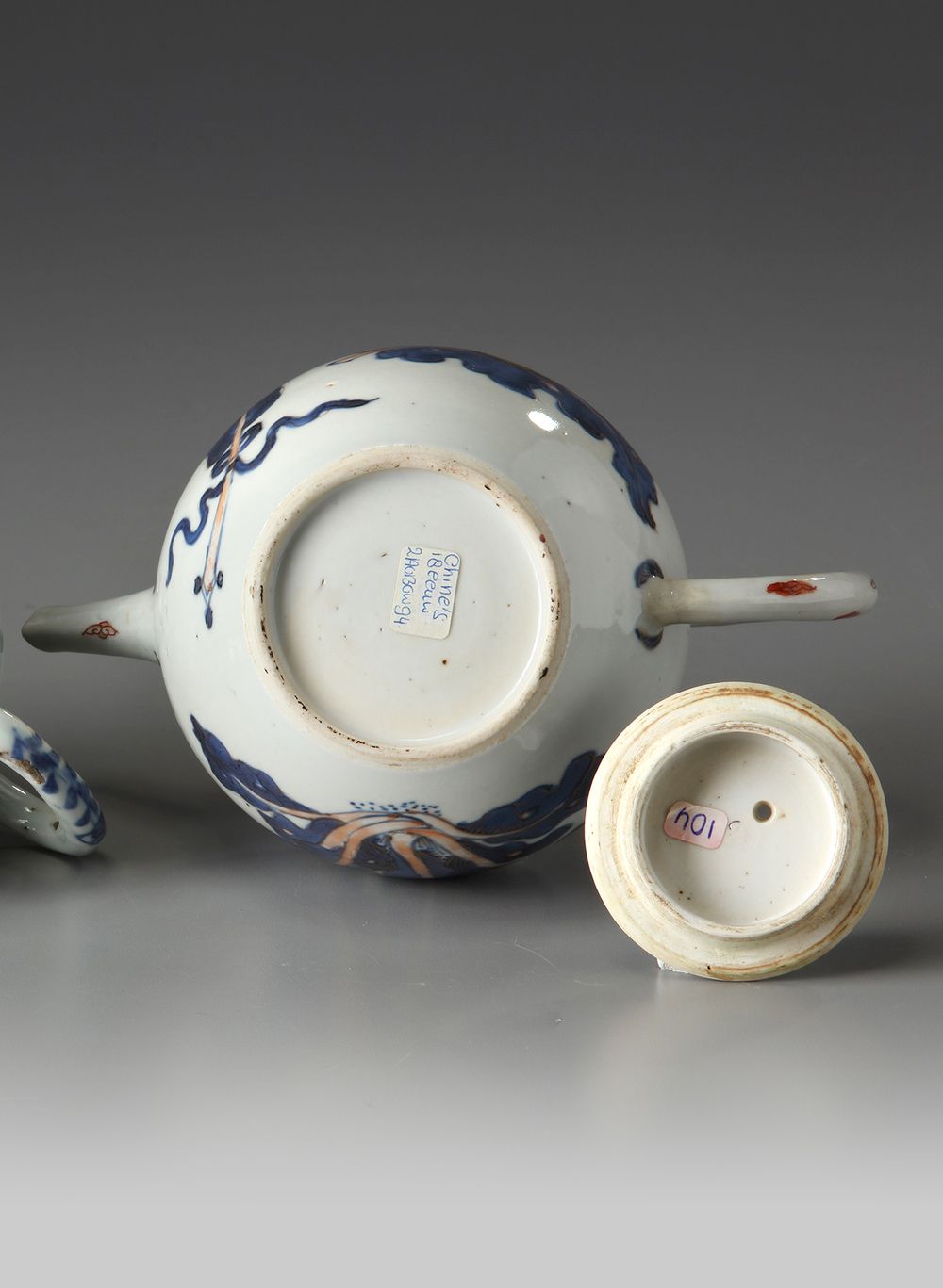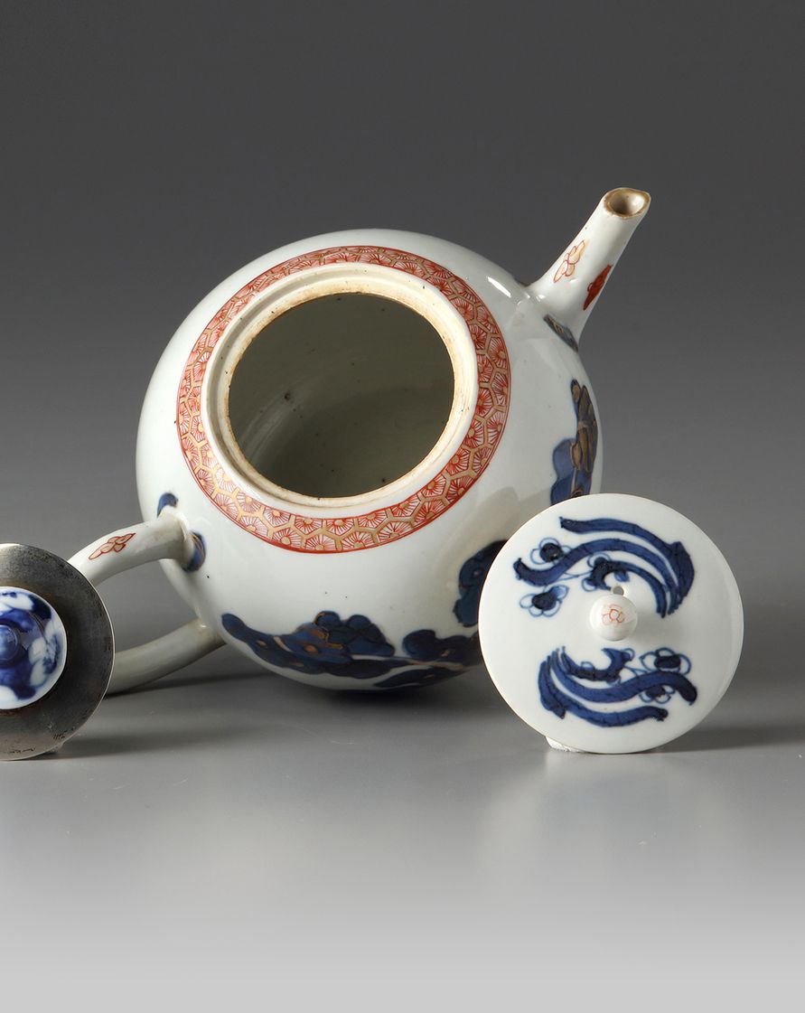 A globular Chinese imari teapot and cover decorated with a cabbage, a fan, and a censer and vase on a leaf, the shoulder is decorated with a honeycomb band, the cover is decorated with flower sprays.