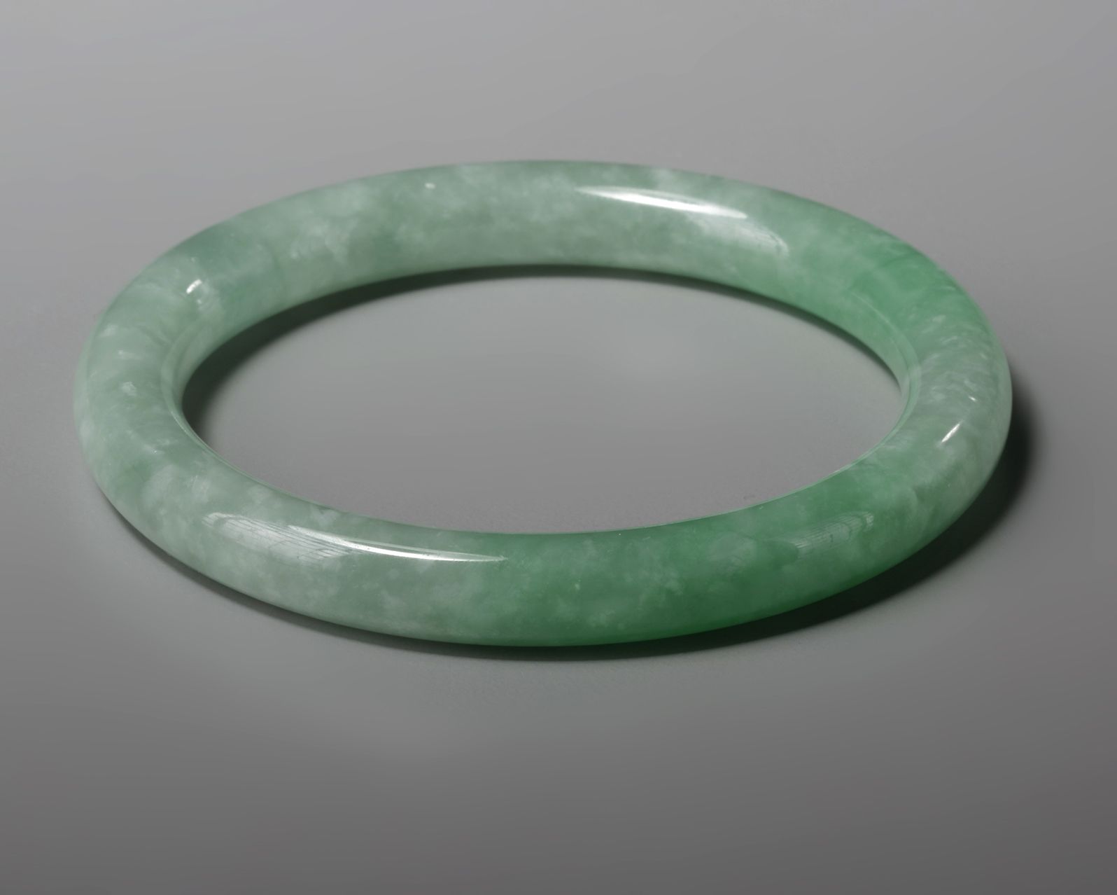 The circular bangle is carved from a pale stone with apple green inclusions.