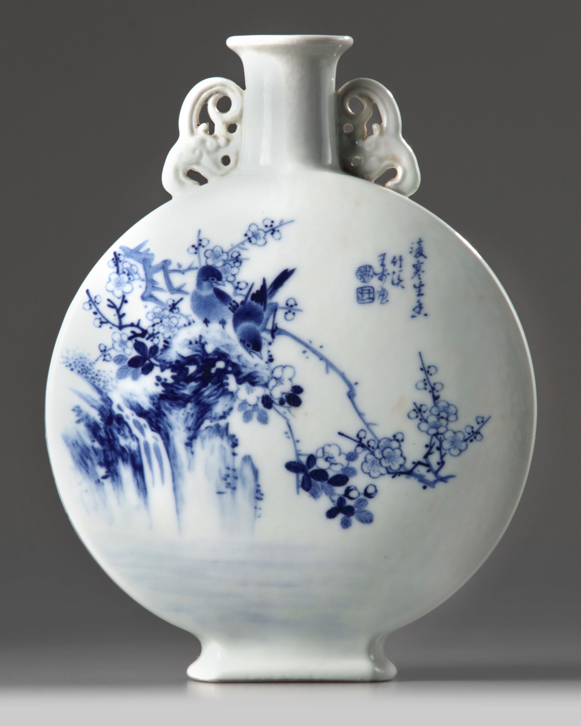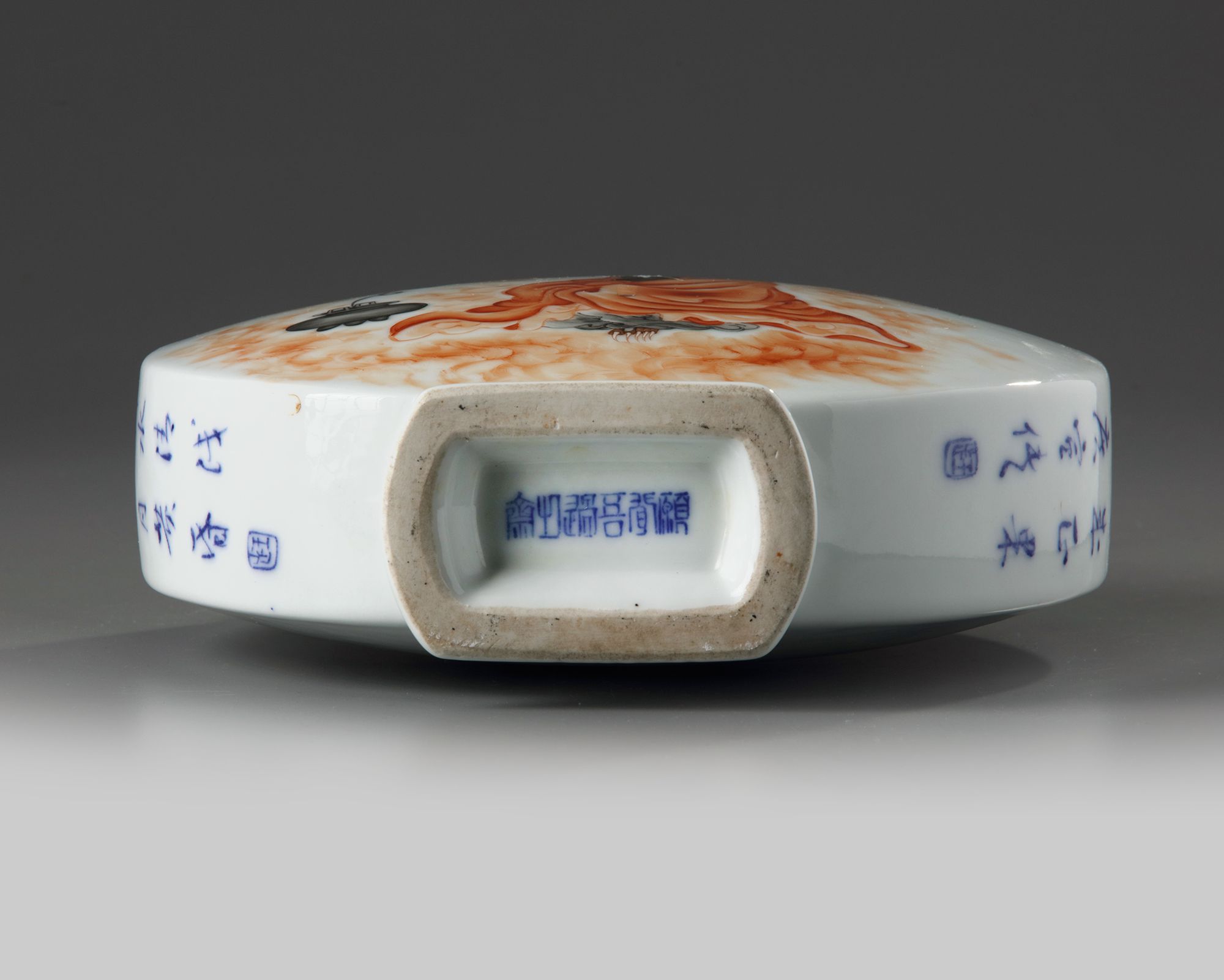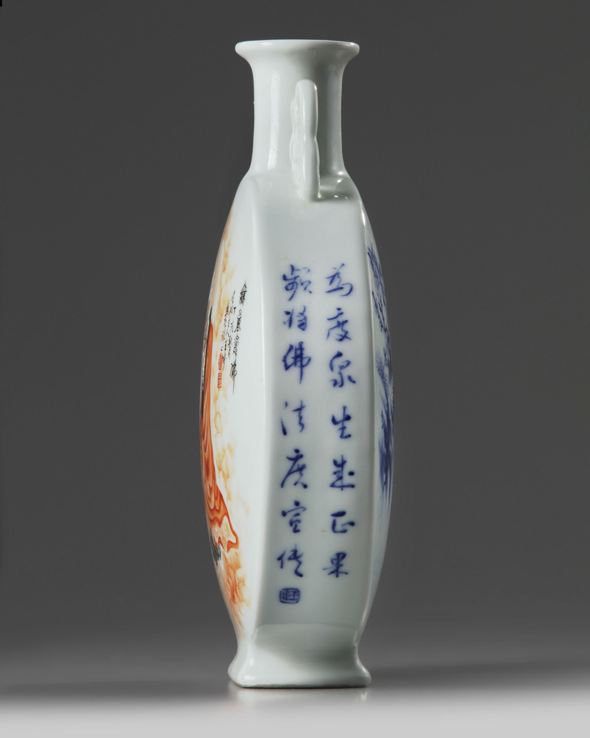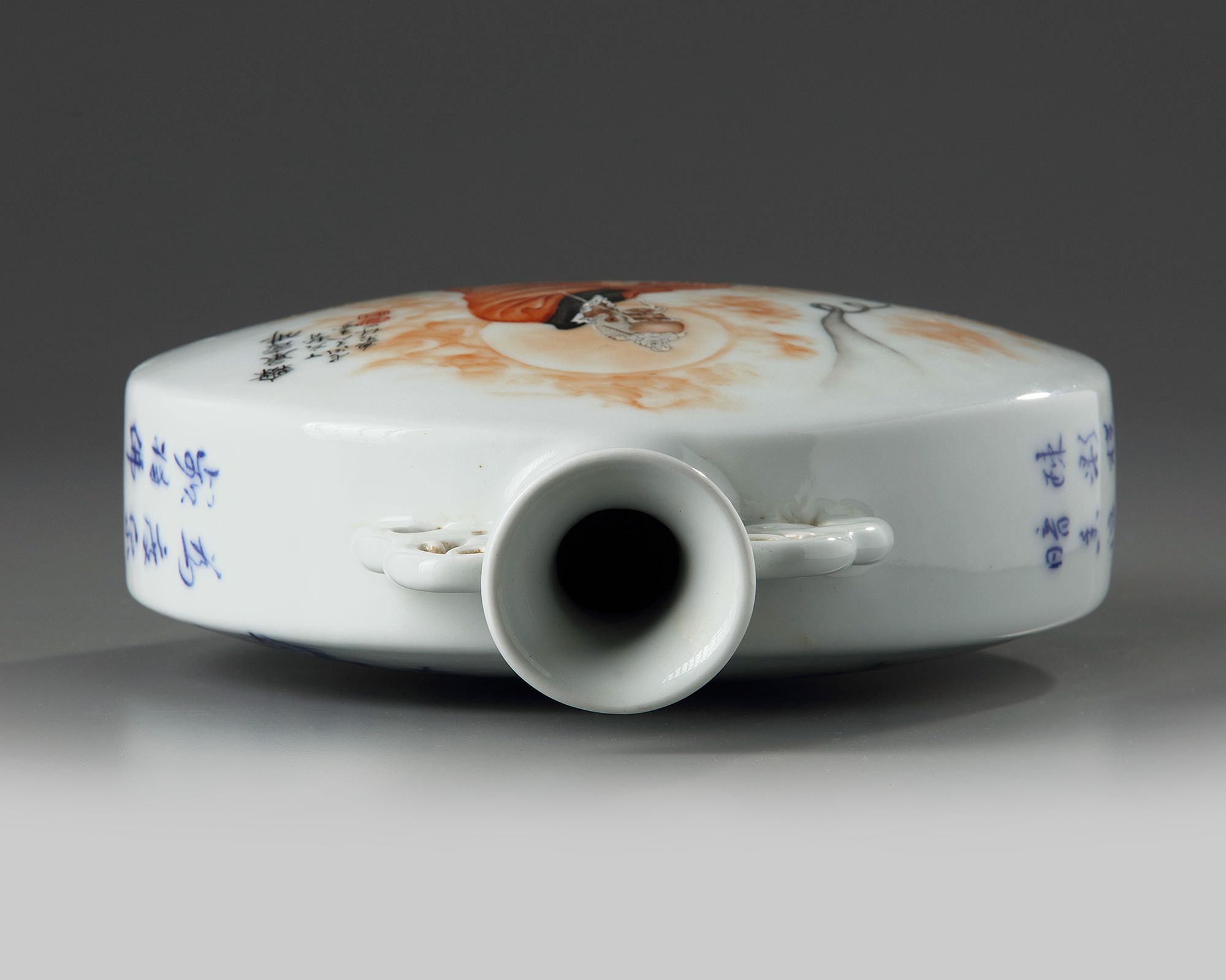 The flattened vase is decorated with two shaped openwork handles at the shoulder and neck. One side is decorated in iron red and en grisaille enamels with a Luohan seated in front of a censer, the scene is inscribed and dated dingxu year and with the signature of Wang Bu. The other side is decorated with two birds on a prunus branch, the scene is inscribed with the signature of Wang Bu. The base is marked with a six-character 'yuan wen wu guo zhi zhai' seal mark.