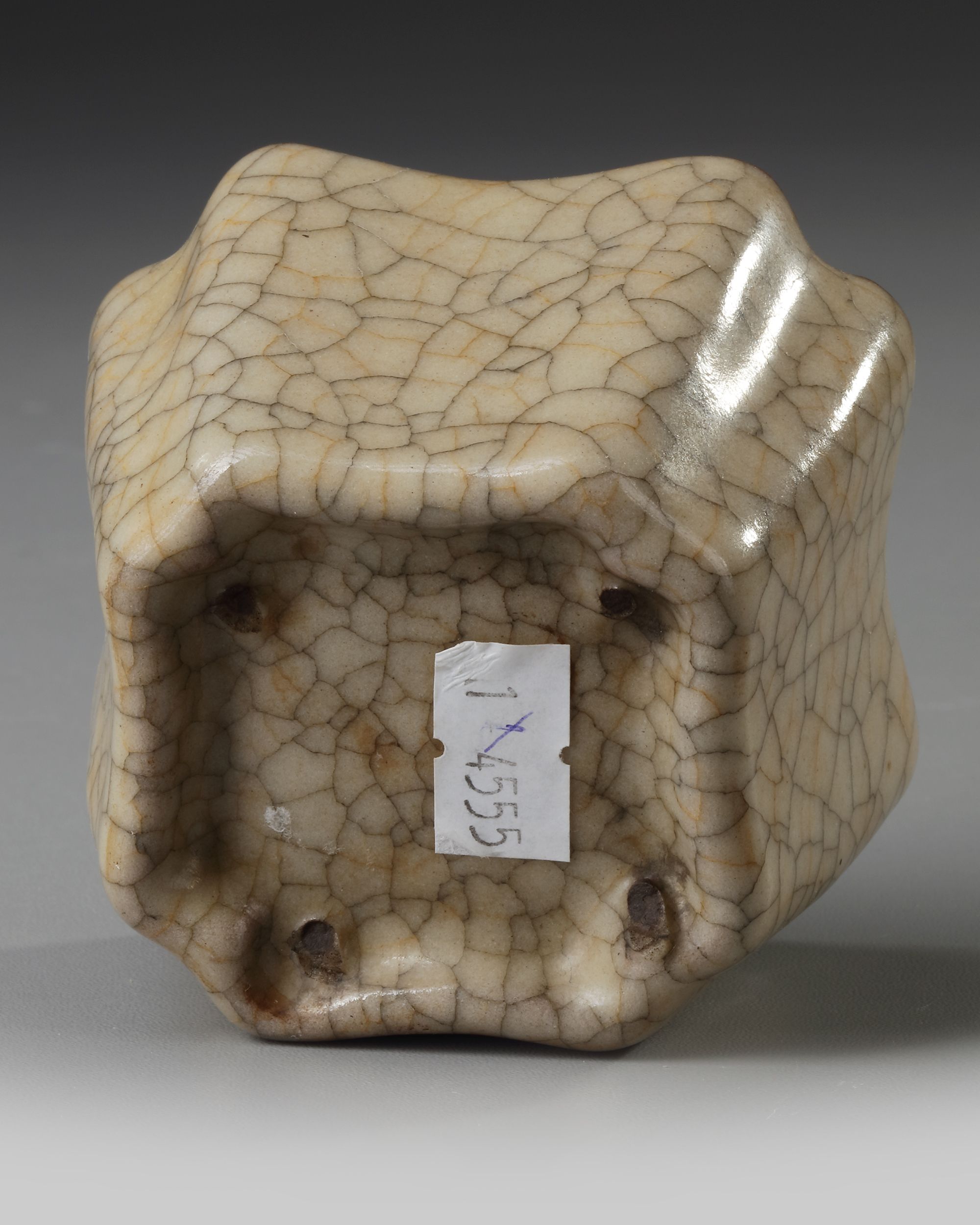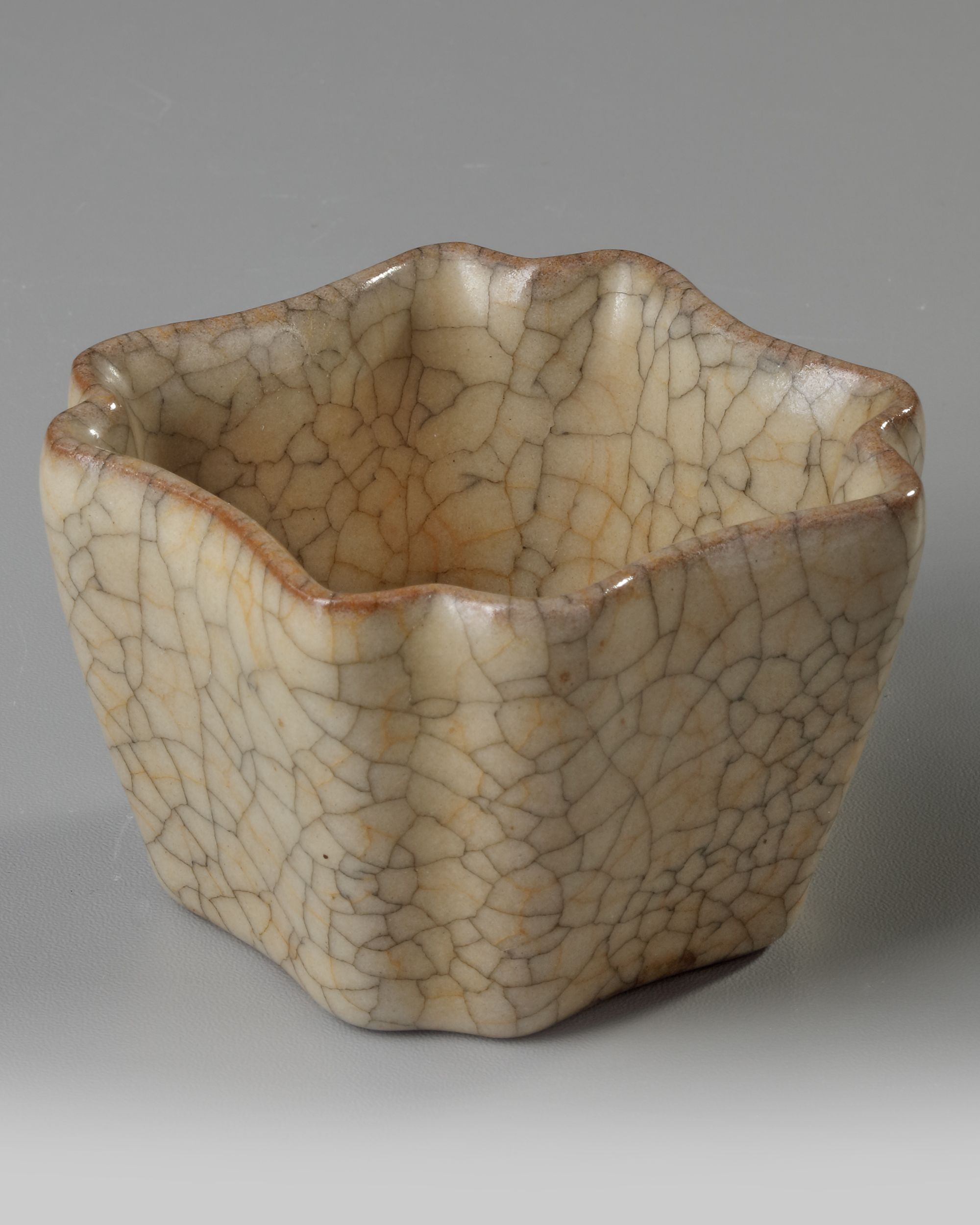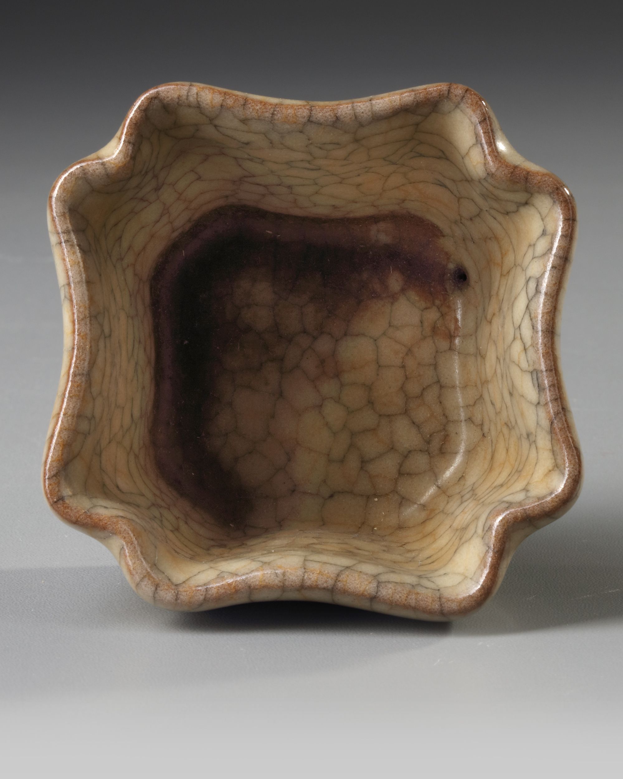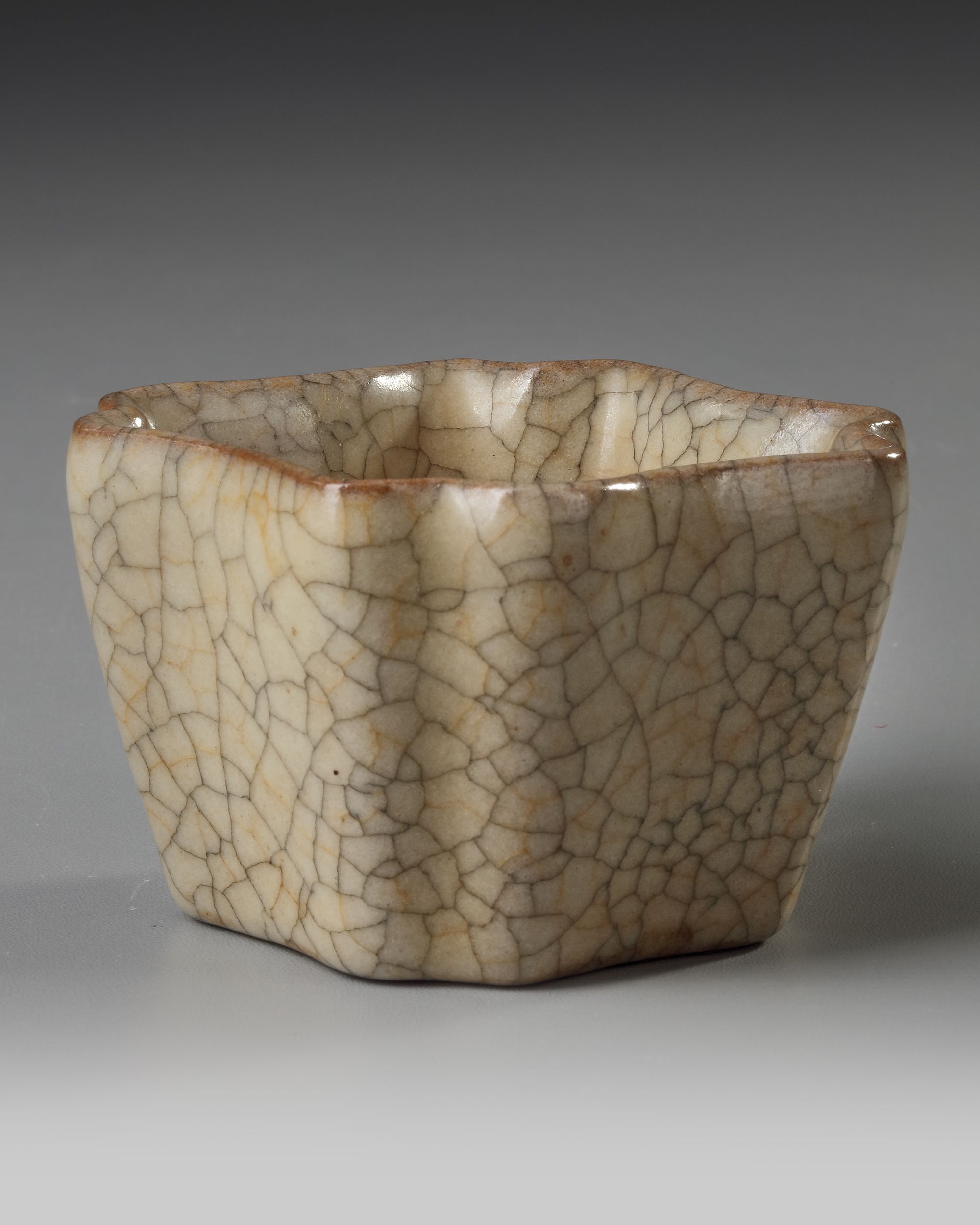 The square-section cup is modelled with canted corners and slightly flaring concave walls. It is covered overall with a beige glaze suffused with darker and golden crackles.