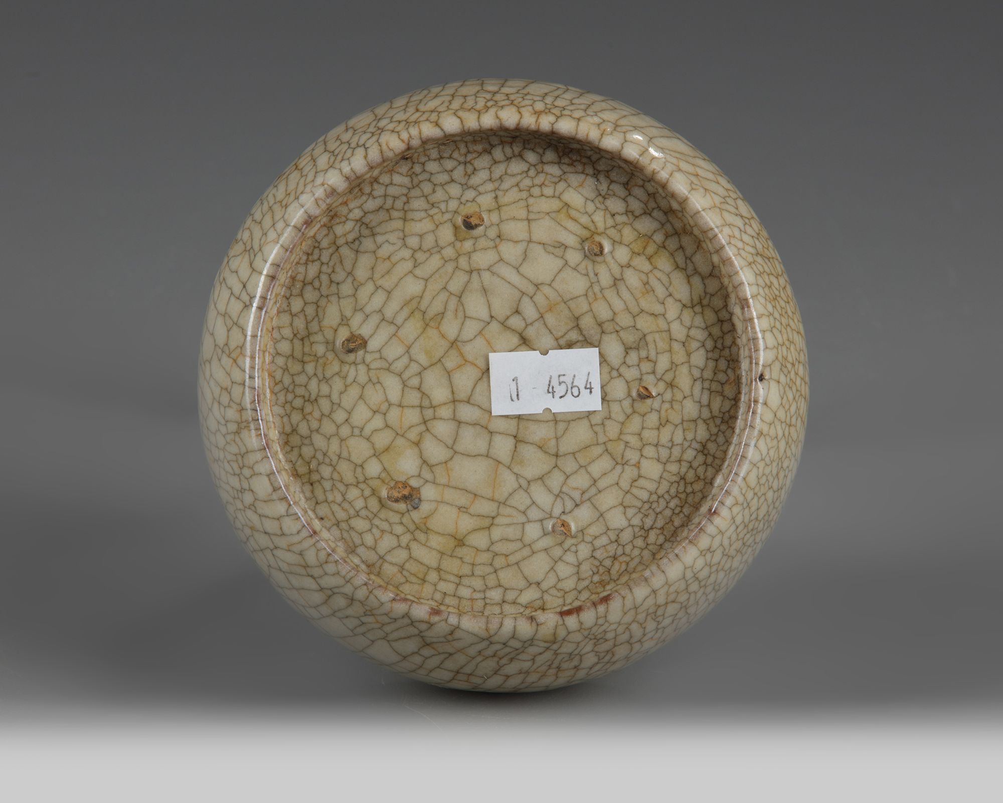 The washer is crafted with a slightly incurved walls and with six notches at the rim. The washer is covered overall with a beige glazed suffused with dark crackles.