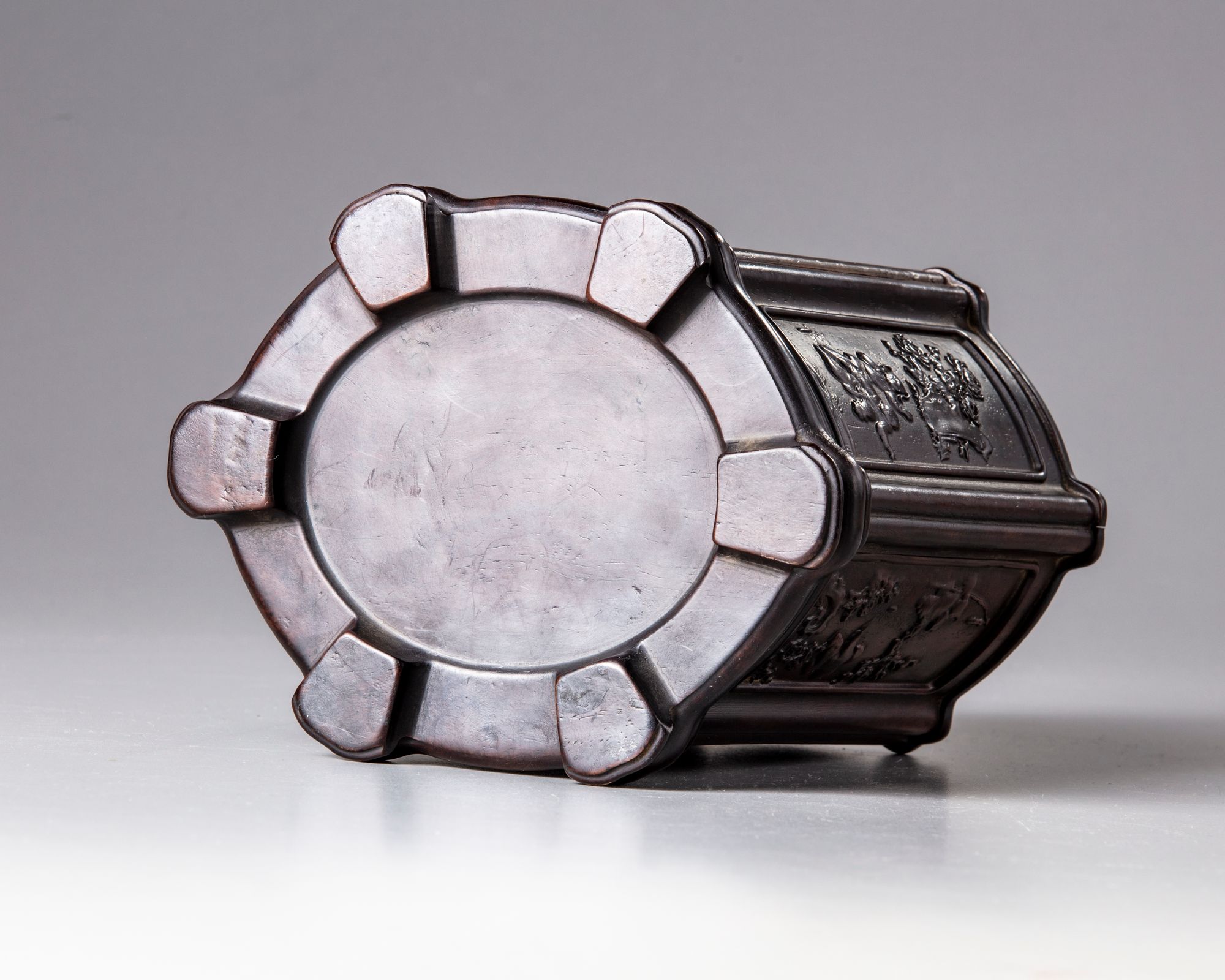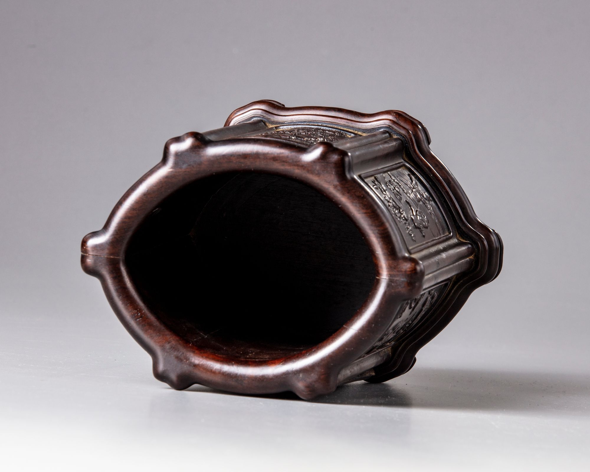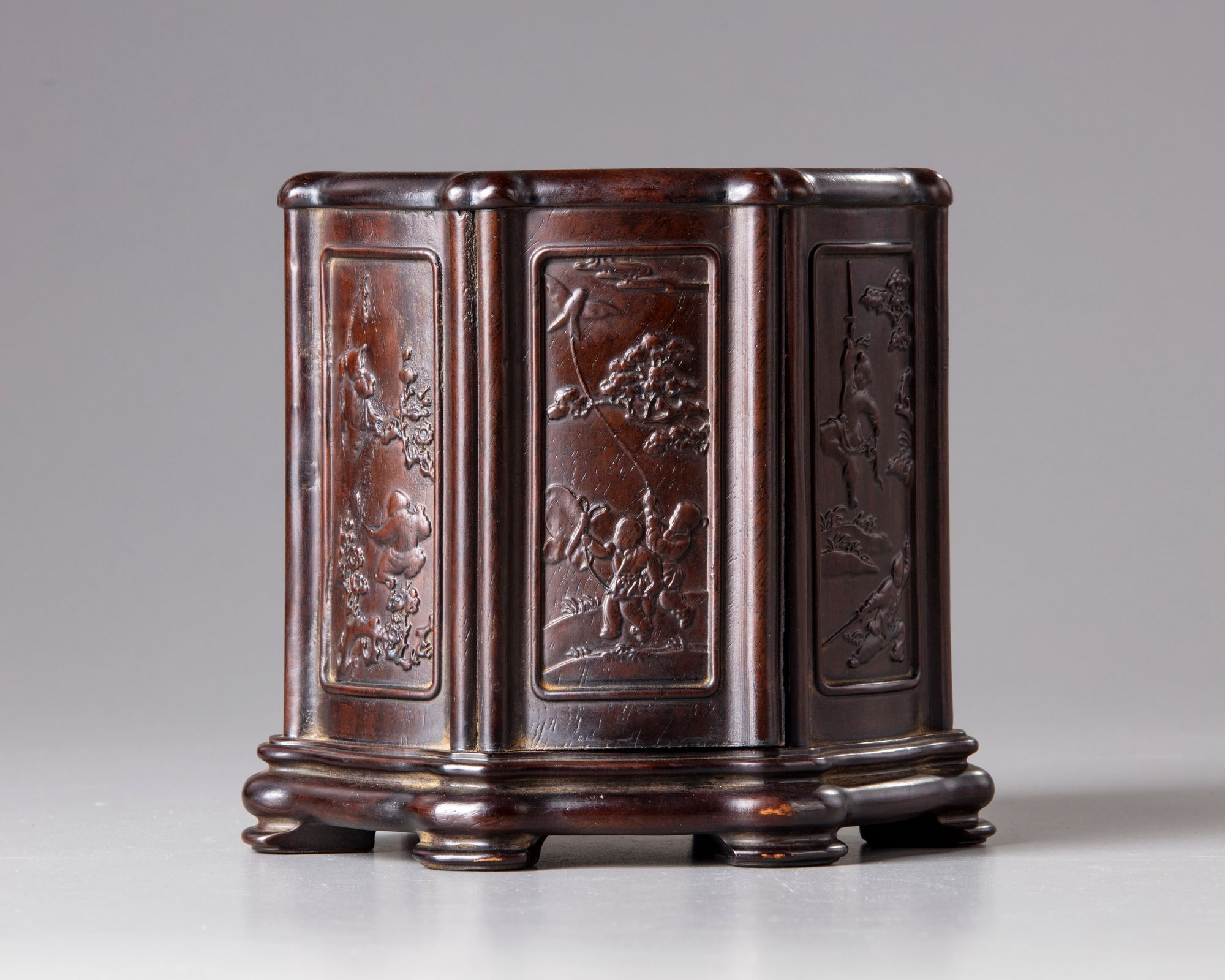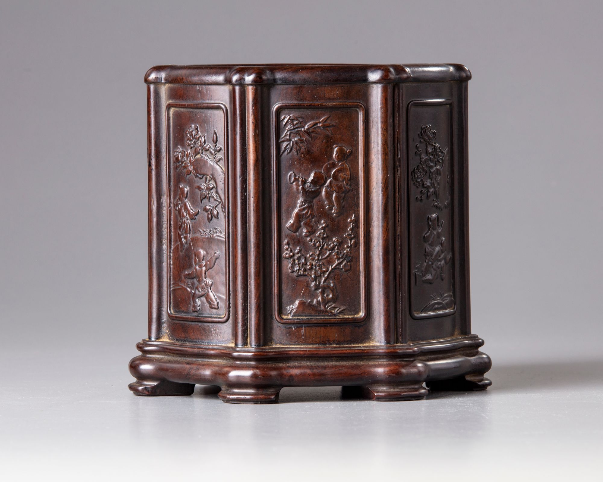The hexagonal brush pot is carved on each side a panel enclosing children at play under trees. Height: 10 cm.