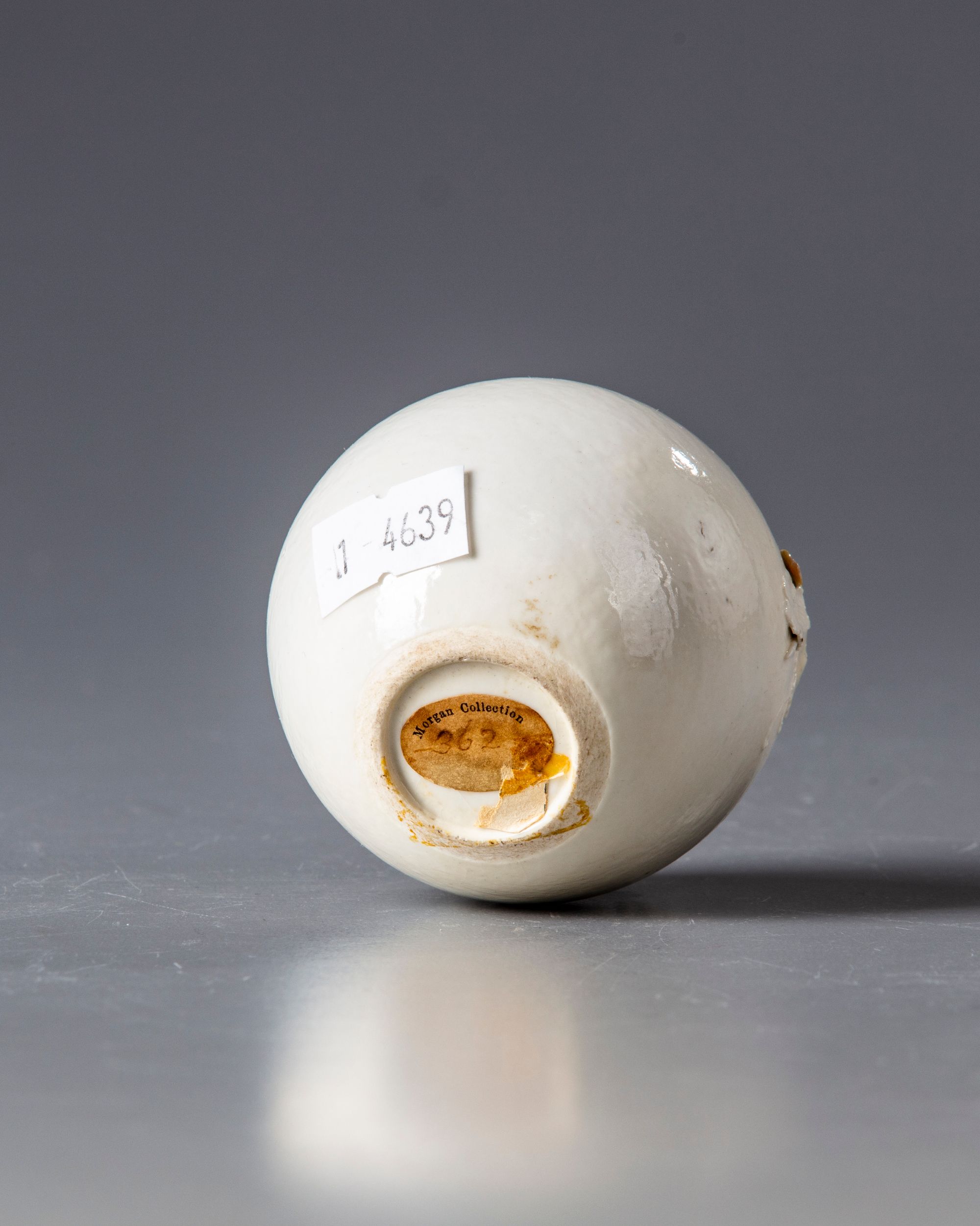 The finely potted globular vessel is decorated with and applique design to the upper body of squirrels clambering upon leafy grape vines.