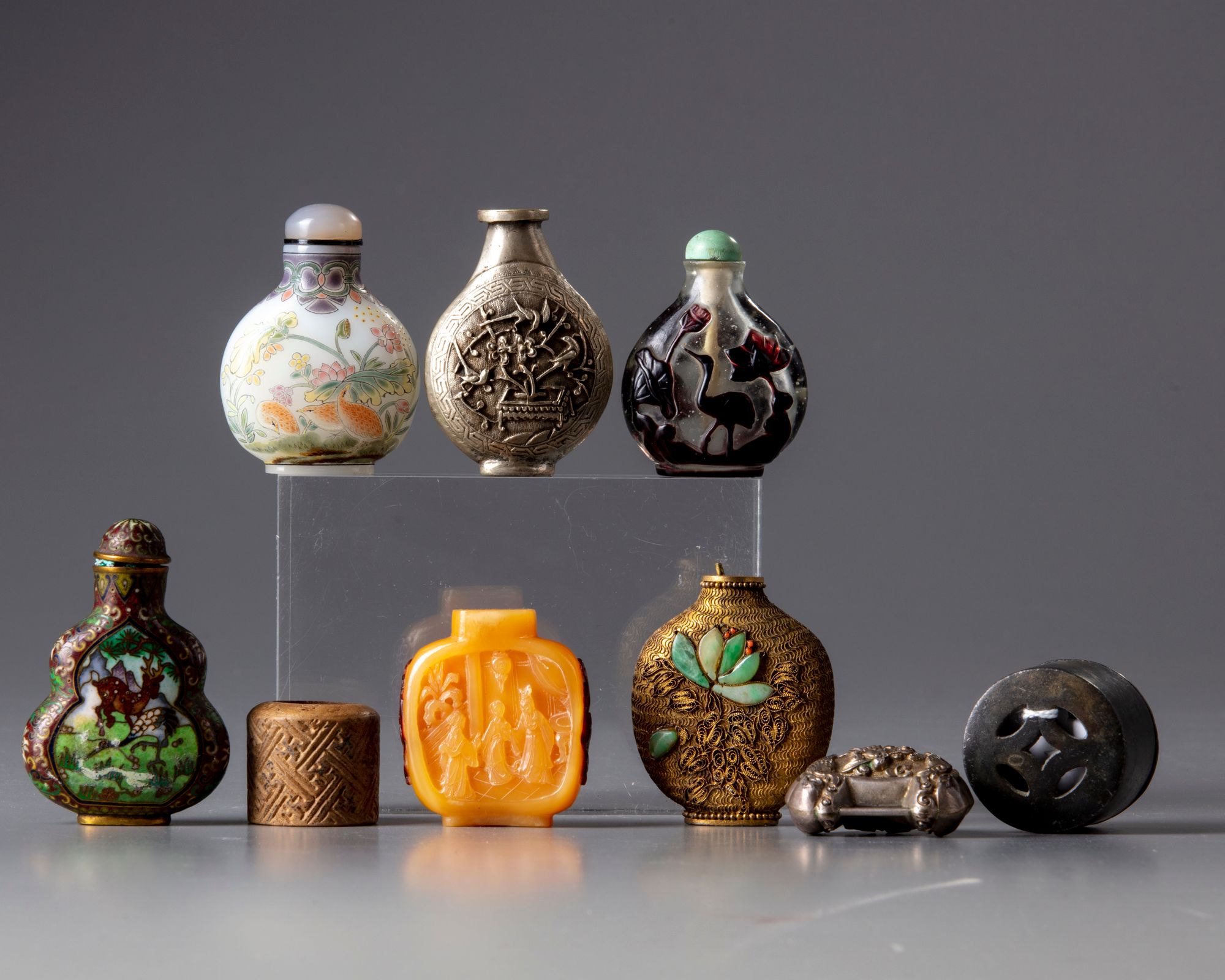 The group comprises: a enamelled glass snuff bottle decorated with birds and flowers, the base with an apocryphal Qianlong mark; a red glass overlay snuff bottle carved with a crane amongst lotus and pine; a shaped resin snuff bottle decorated with figures, the base with an apocryphal Daoguang mark; a cloisonné enamel double gourd snuff bottle; a hardstone-inlaid gilt filigree snuff bottle, the base with an apocryphal Qianlong mark; a white metal bird and flower snuff bottle, the base marked ‘Da Bao’; and a white metal lock-shaped pendant.
