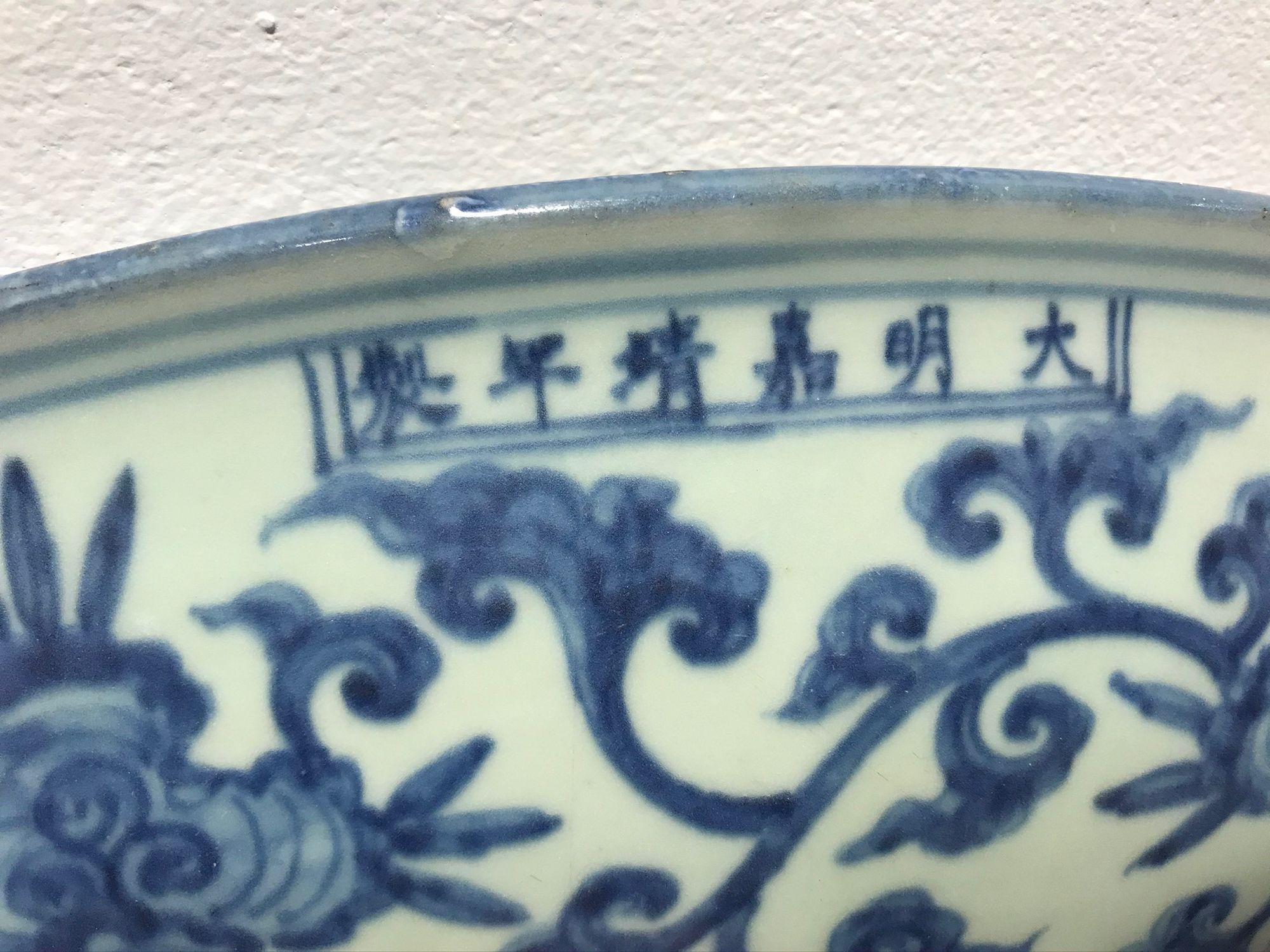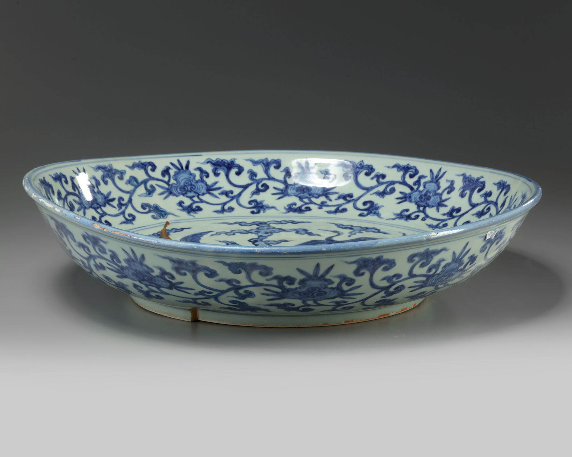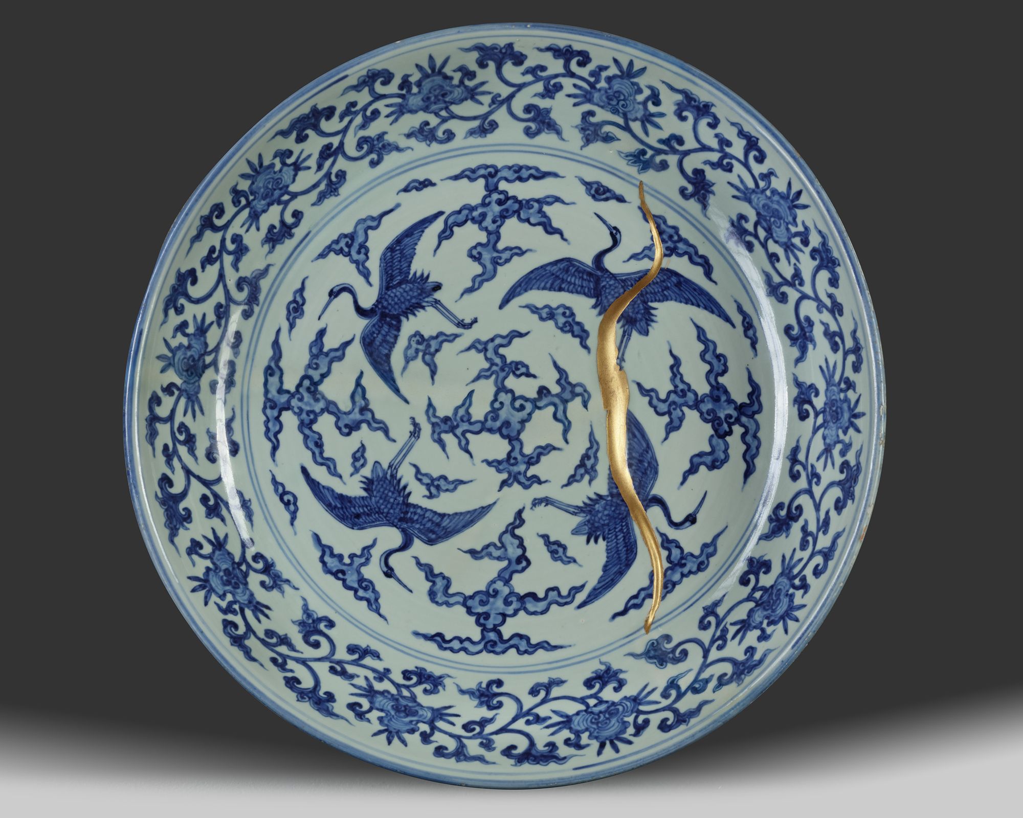 The dish is decorated to the interior with cranes in flight amongst scrolling clouds, the cavetto is decorated with a scrolling lingzhi band. The exterior is decorated with further scrolling lingzhi.