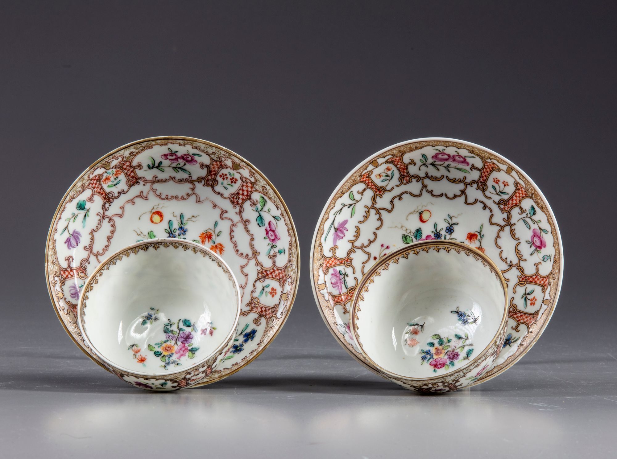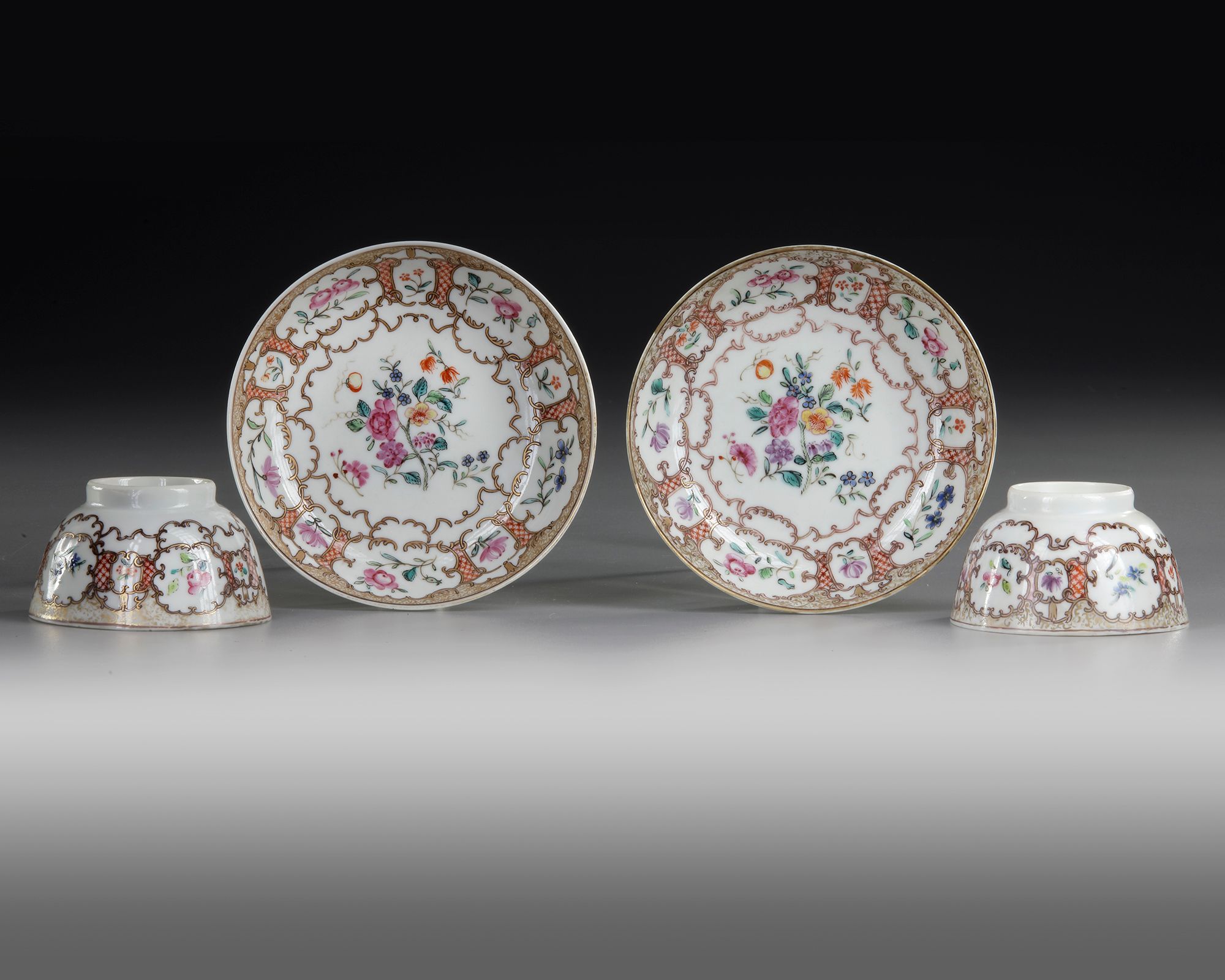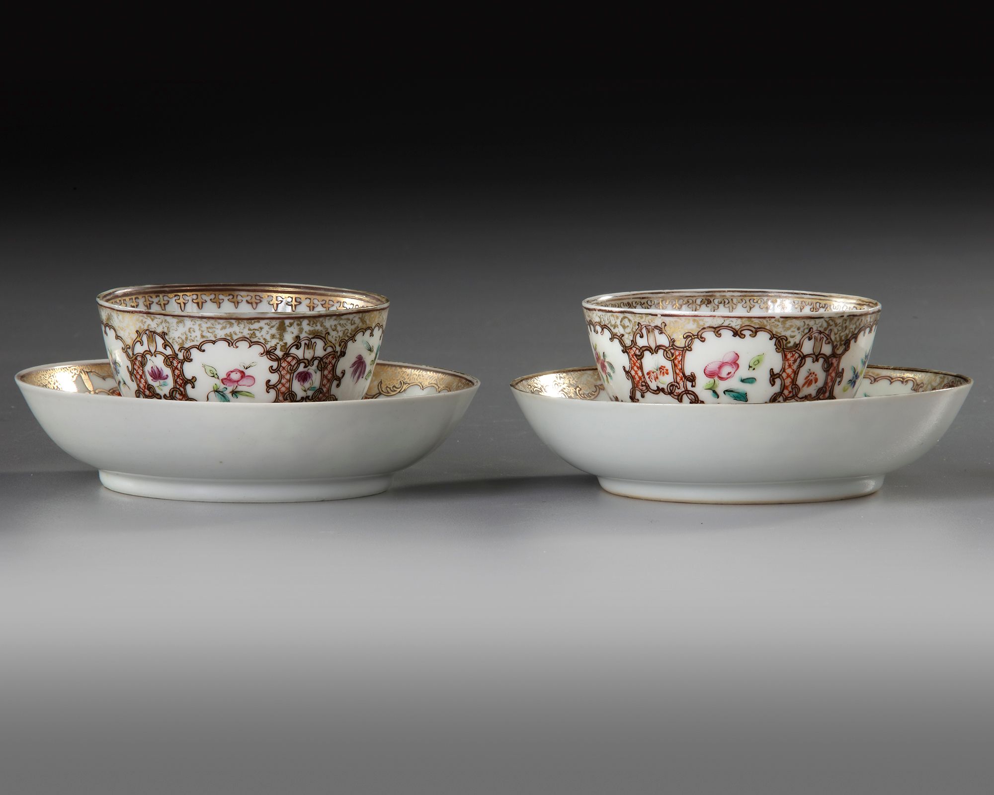 Two pairs of famille rose and gilt cups and saucers decorated with flower sprays encircled by gilt panels.
