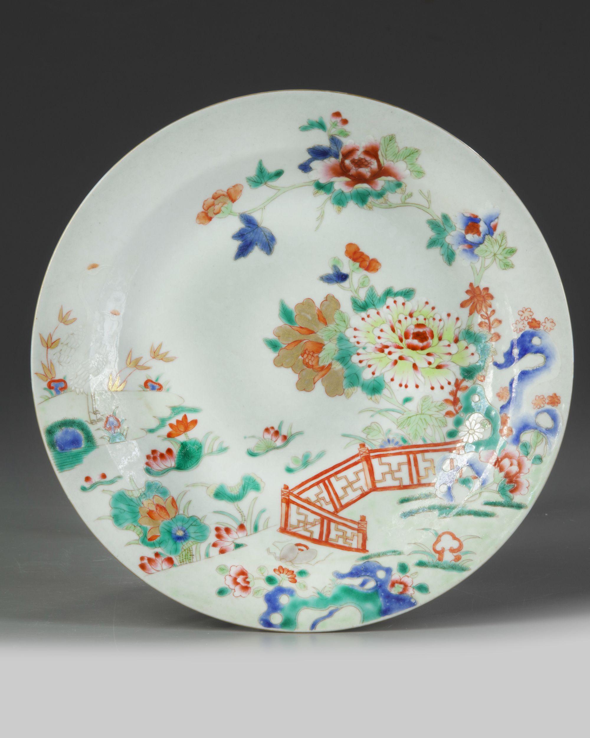 A gilt Chinese dish, decorated in famille verte enamels with chrysanthemums and lotus blossoming branches issuing from ornamental rocks in a fenced garden.