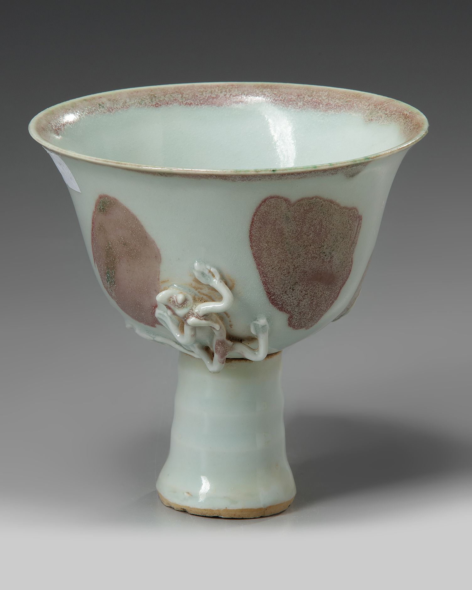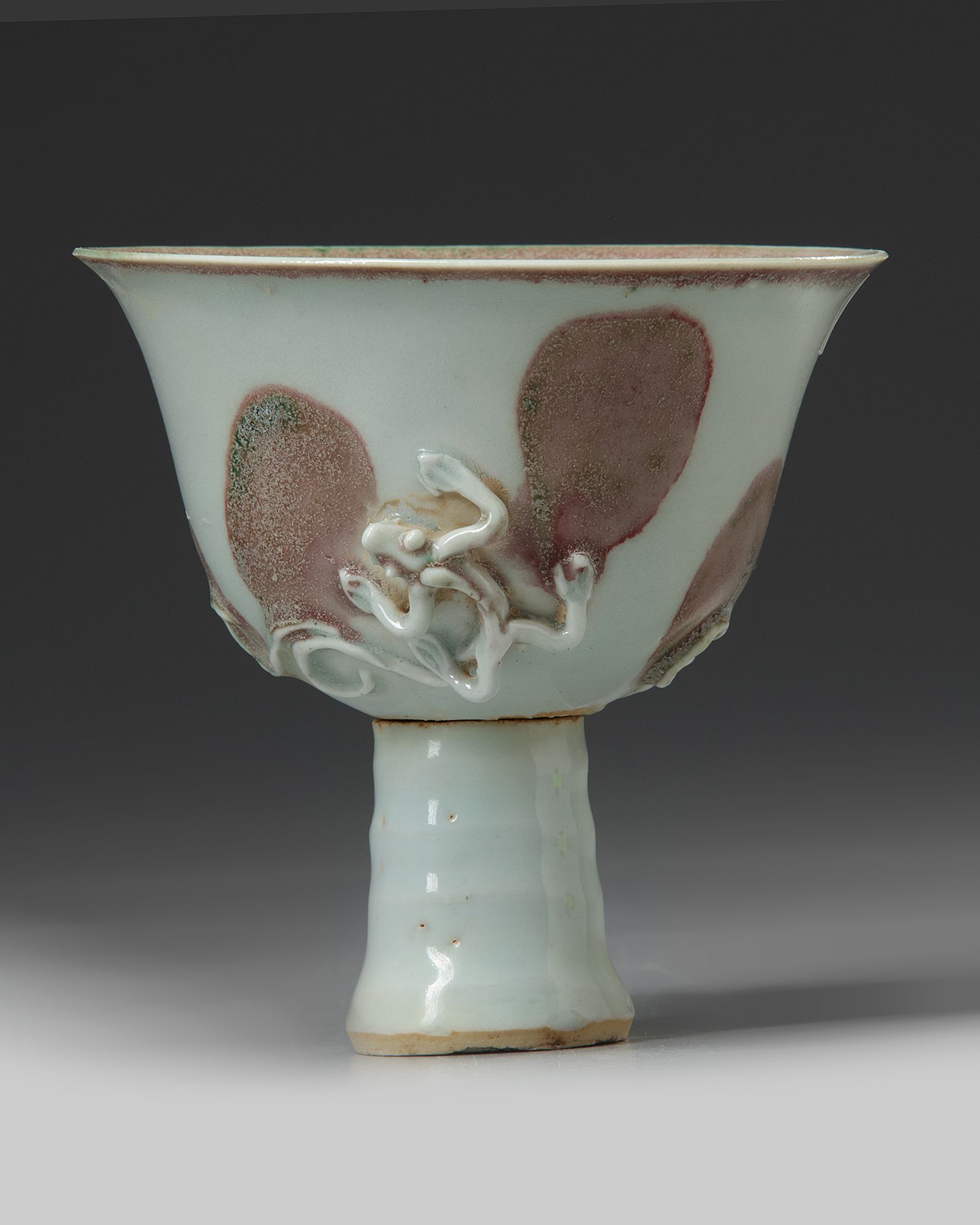 A Chinese white glazed stem cup, decorated in high relief with two chilong, with deep underglaze copper red splashes. Height 10 cm. Diam. 10.6 cm.