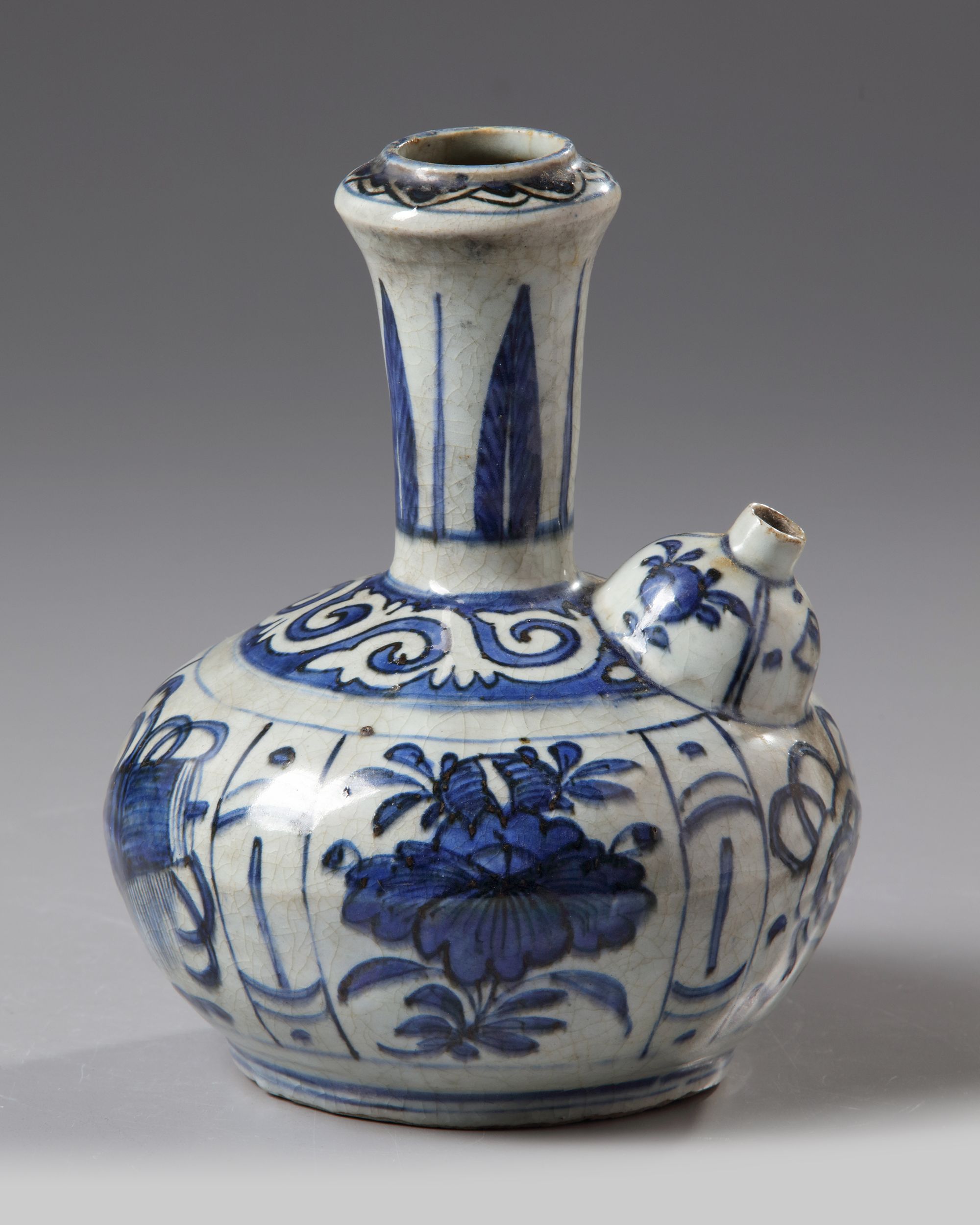 The kendi is decorated ot the body with alternating panels of precious objects and flowers, the shoulder is boldly decorated with a classic scroll band in reserve. The neck is decorated with stiff leaves.