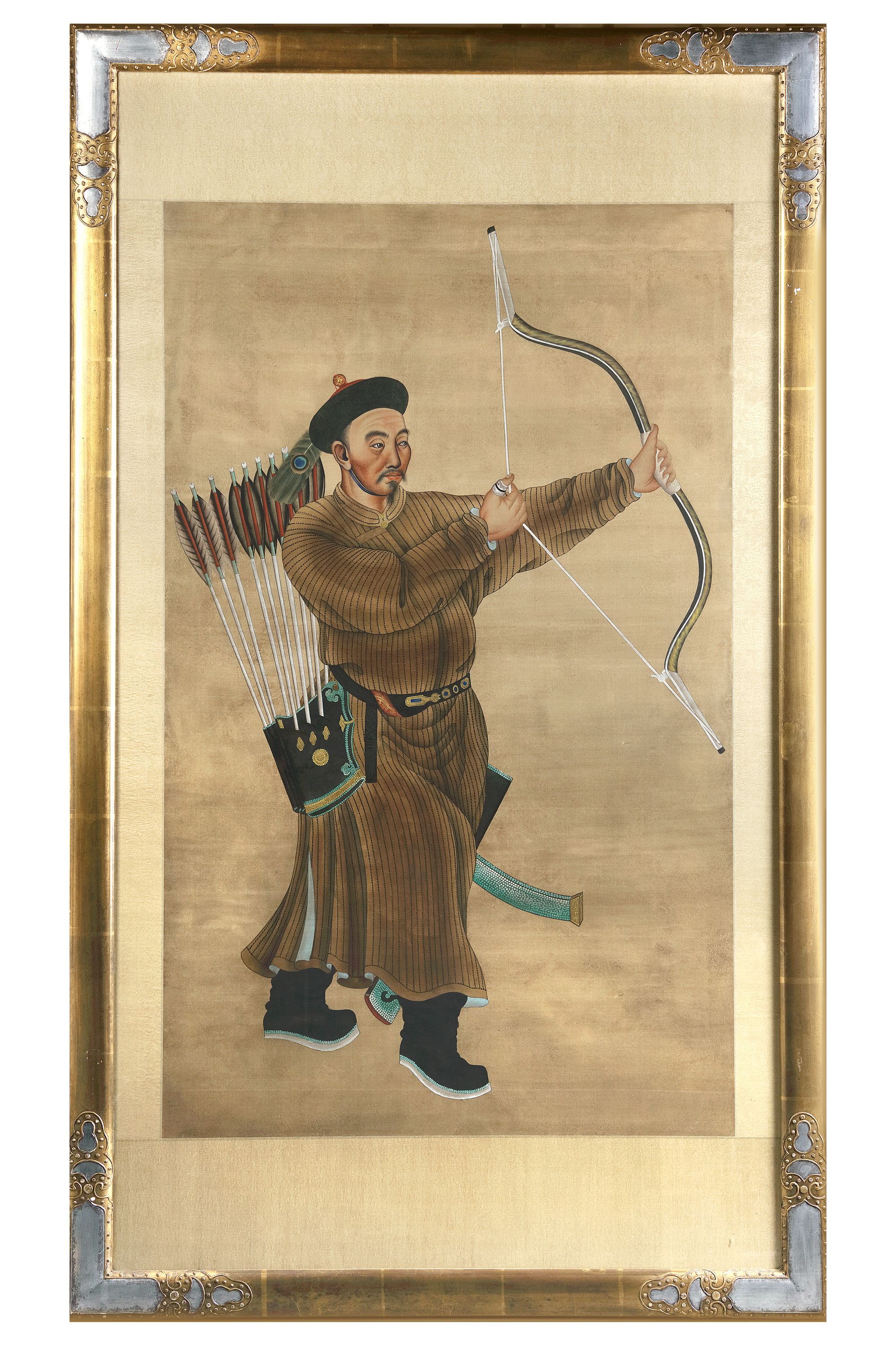 Ink and colour on silk. After an 18th century original, depicting Wu Fu, Brigadier General of the Gansu Region, in brown robes checking the alignment of his bow, with a quiver and a sword at the belt.