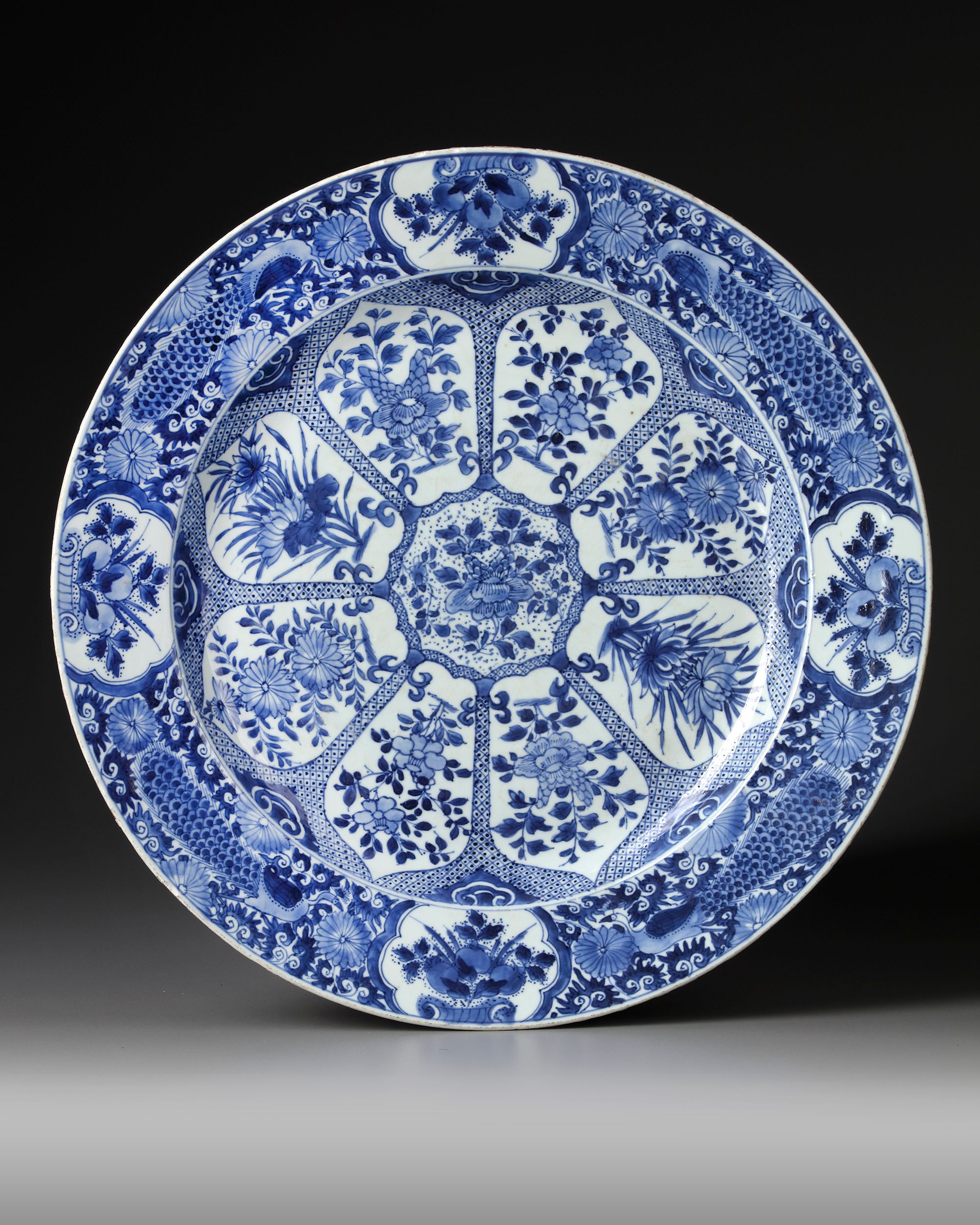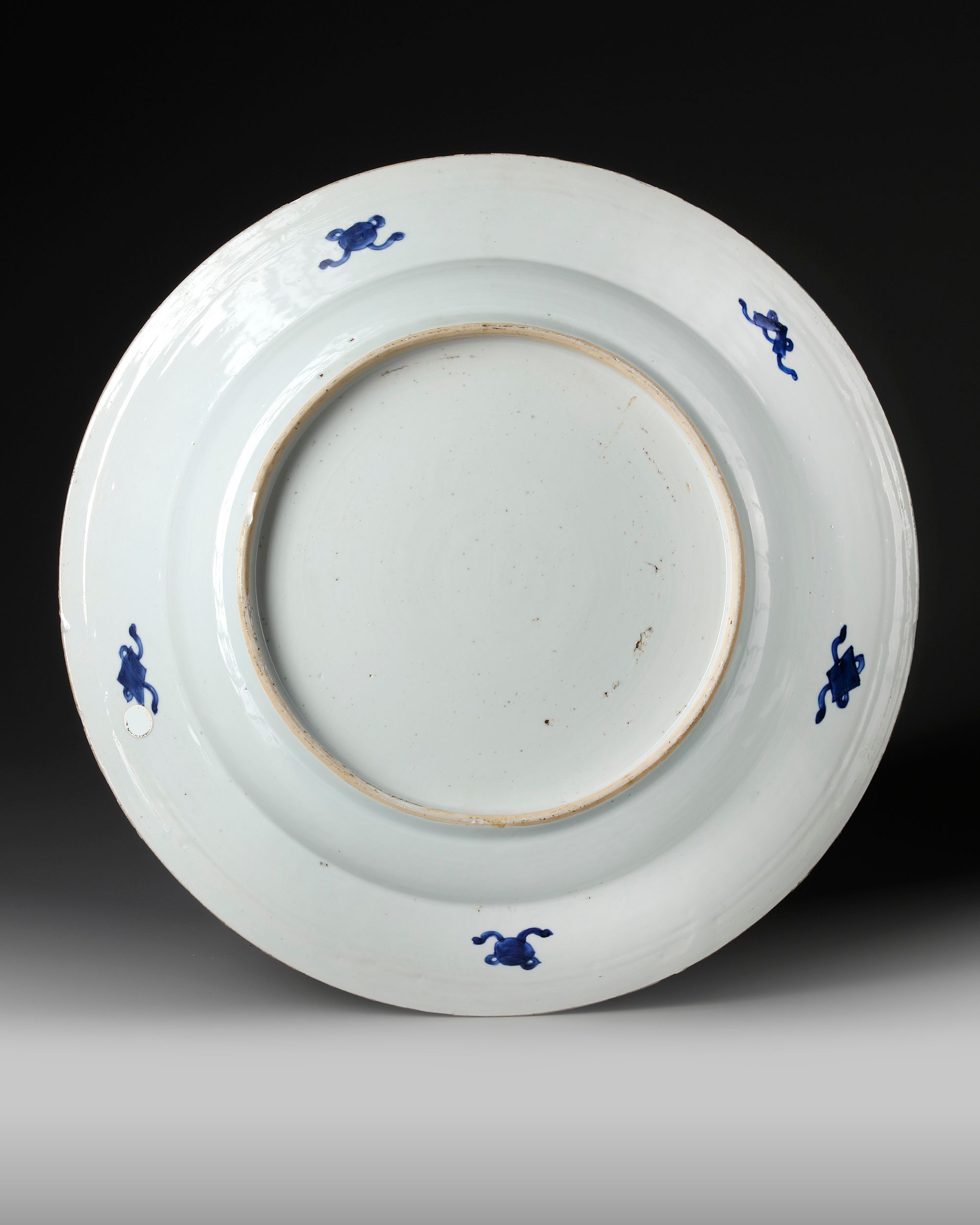 Massive chargers in this classic pattern were a favorite of Chinese porcelain collectors worldwide. Examples from the royal collection at Dresden sold Christie's London, 19 May 2005; others are in James Whistler's famed Peacock Room, now at the Freer Gallery, Washington DC; another, also with fungus mark, in the Topkapi Saray is illustrated by Krahl and Ayers in the Catalogue of Chinese Ceramics, Vol. III, pl. 2300. A similar charger is illustrated in R. Krahl and J. Ayers, Chinese Export Porcelain in the Museum of Topkapi Saray, Istanbul, London, 1986, vol. III, no. 2300, p. 1050. Also see the V&A Museum Collection, museum number: C.792-1910.