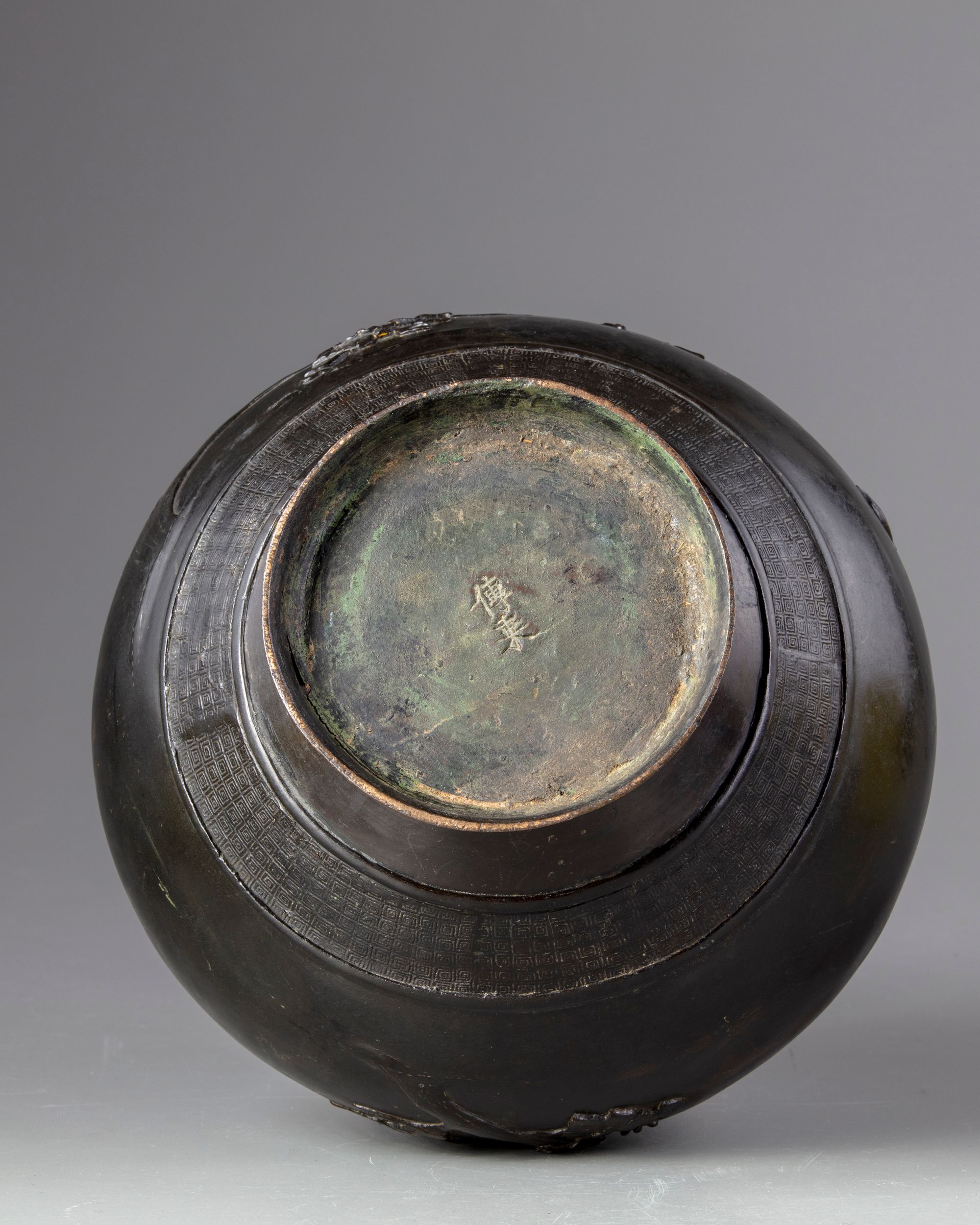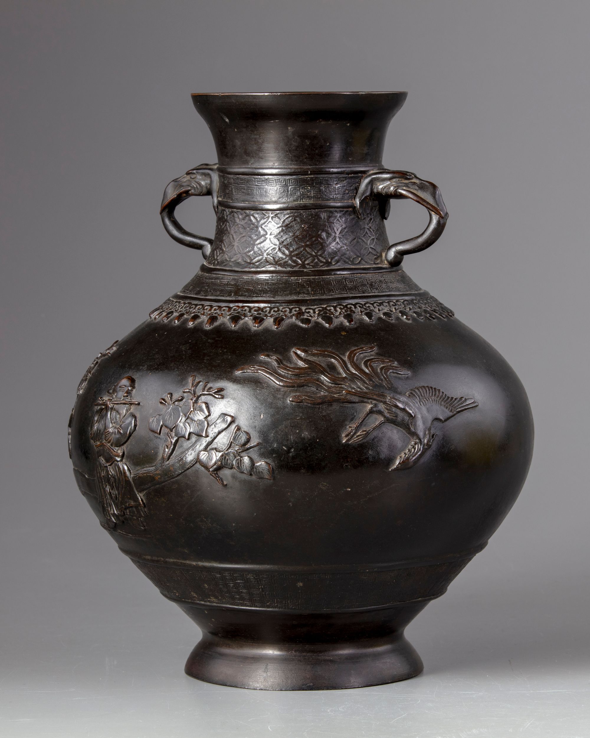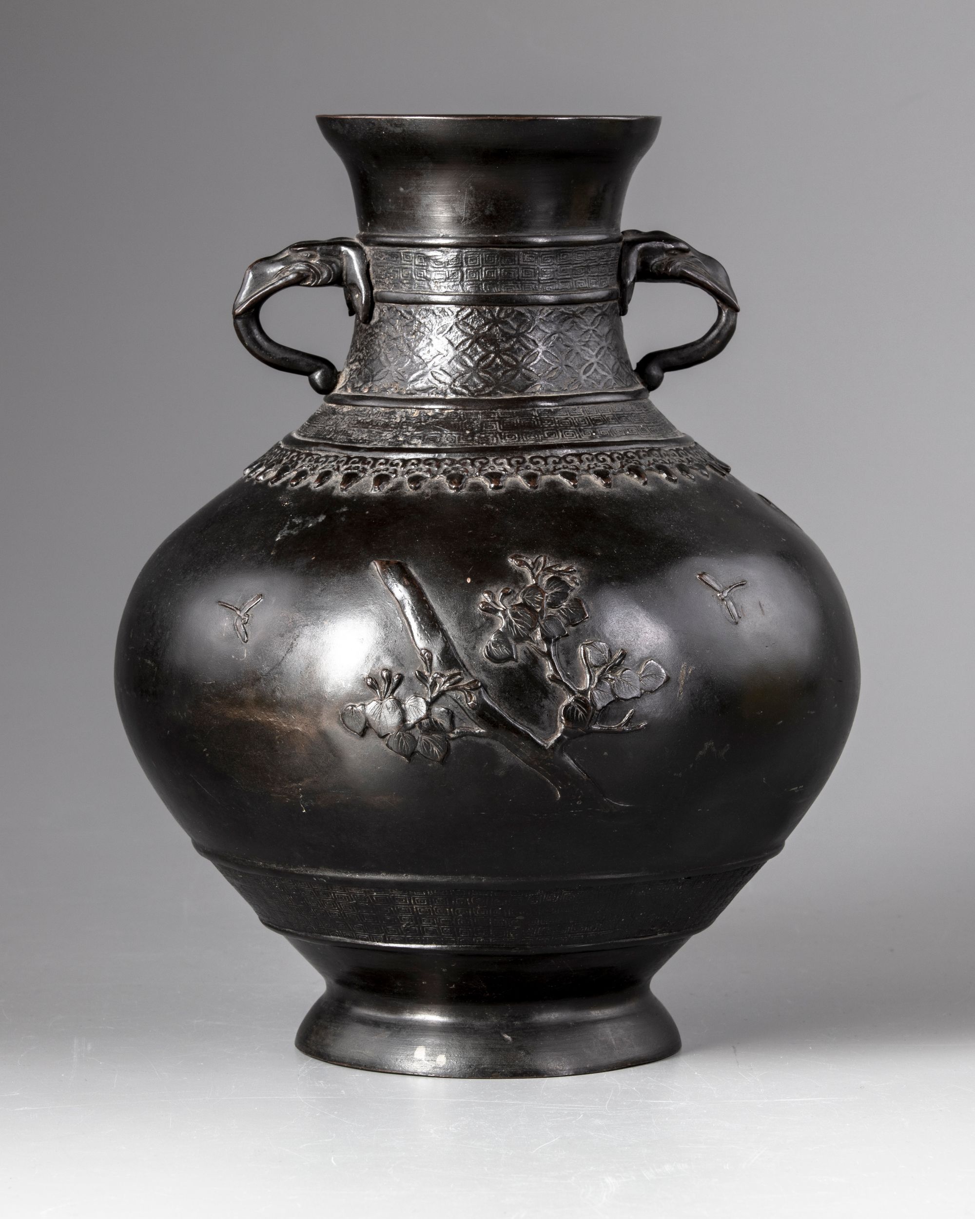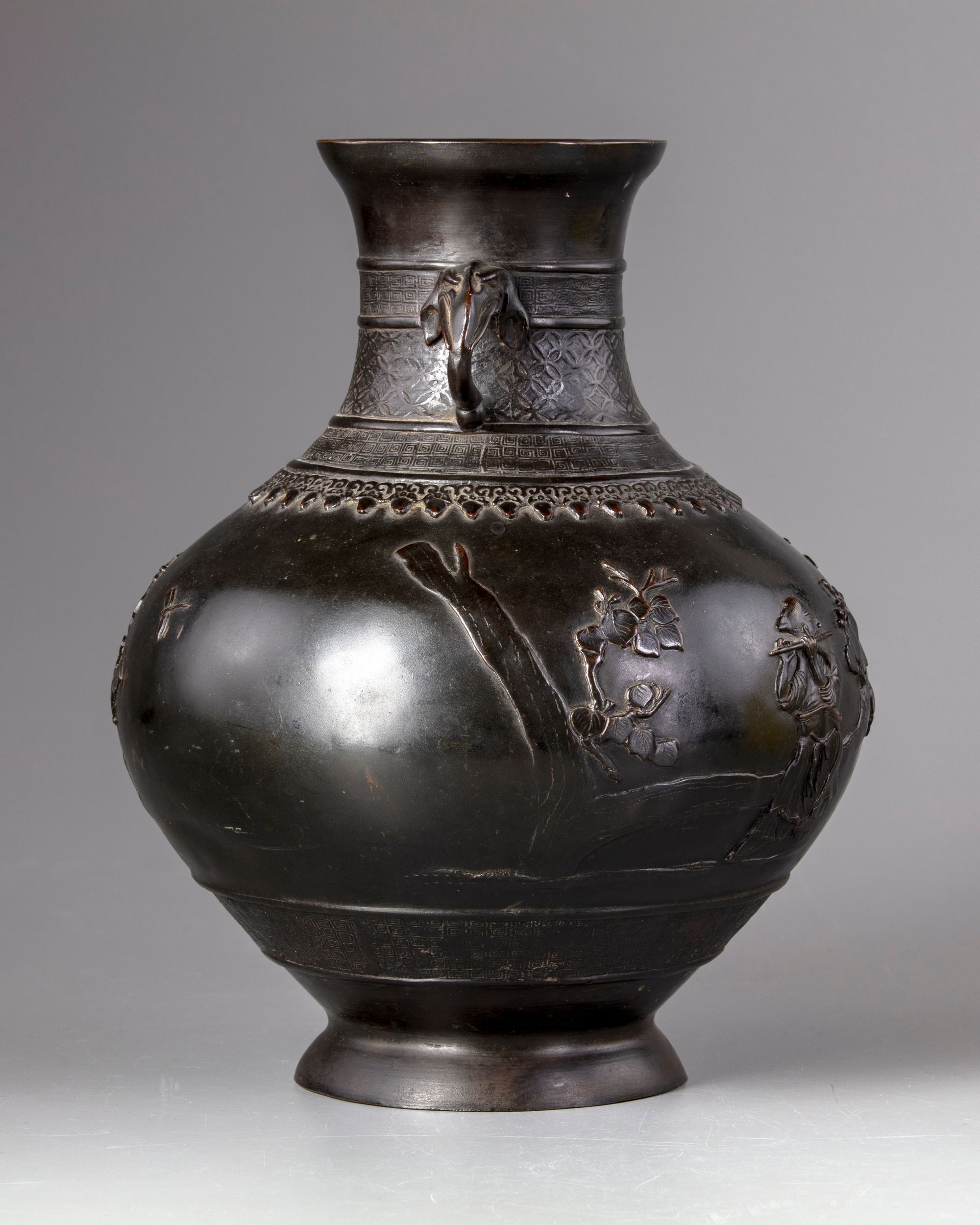 The vase is cast with a pair of elephant-head handles and is decorated around the neck and the lower section with three bands of key fret chains and flowers.