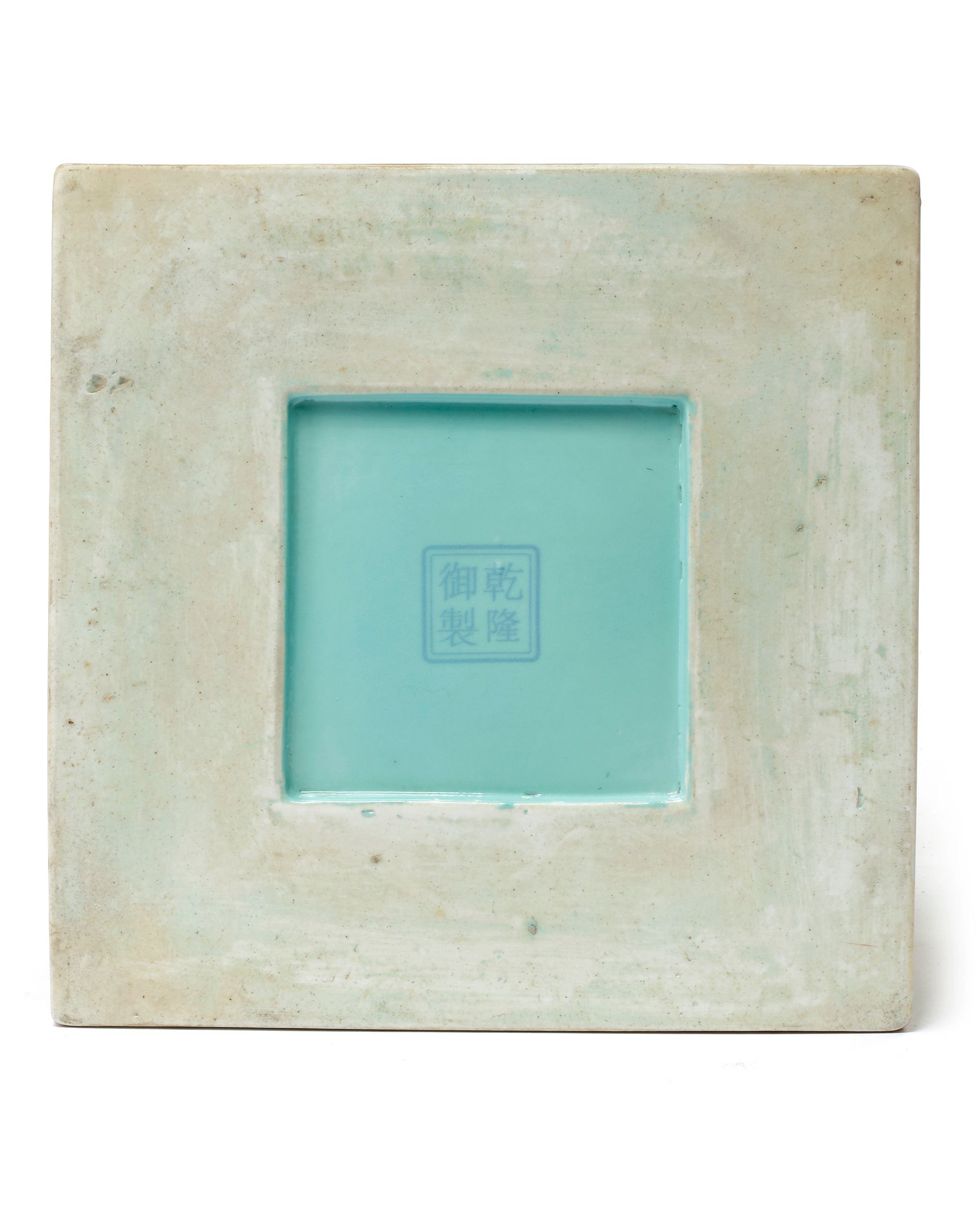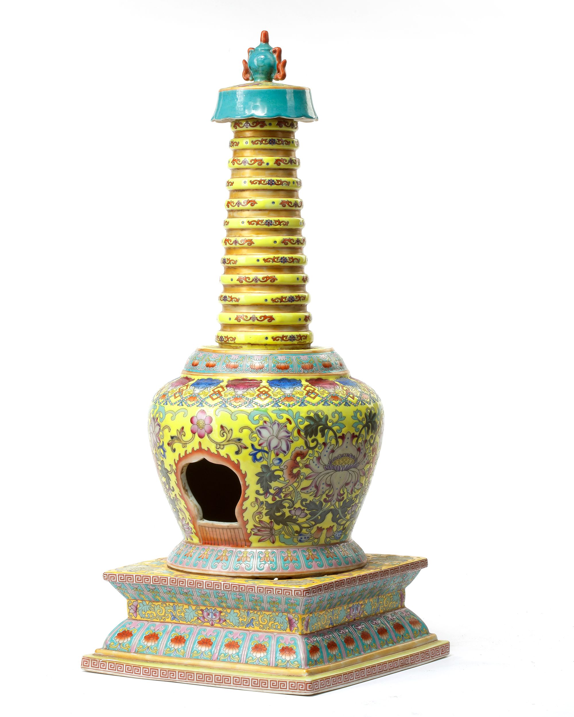 The tower is decorated to the body with a band of lion masks above three large lotus heads with foliage. The domed vessel opens to reveal a gilt Buddha with hands in prayer and seated in dhyanasana. The column is divided into twelve registers of lotus scrolls supporting a parasol surmounted by a beribboned vase. The square stand decorated with further flower scrolls and a key fret chain. The turquoise-glazed base bears a four-character Qianlong mark.