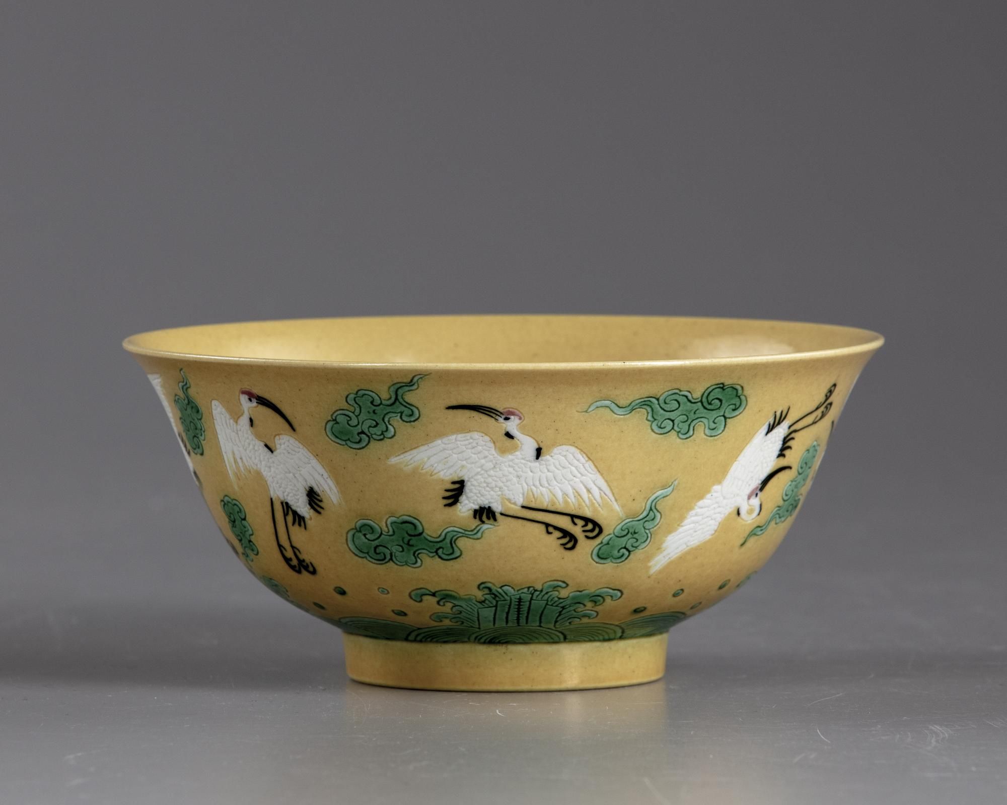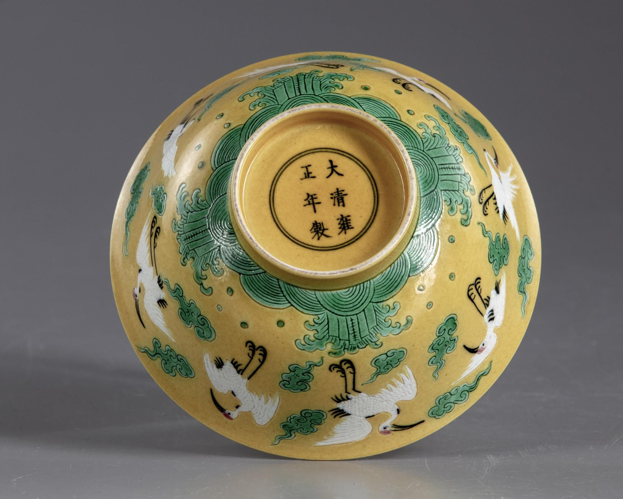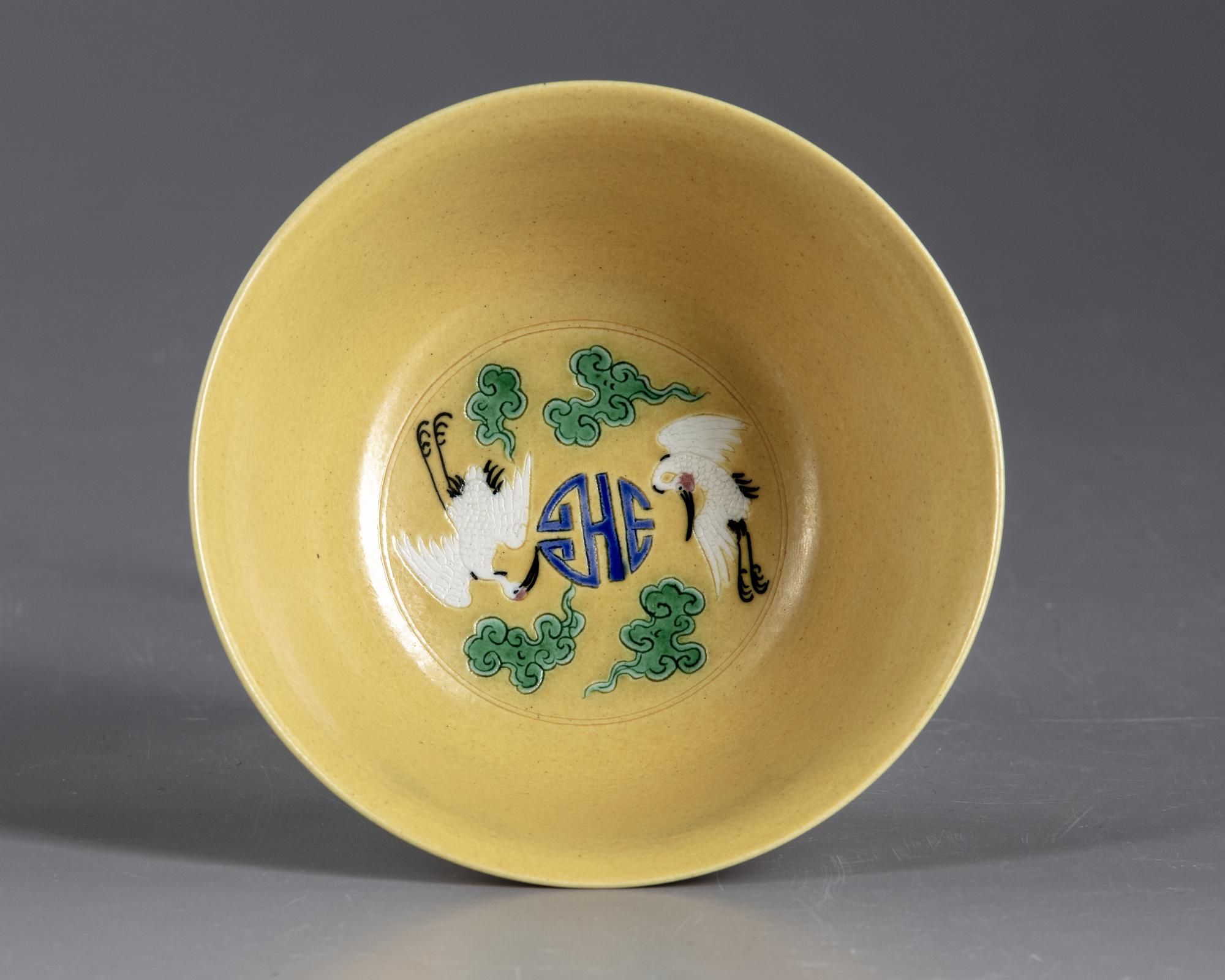 A Chinese porcelain bowl, decorated to the interior with a shou symbol surrounded by two cranes and clouds, to the exterior with cranes and clouds above waves. The bottom with a Chinese Yongzheng six character mark.