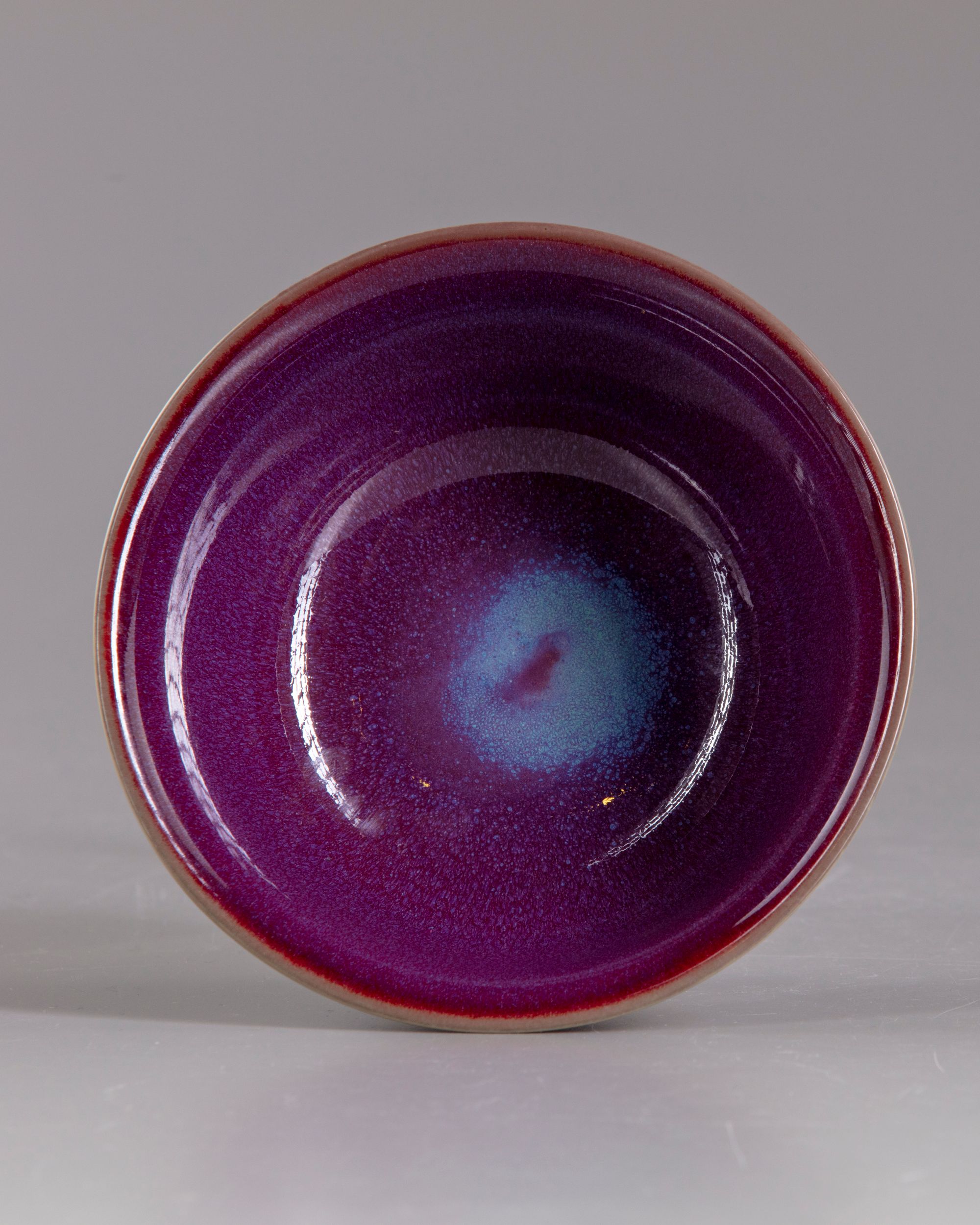 The bowl is finely potted with a gently everted mouth rim. The rounded sides is raised on a low ring foot. Covered on the interior and exterior with a deep purple-red glaze in imitation of Jun ware. The base is unglazed.