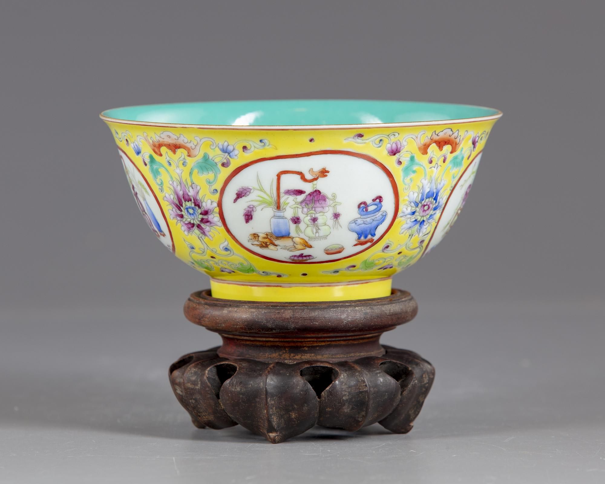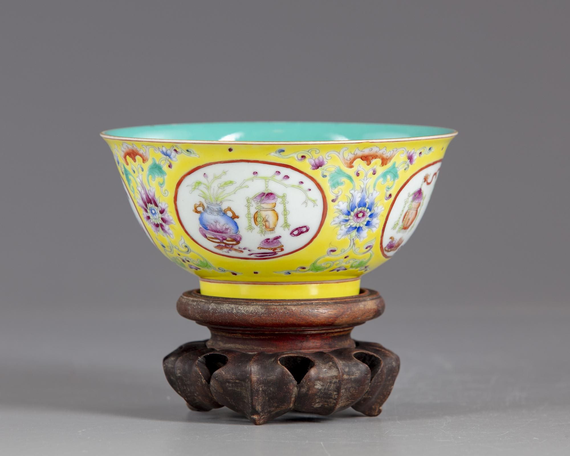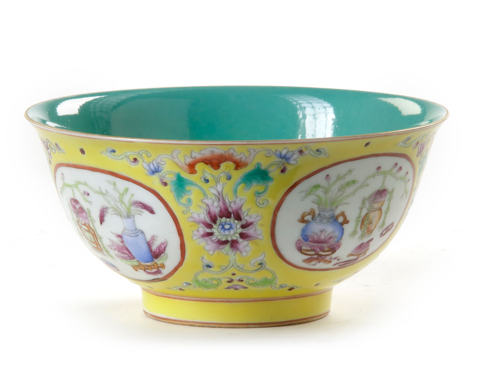 The bowl is finely decorated on the exterior with four medallions each enclosing precious objects, interspersed with lotus scrolls and Fu bats. The interior is covered with a turquoise glaze and gilt rim.