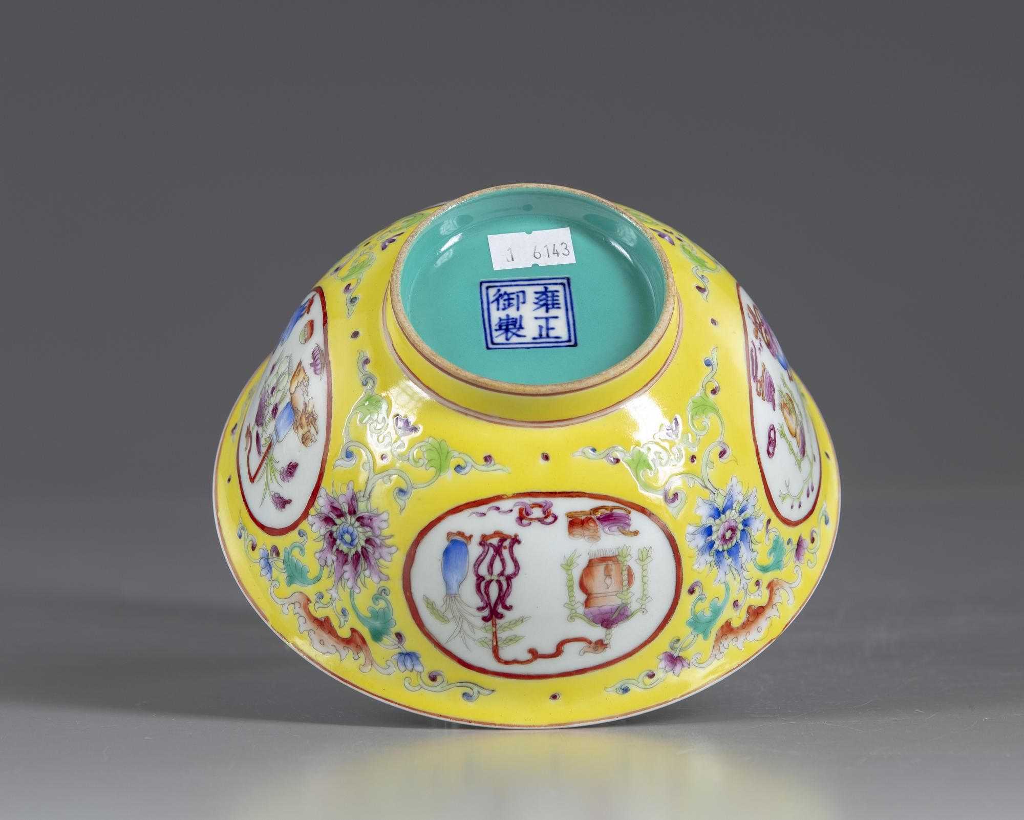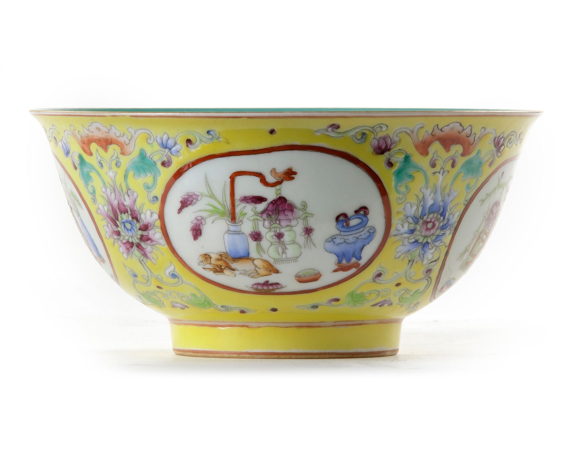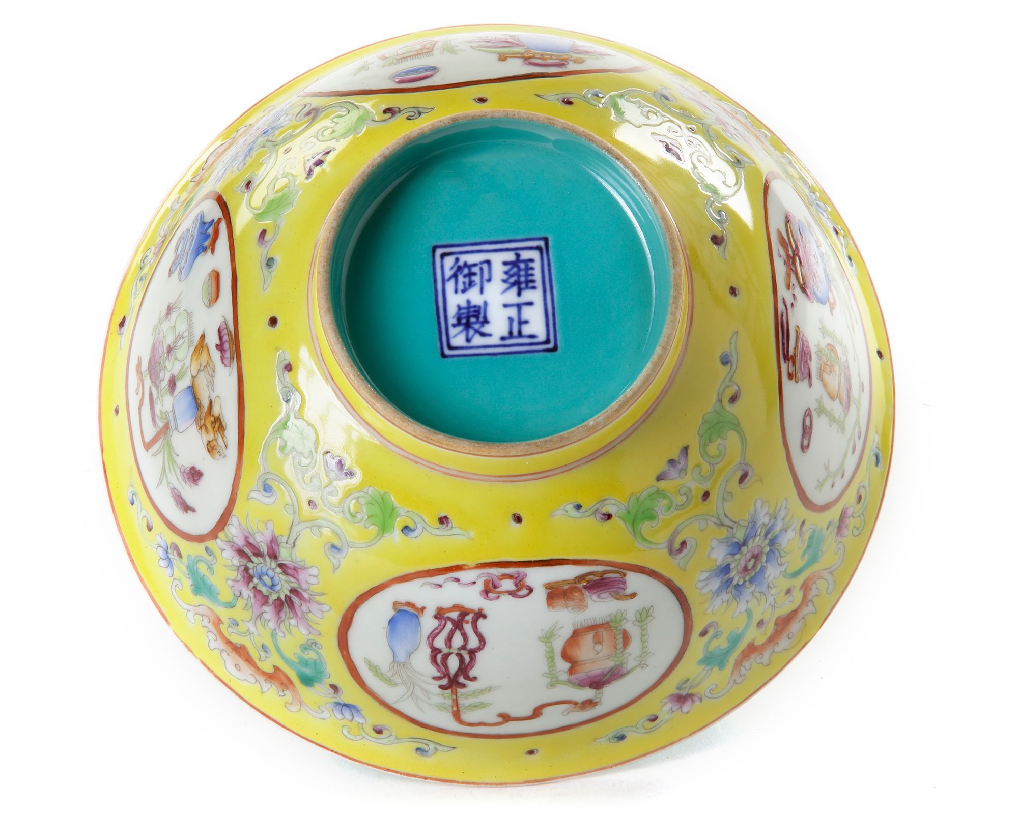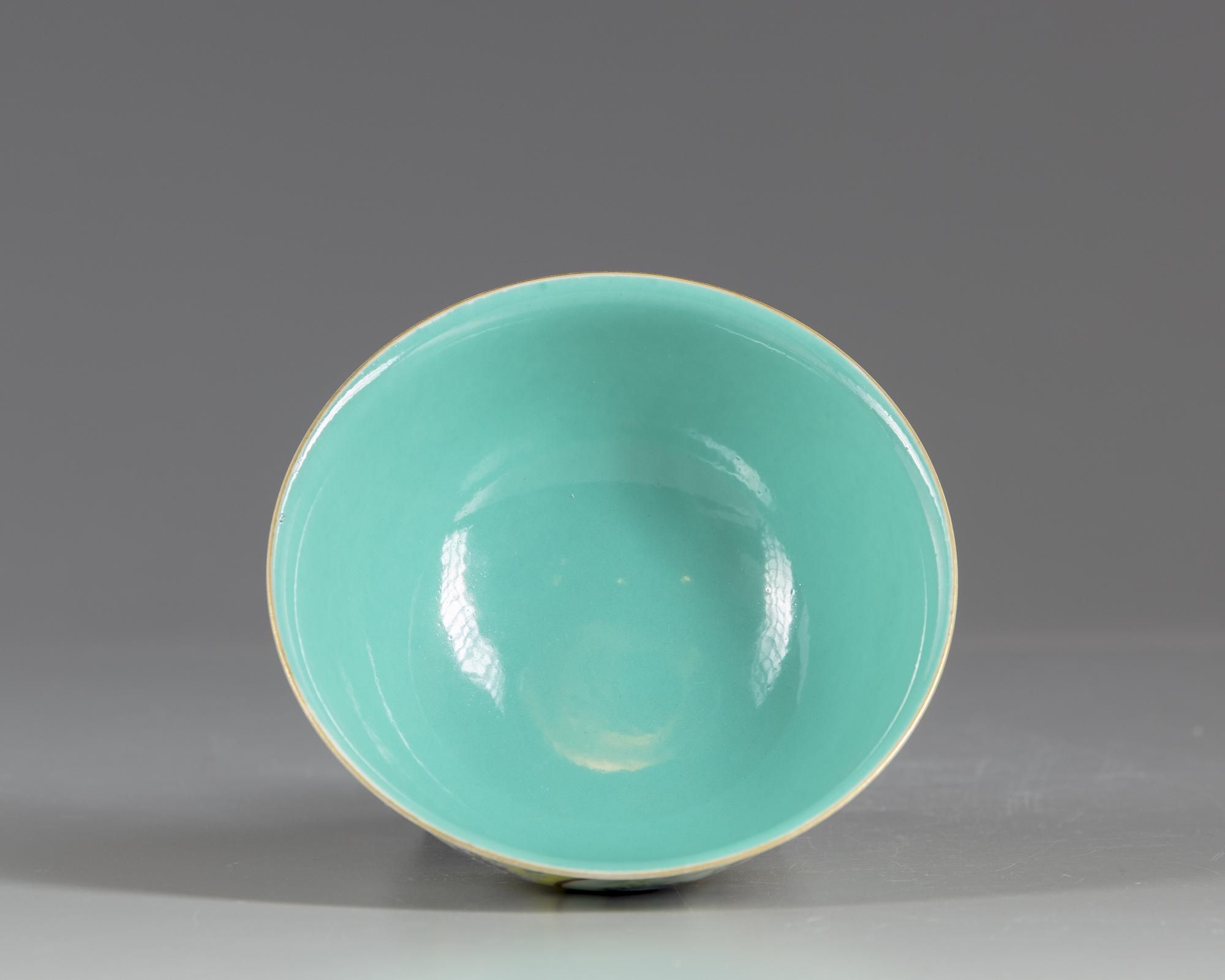 The bowl is finely decorated on the exterior with four medallions each enclosing precious objects, interspersed with lotus scrolls and Fu bats. The interior is covered with a turquoise glaze and gilt rim.