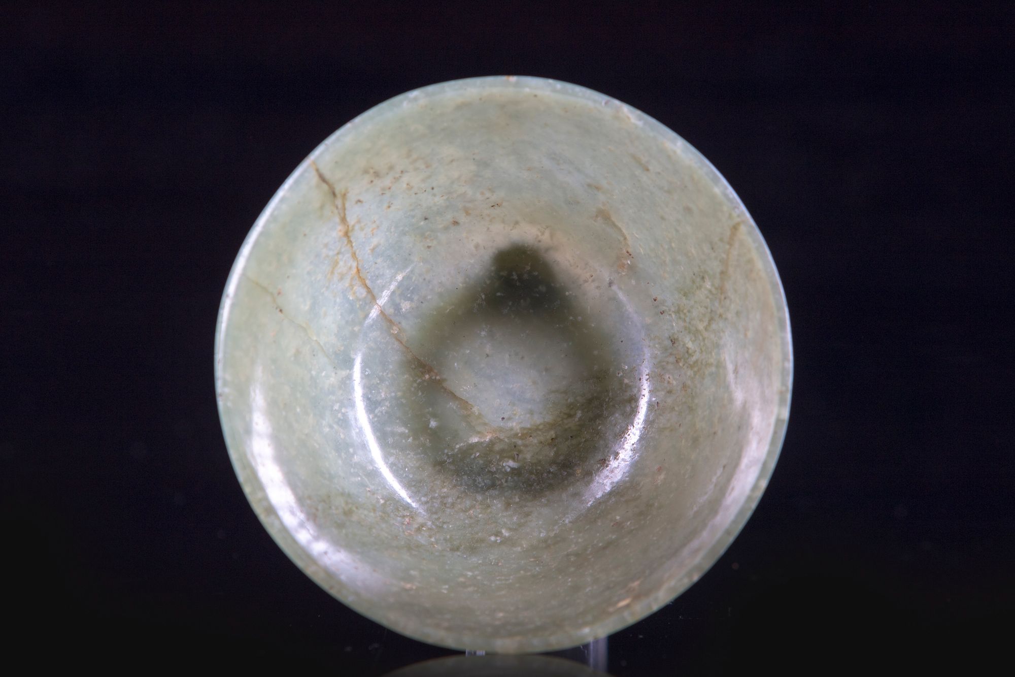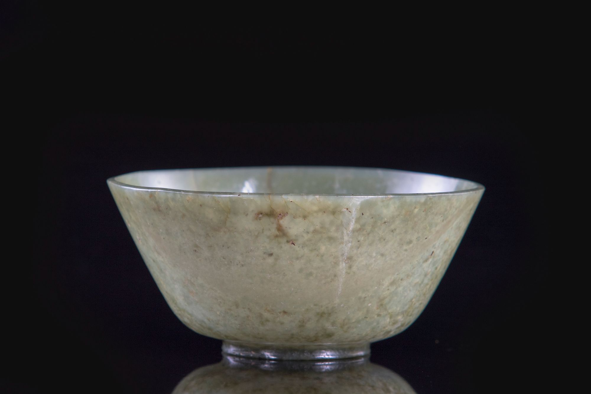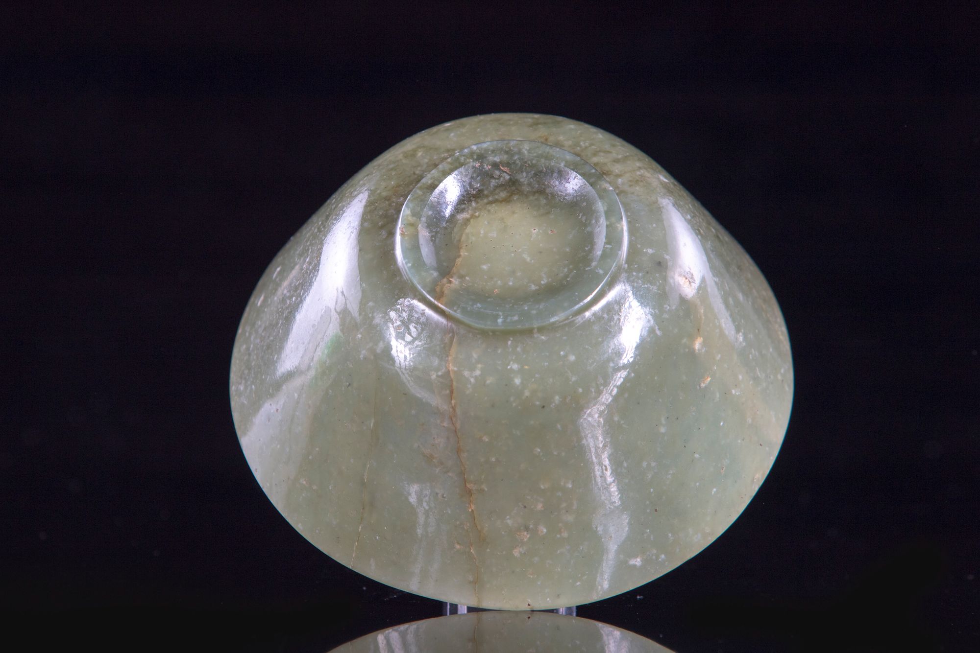 The bowl is of rounded form on a slight base, the stone is of a greyish green tone. Diameter: 10 cm. Height: 5 cm.