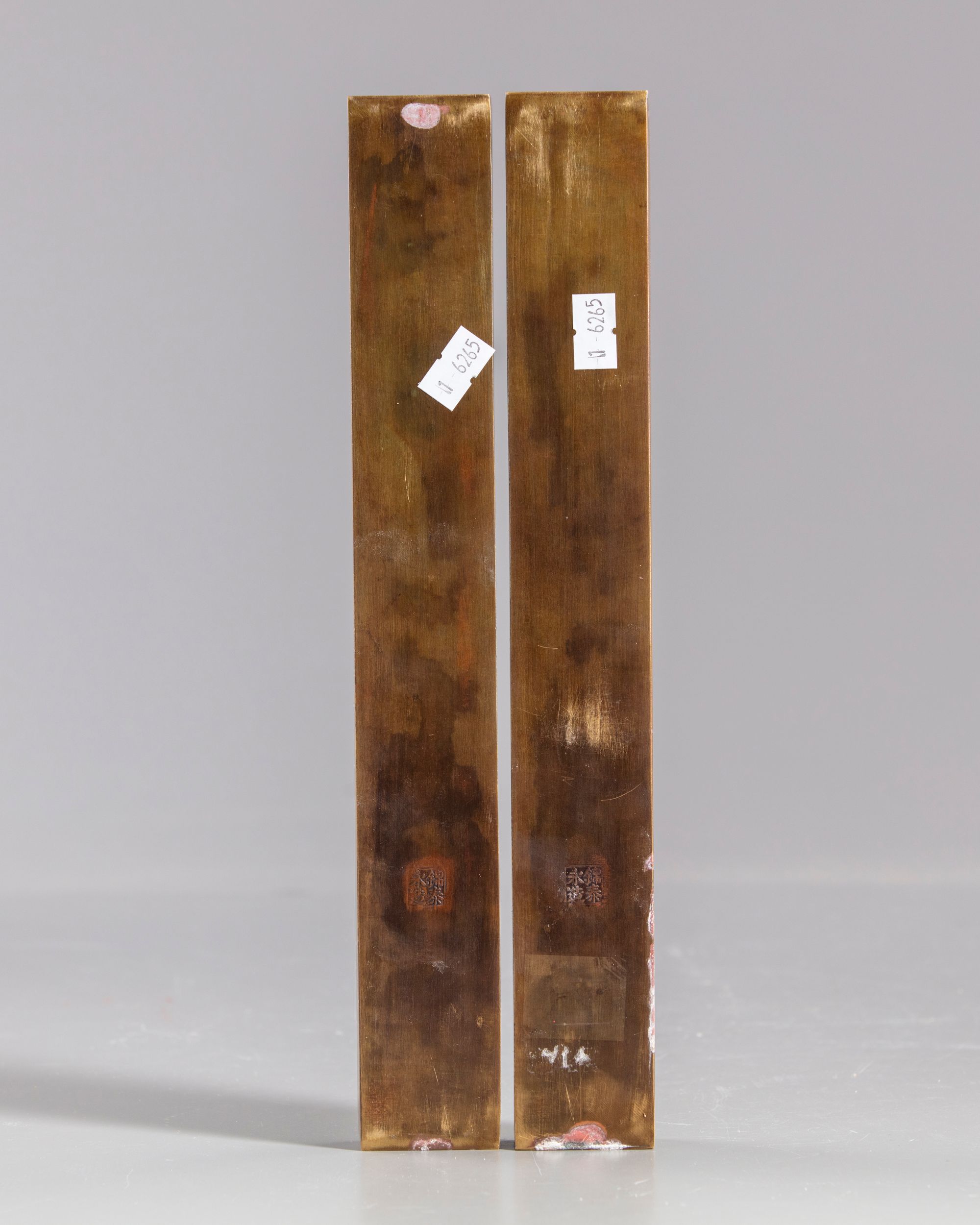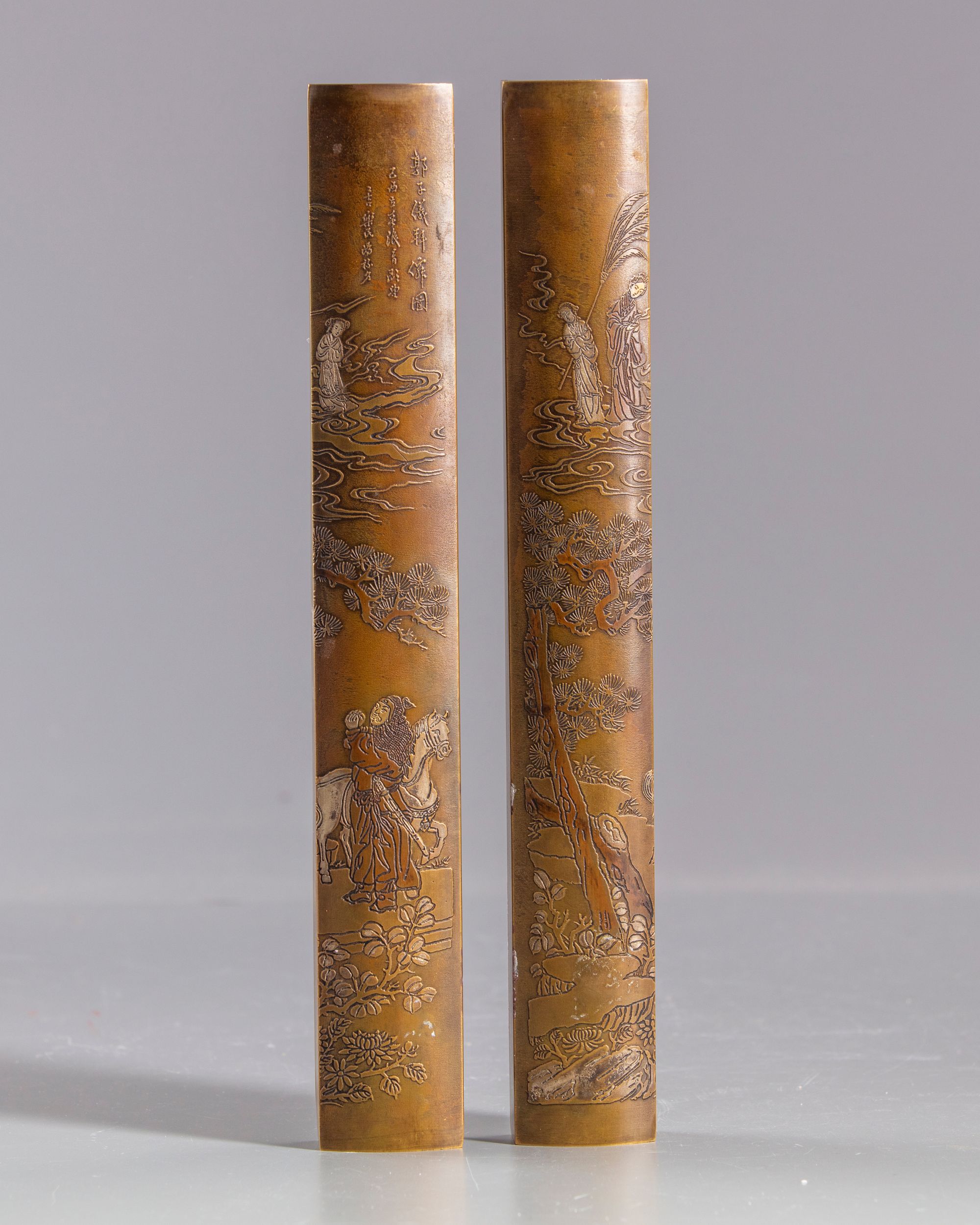 Carved to both weights with a continue scene of a warrior with his horse praying to Xi wang mu, the Queen Mother of the West, in a landscape. With Chinese inscriptions and a Chinese four character mark to the reverse.