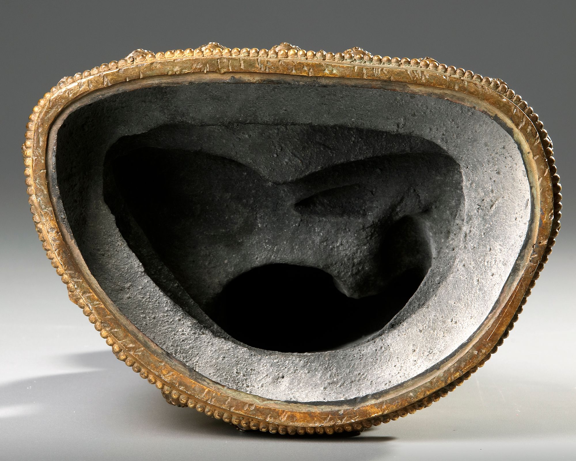 Cast seated in dhyanasana on a double lotus base, the right hand extended in bhumisparshamudra and the left in dhyanamudra, wearing a shawl draped over the left shoulder, the serene face with downcast eyes and meditative expression.