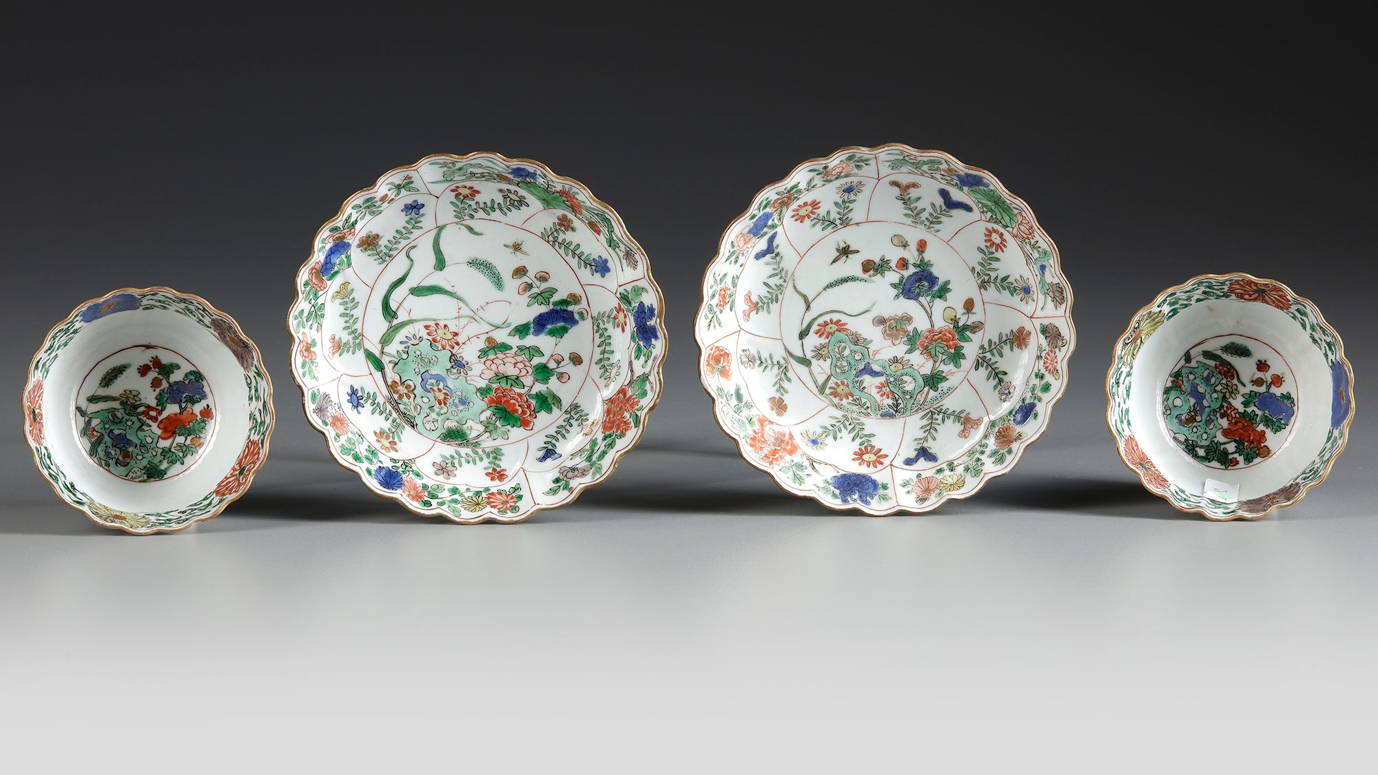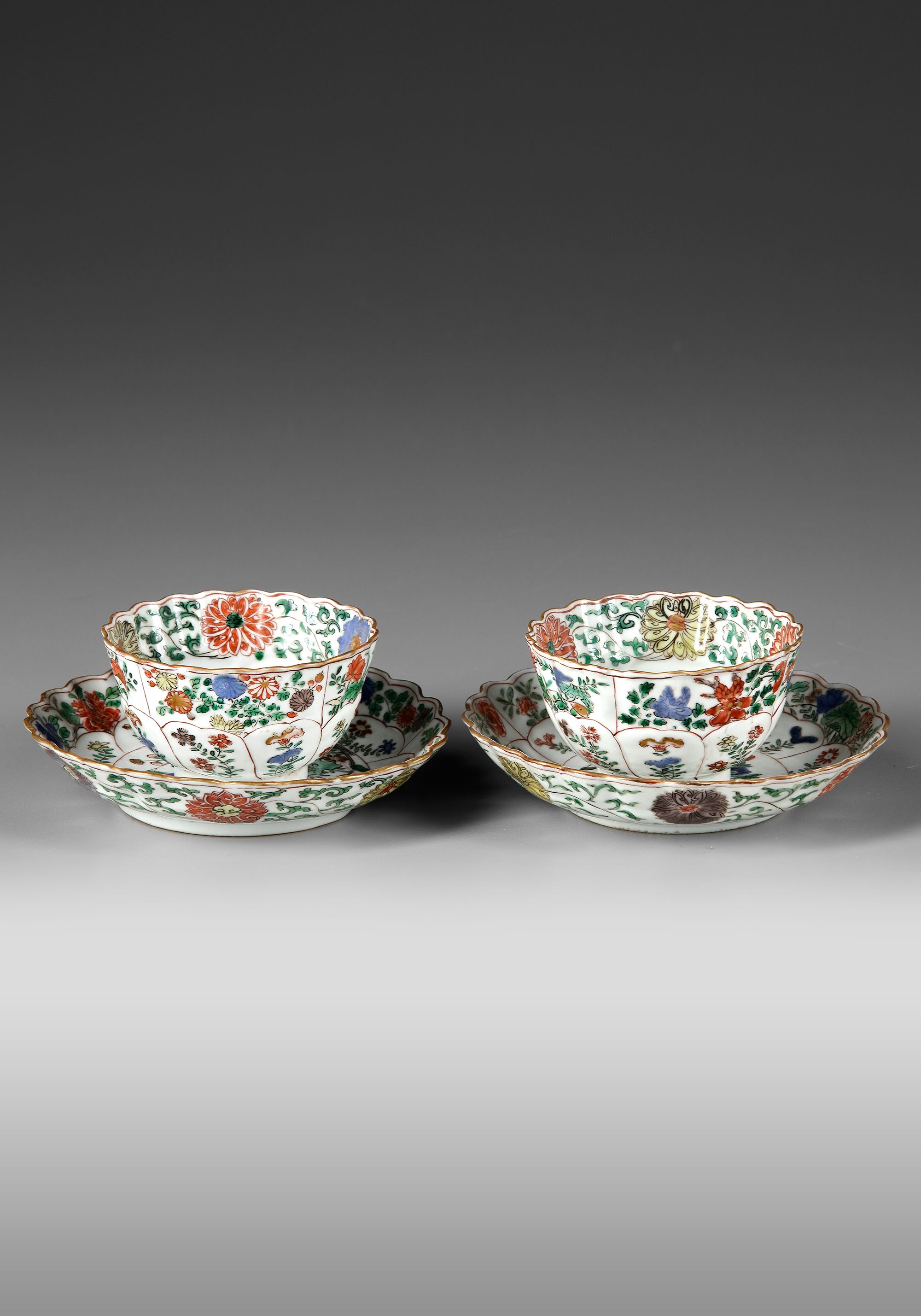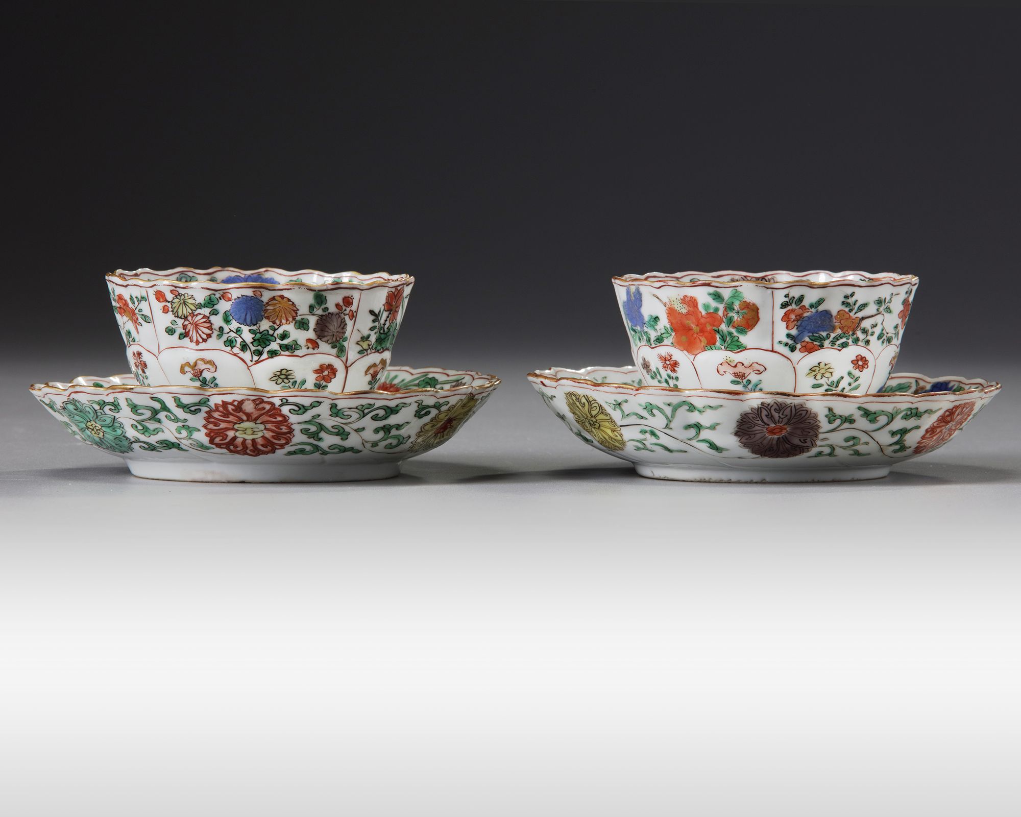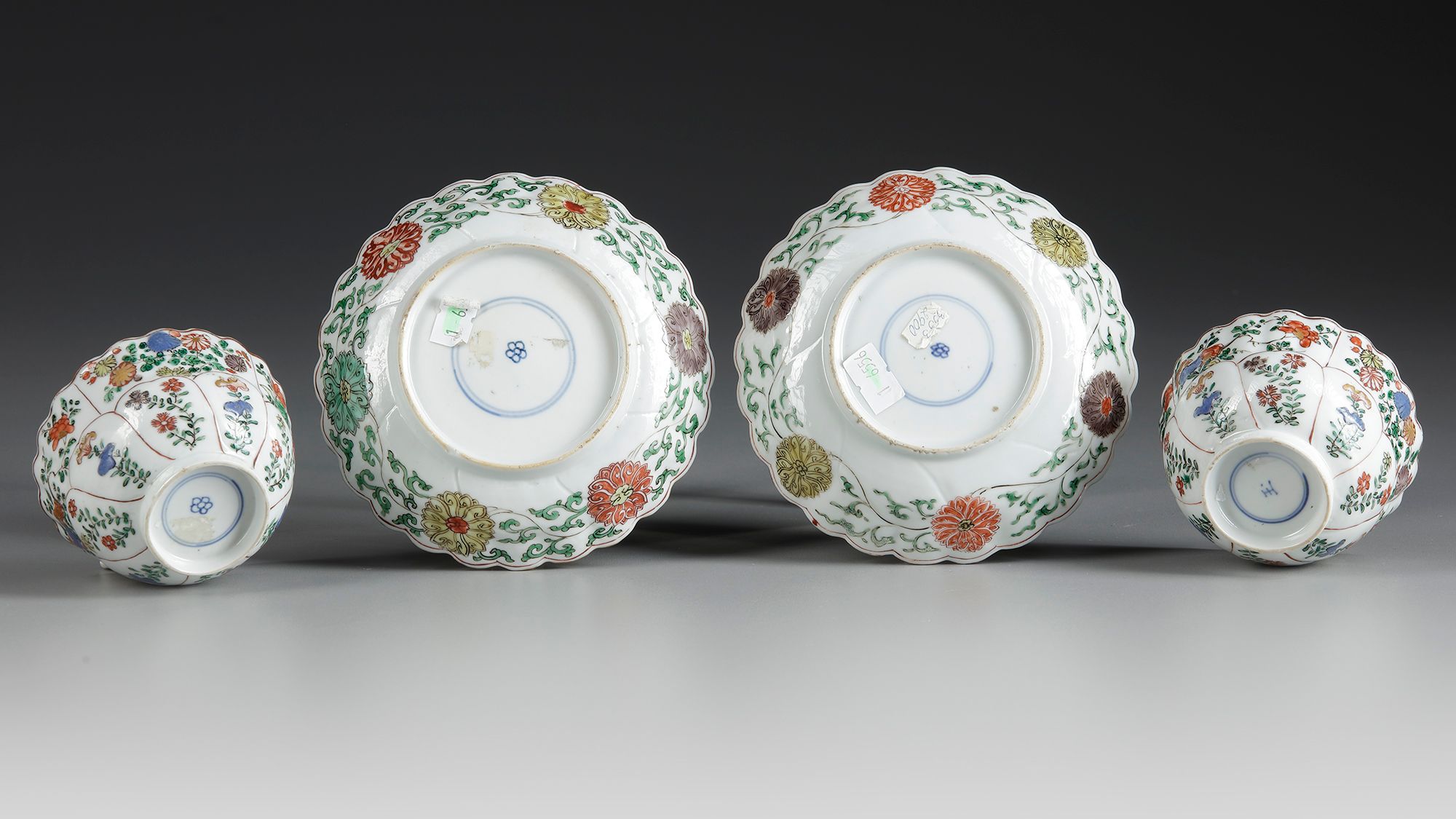 Each saucer is decorated with a central circular panel enclosing flowers growing from pierced rocks, surrounded by petal-shaped panels enclosing further flowers. The cups are similarly decorated, with moulded petal-shaped panels at the foot. Each base is marked with a flowerhead in underglaze blue.