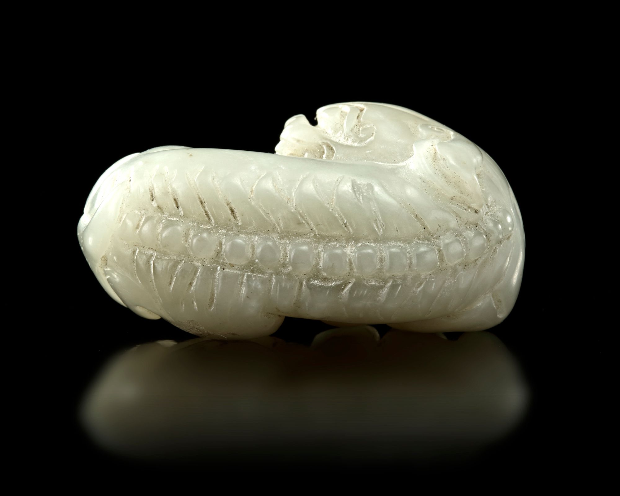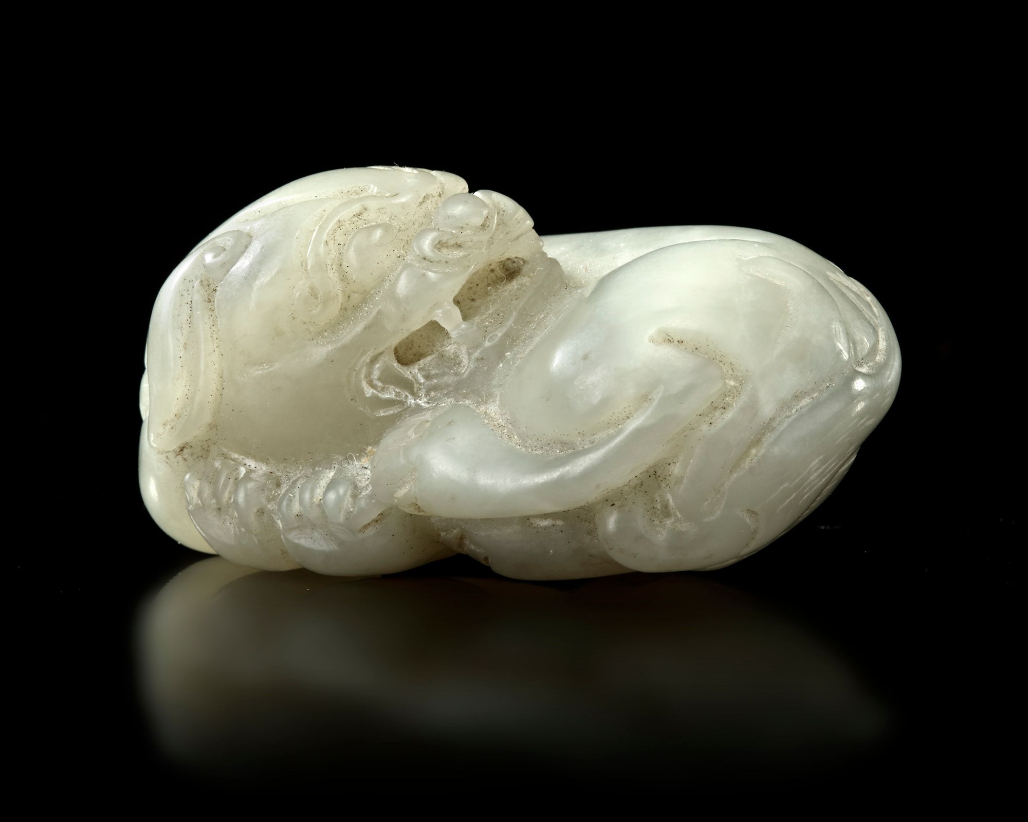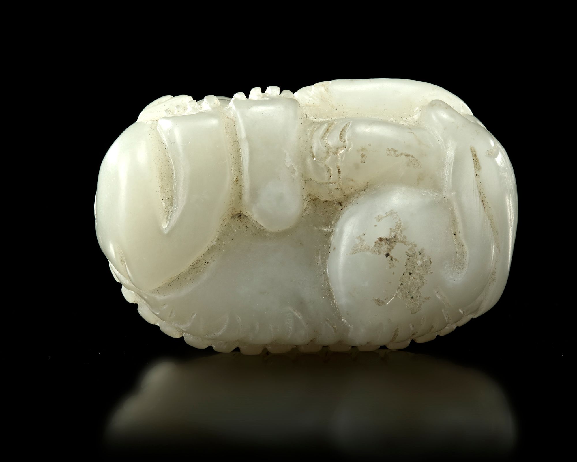 A white jade carving of a recumbent Buddhist Lion. Length: 6 cm.