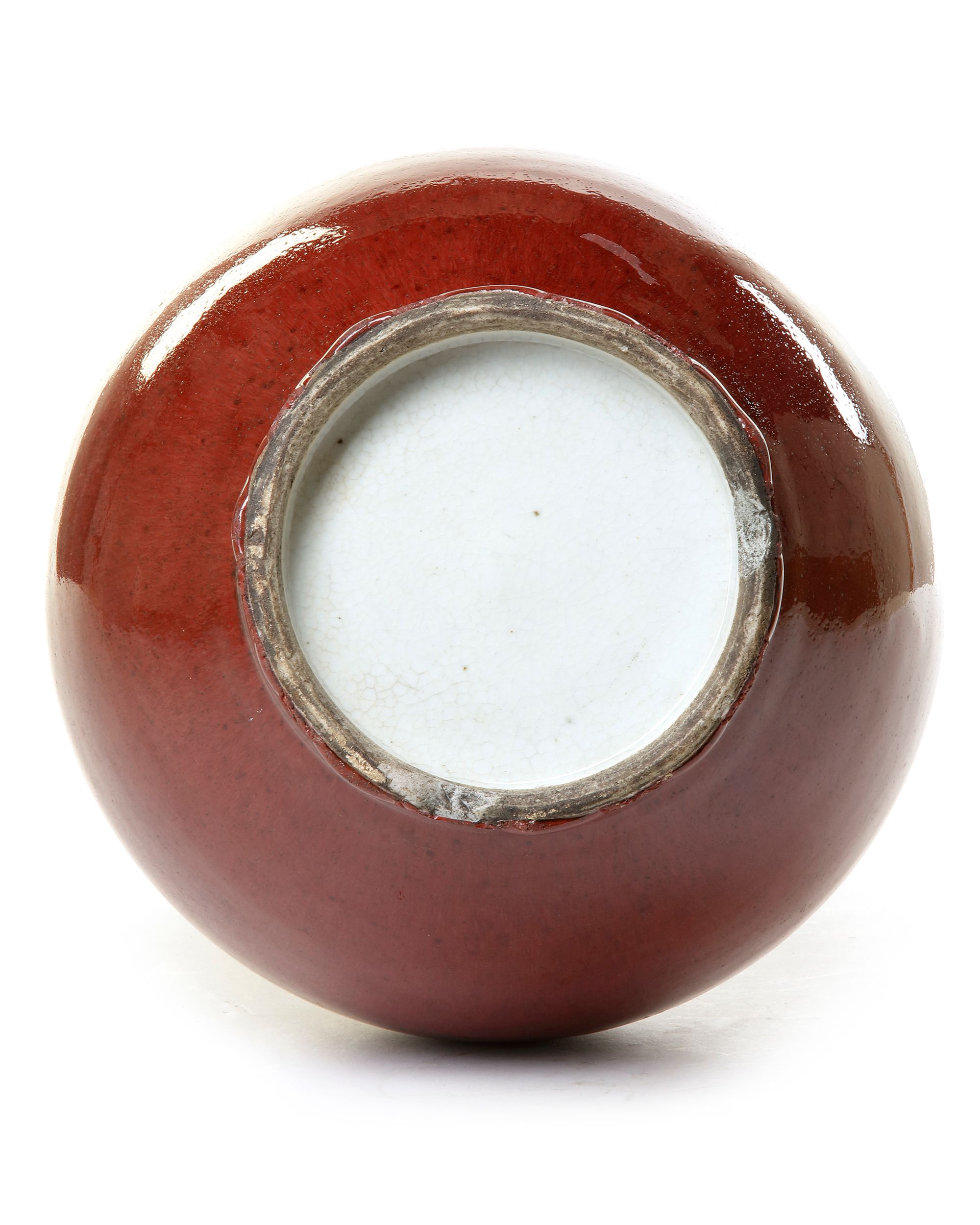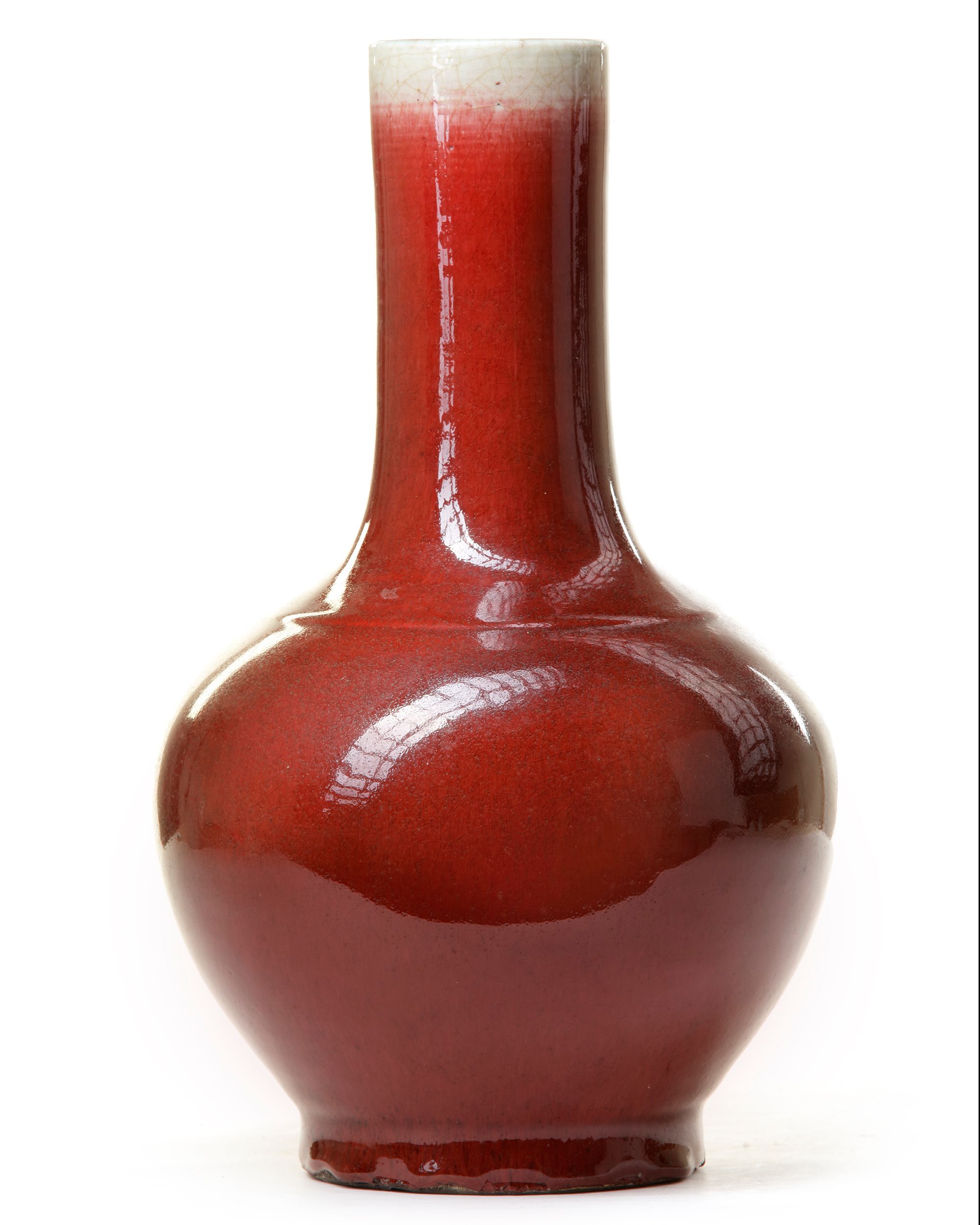 The globular vase modelled with a tall neck, it is covered overall in a strawberry-red finely crackled glaze thinning to mushroom at the rim. The base and interior are covered in a bluish-white crackled glaze.