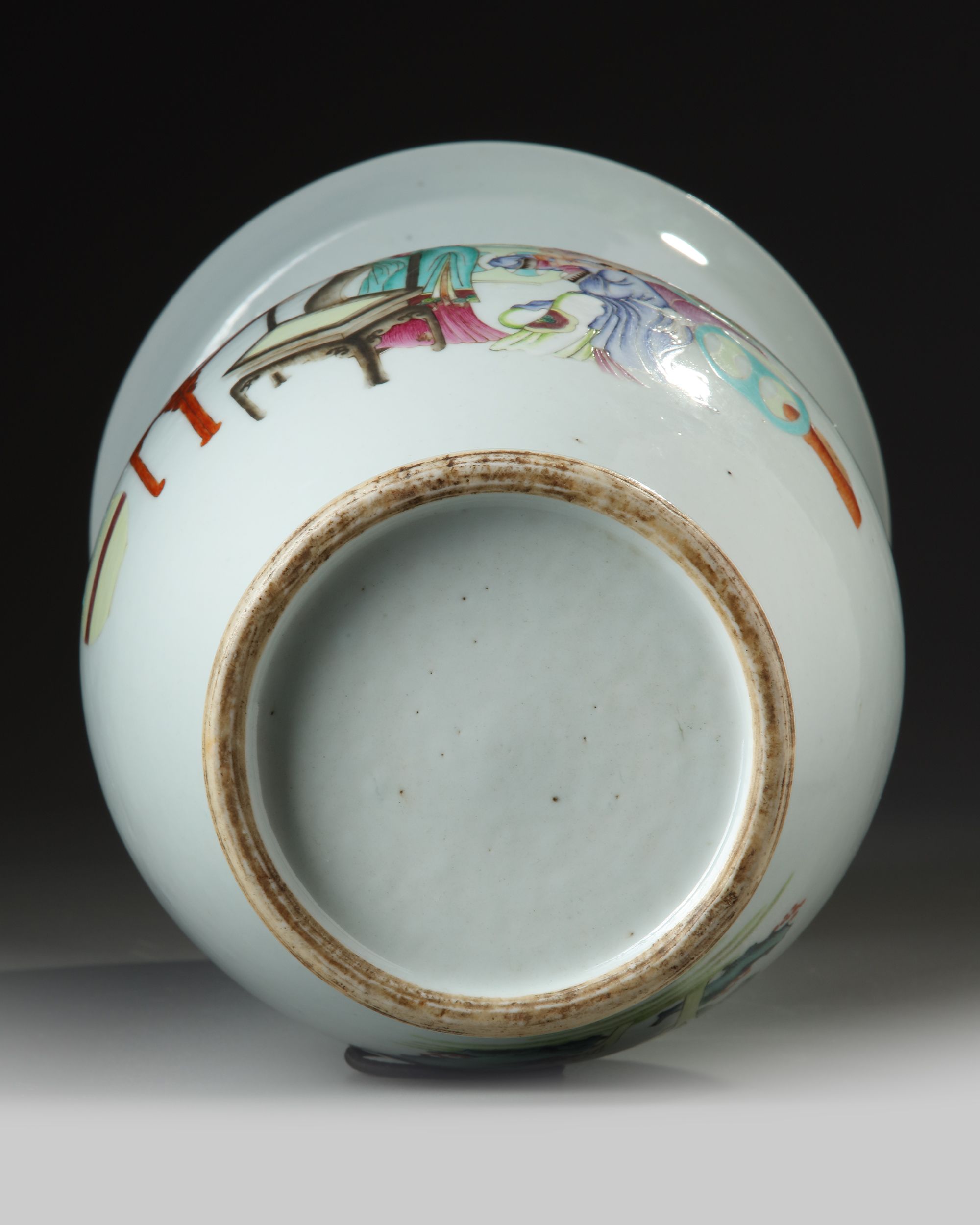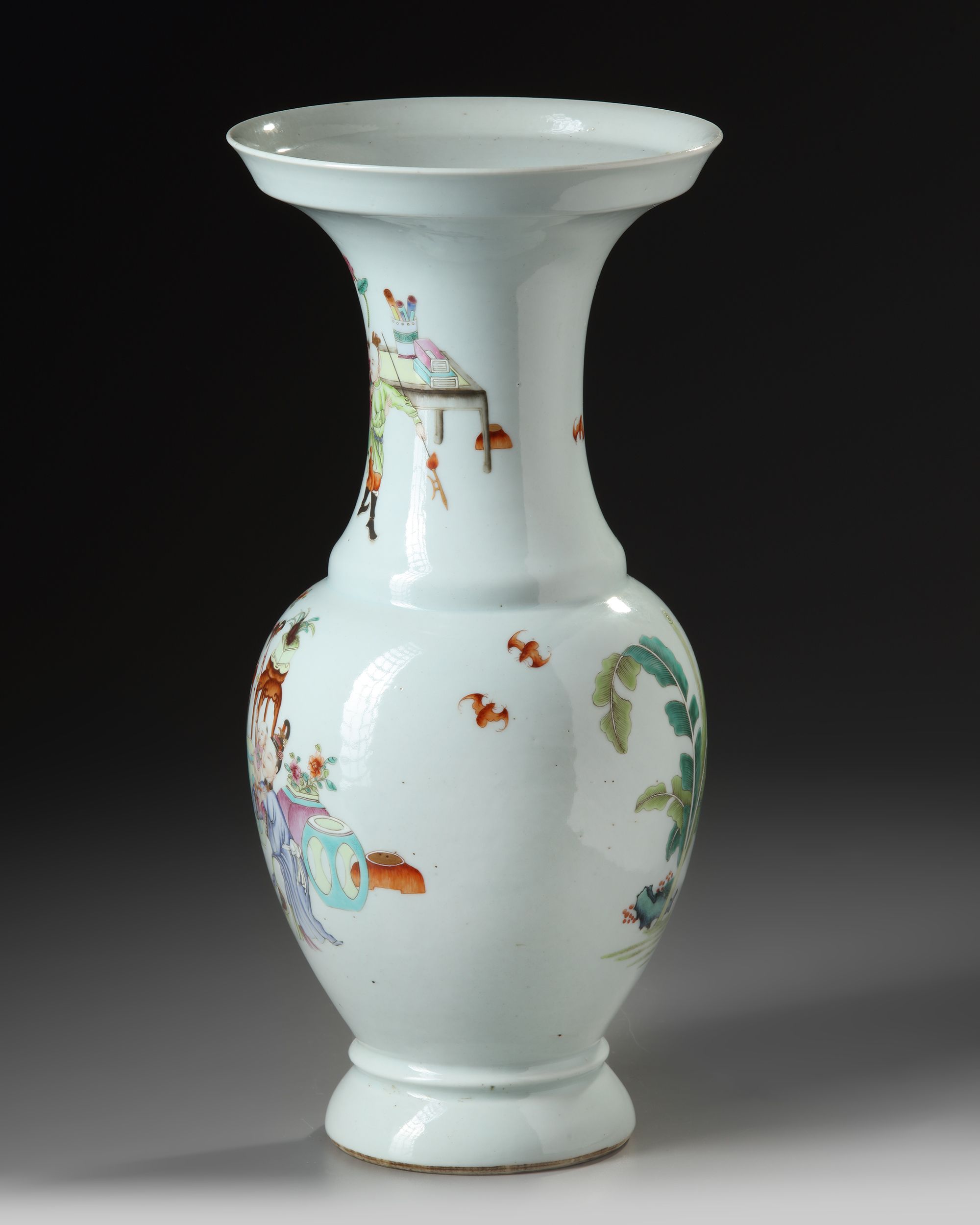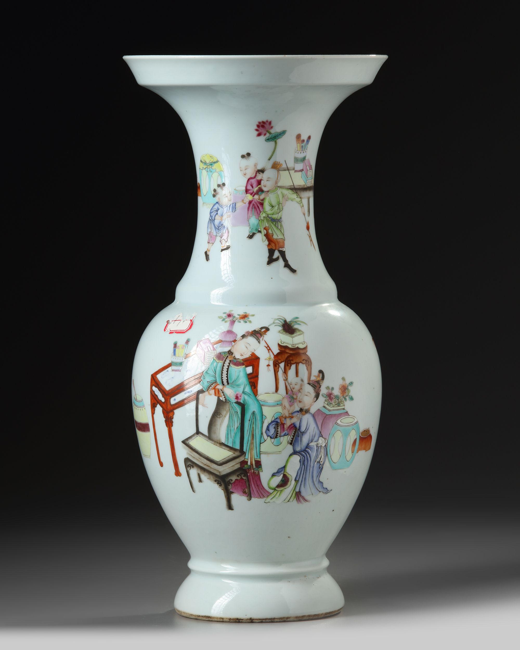 A Chinese porcelain vase with flaring neck, decorated with two elegant ladies with a child amongst precious items, the reverse with large plantain leaves.