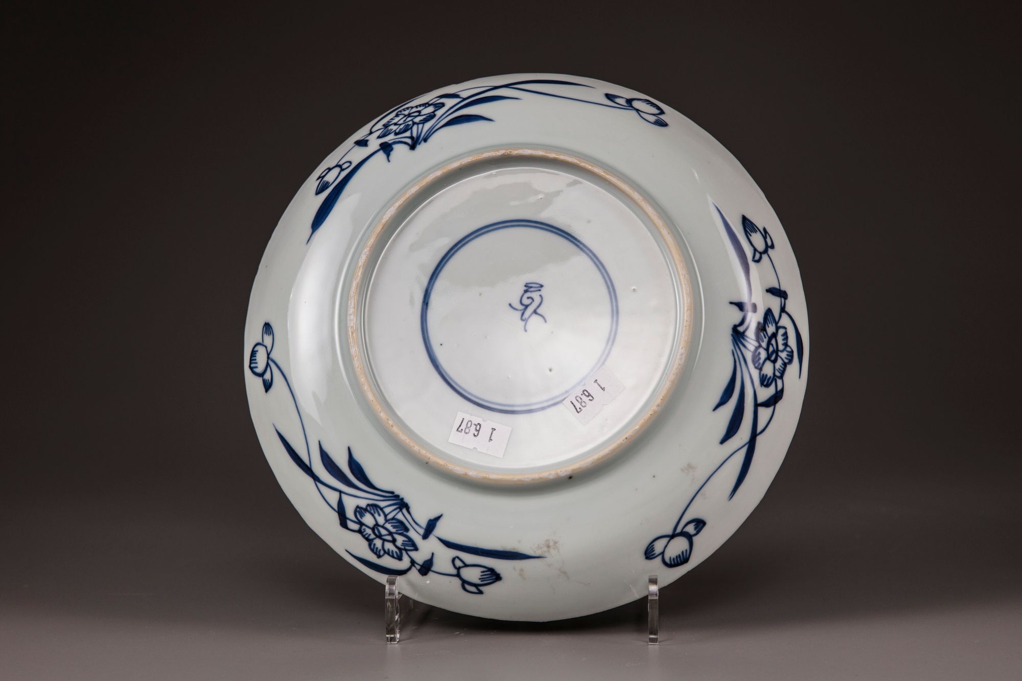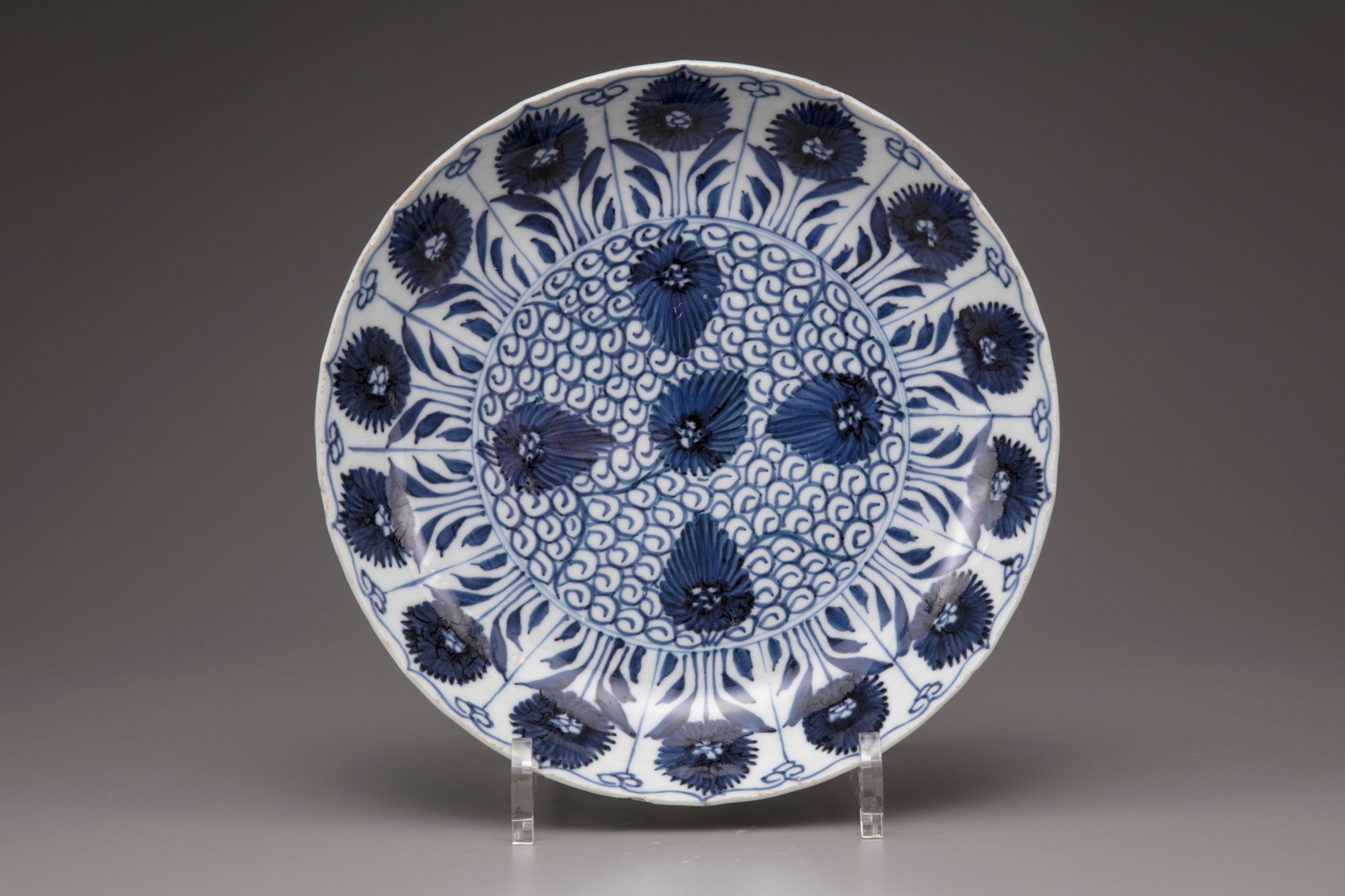decorated in underglaze blue with five lotus flowers surrounded by fourteen panels with lotus flowers, the reverse with three lotus and a conch shell mark within a double circle.