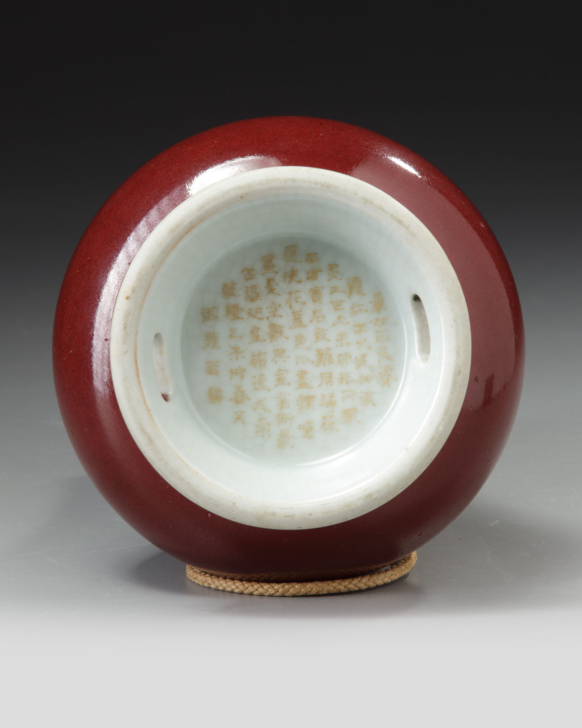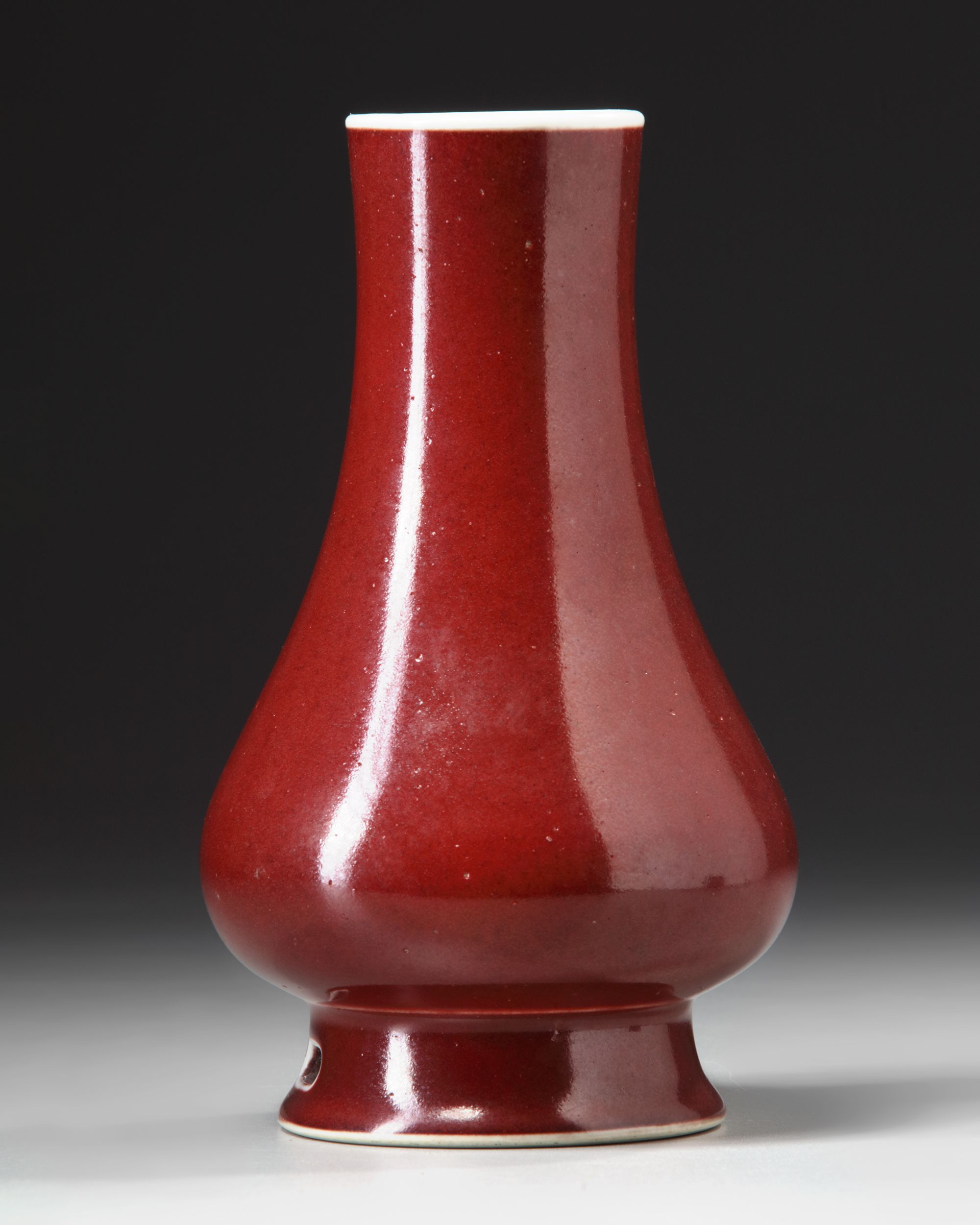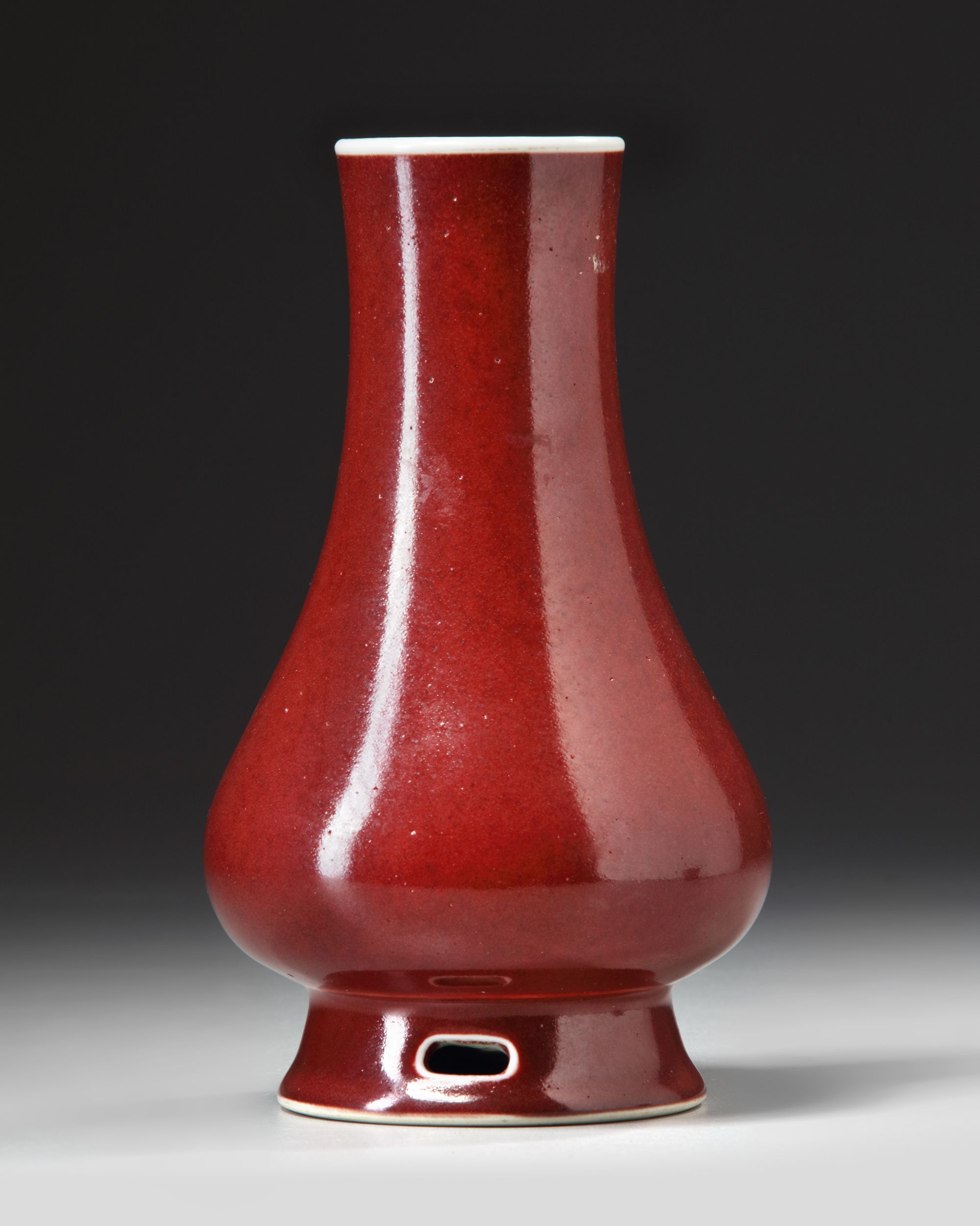 The vase has a long cylindrical neck rising from a bulbous body, with two pierced oval sections to the foot. It is covered in a rich raspberry-red glaze, thinning to white at the mouth rim and stopping neatly at the foot. The base crackle glazed and inscribed in gilt with a poem.