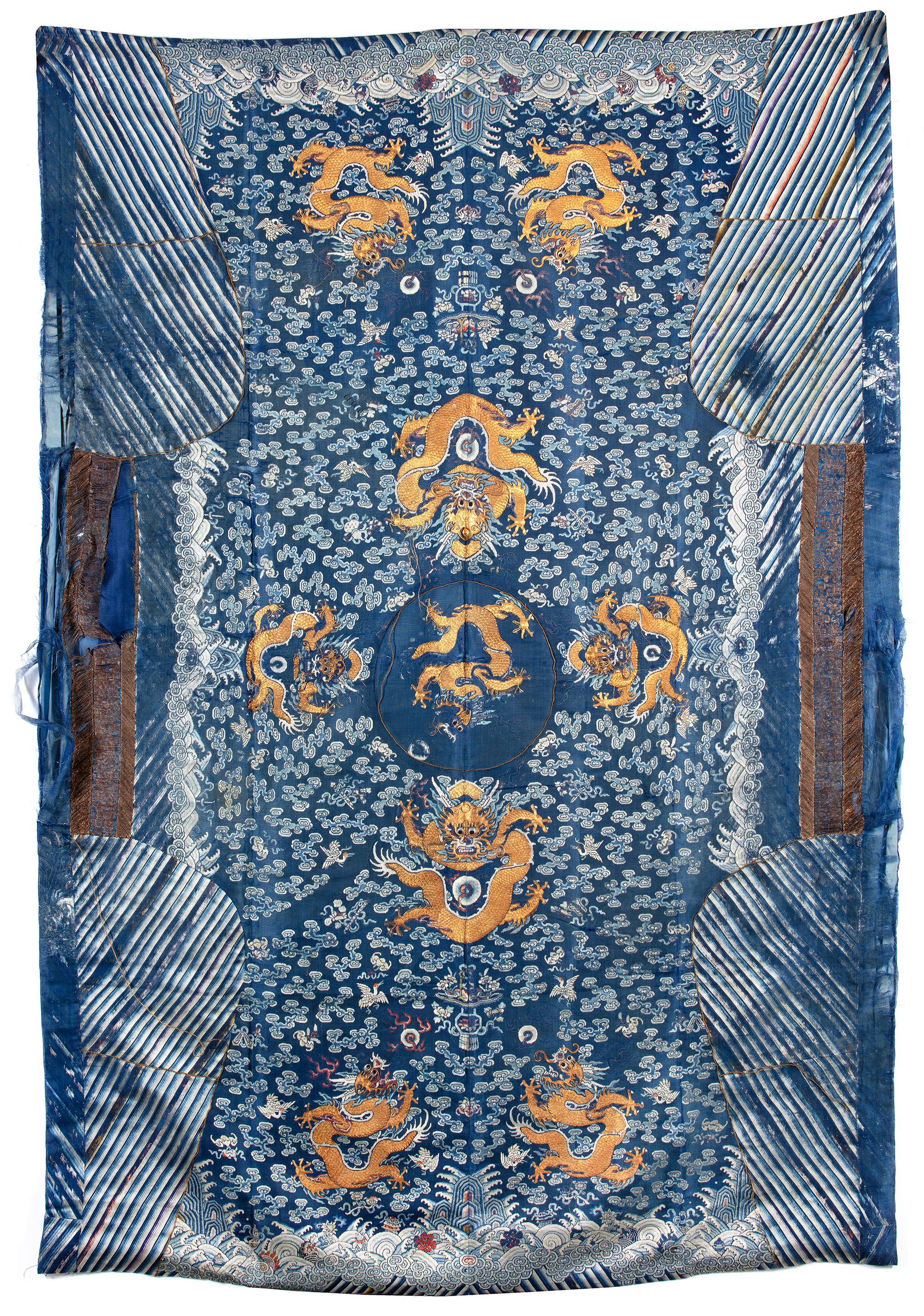 Finely worked in couched gilt threads and with nine five-clawed dragons writhing in pursuit of flaming pearls, all amidst swooping bats and Buddhist Emblems, bajixiang, all above rolling and crashing waves and wan characters.