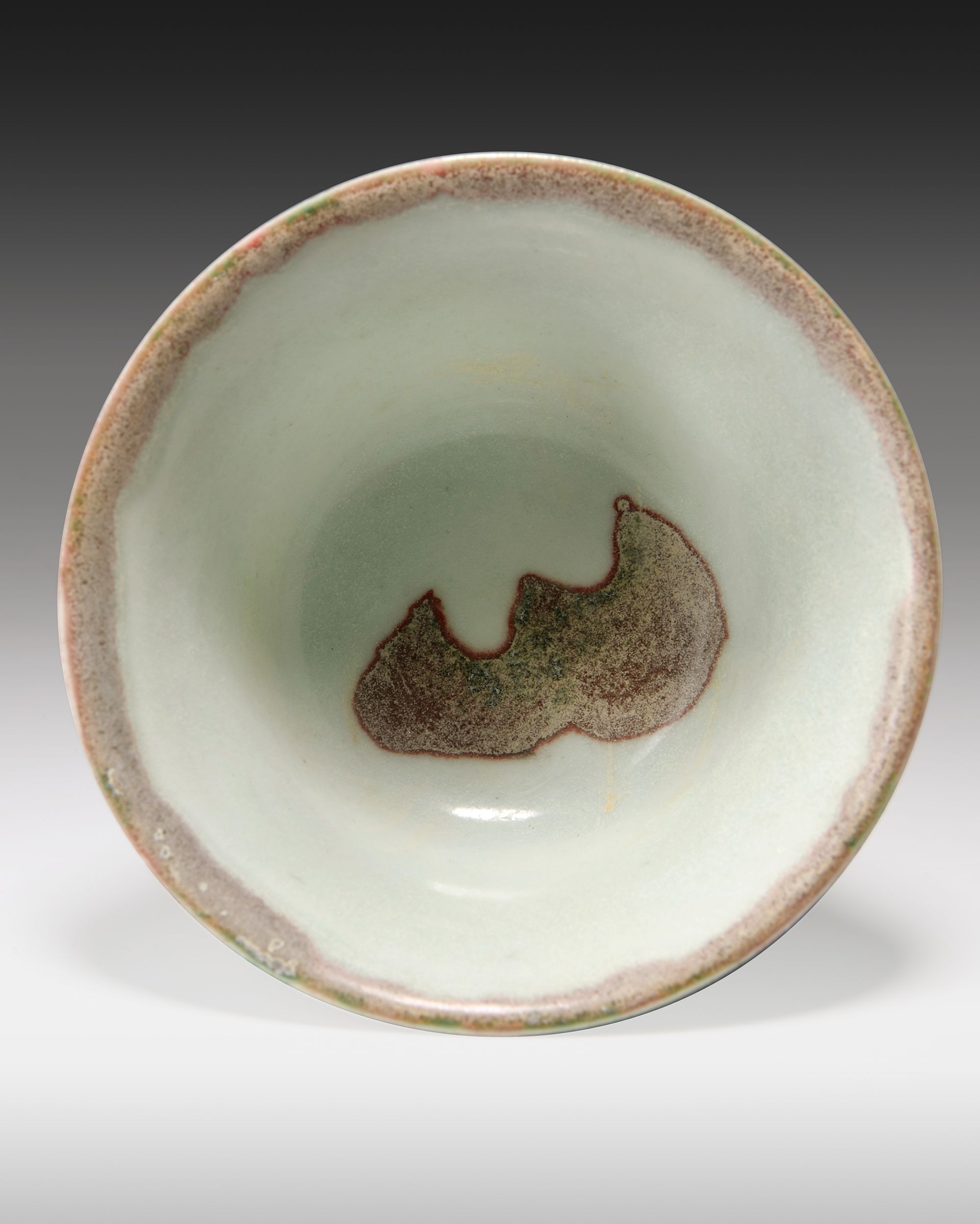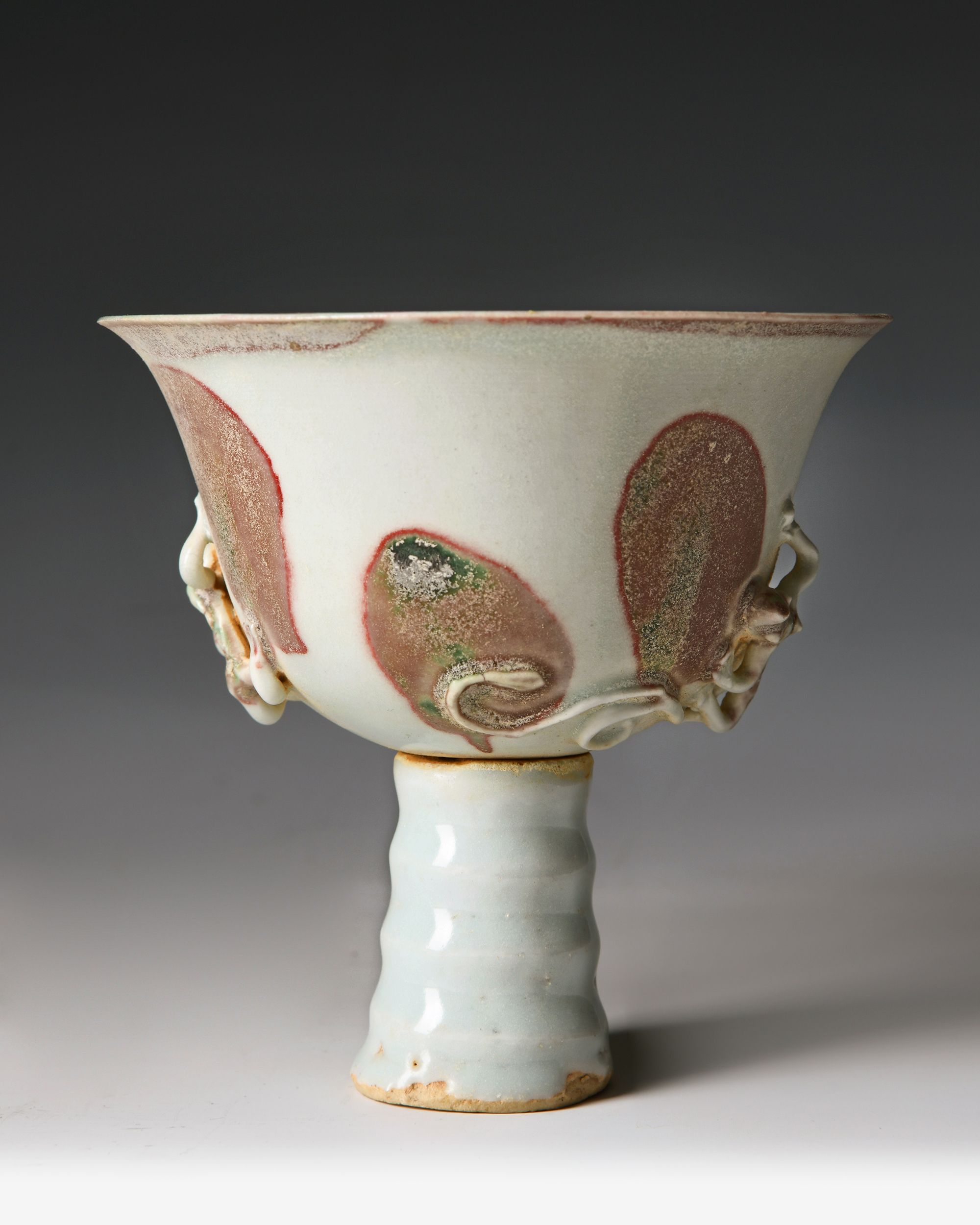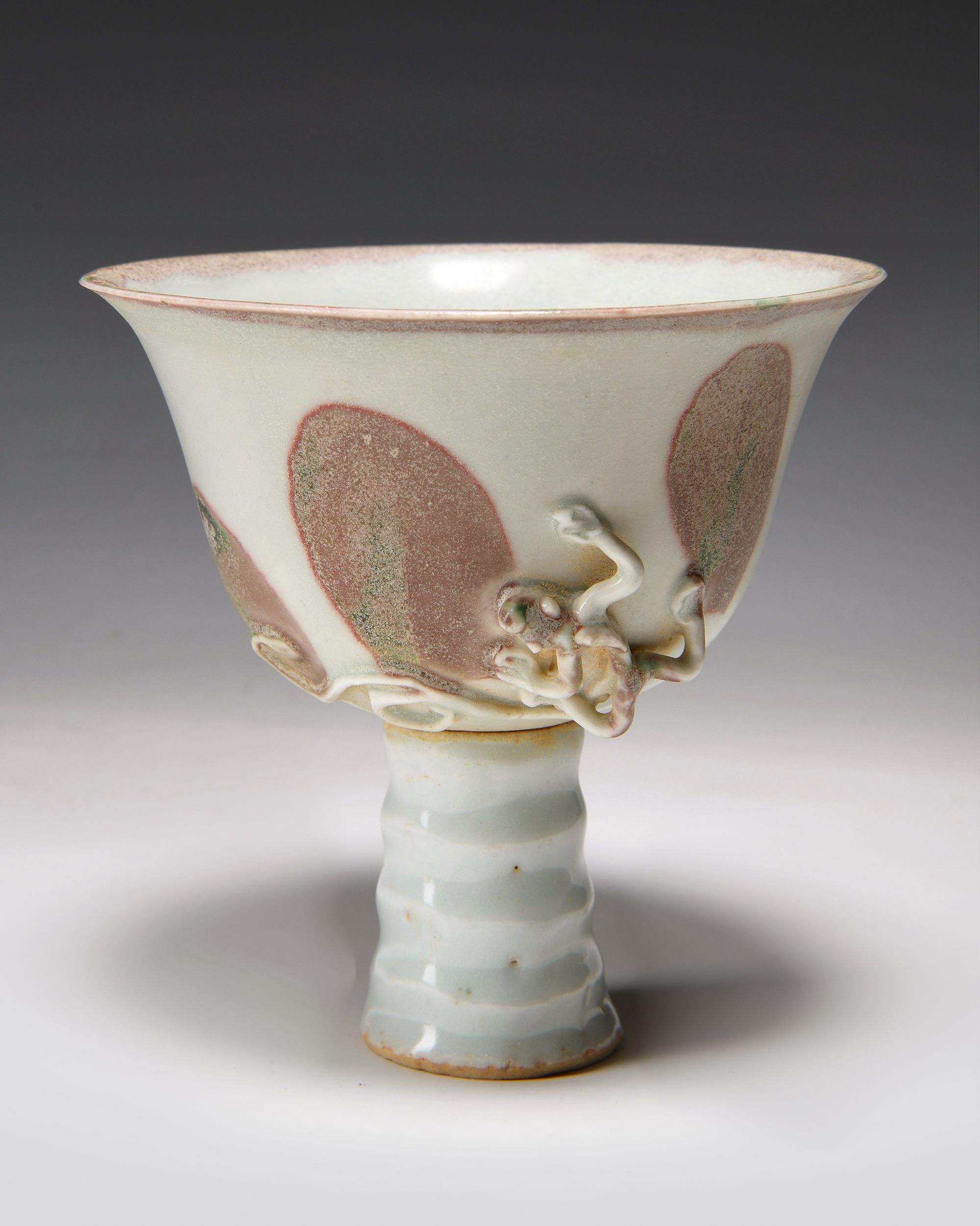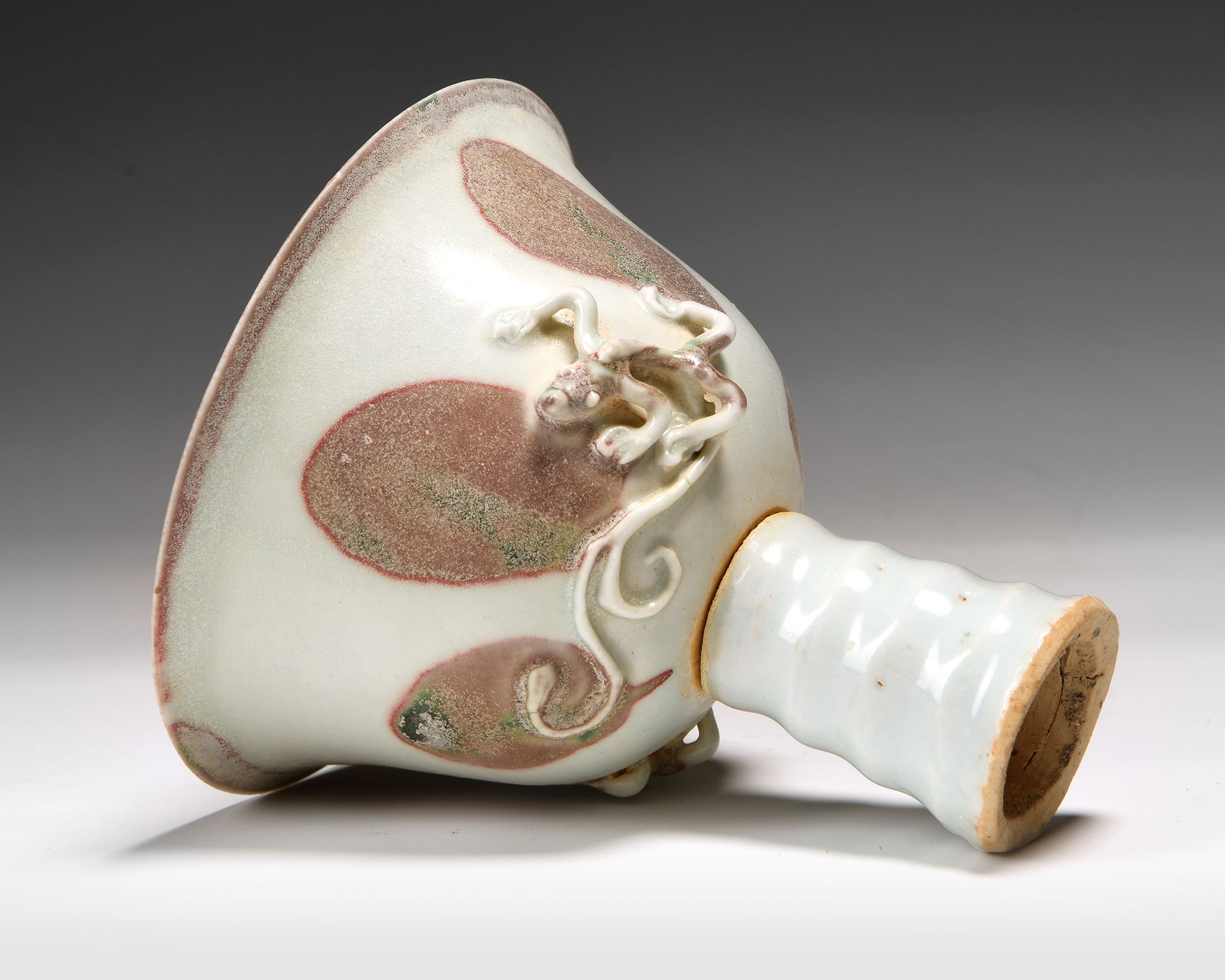A Chinese white glazed stem cup, decorated in high relief with two chilong with ribbed base, with deep underglaze copper red splashes. 11 by 11 cm.