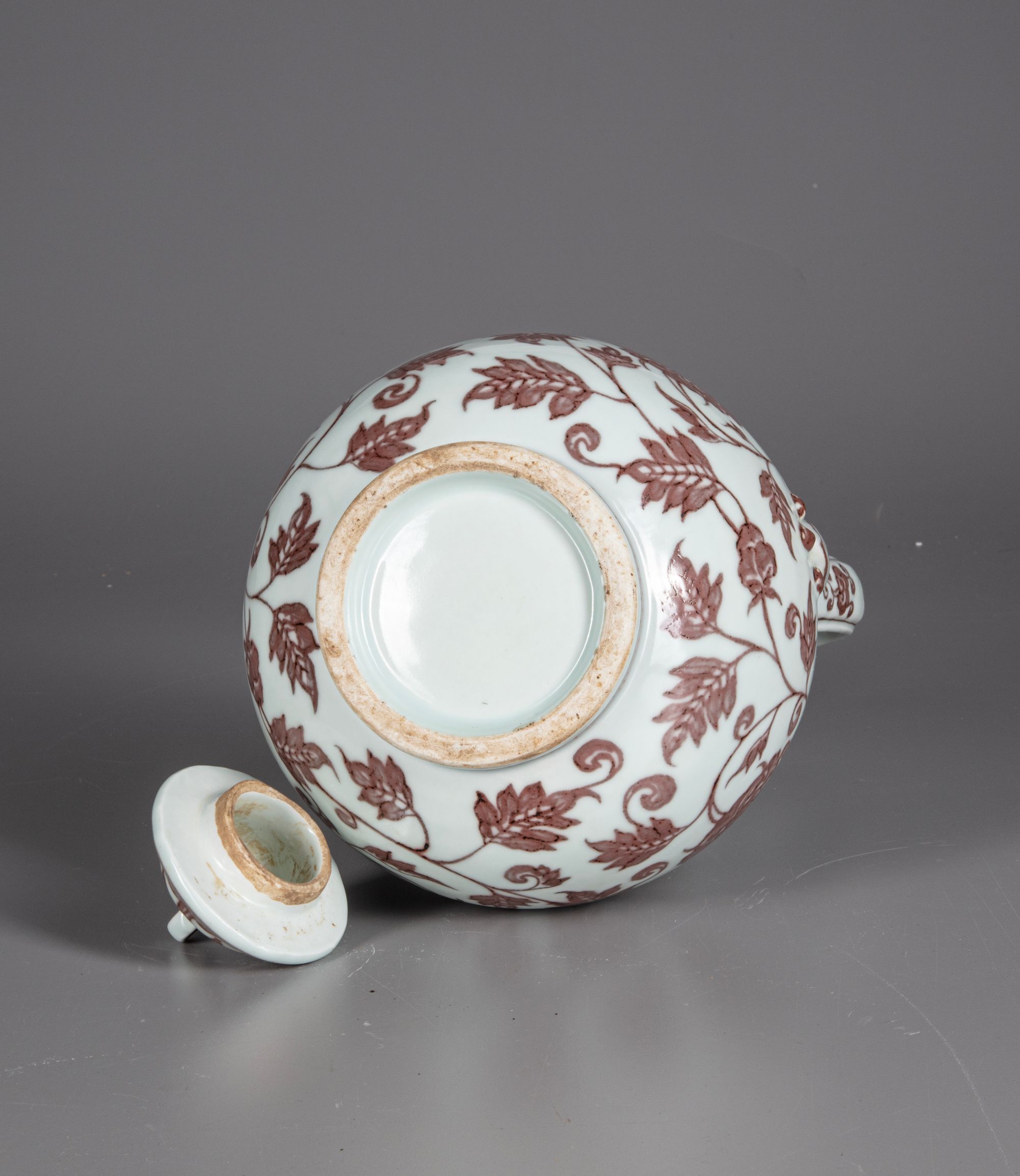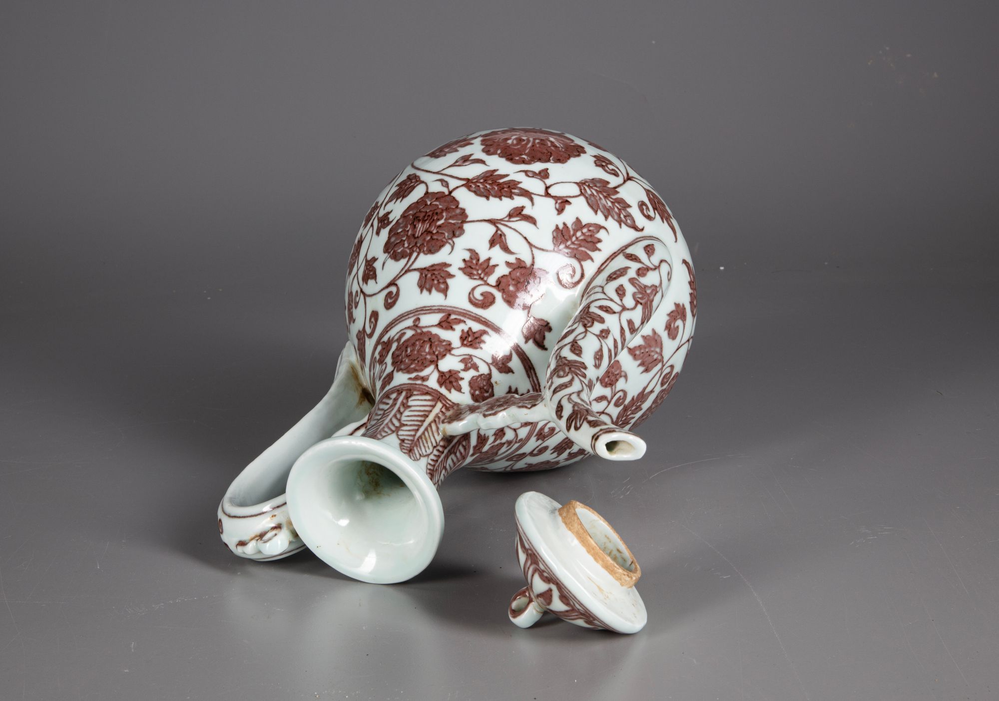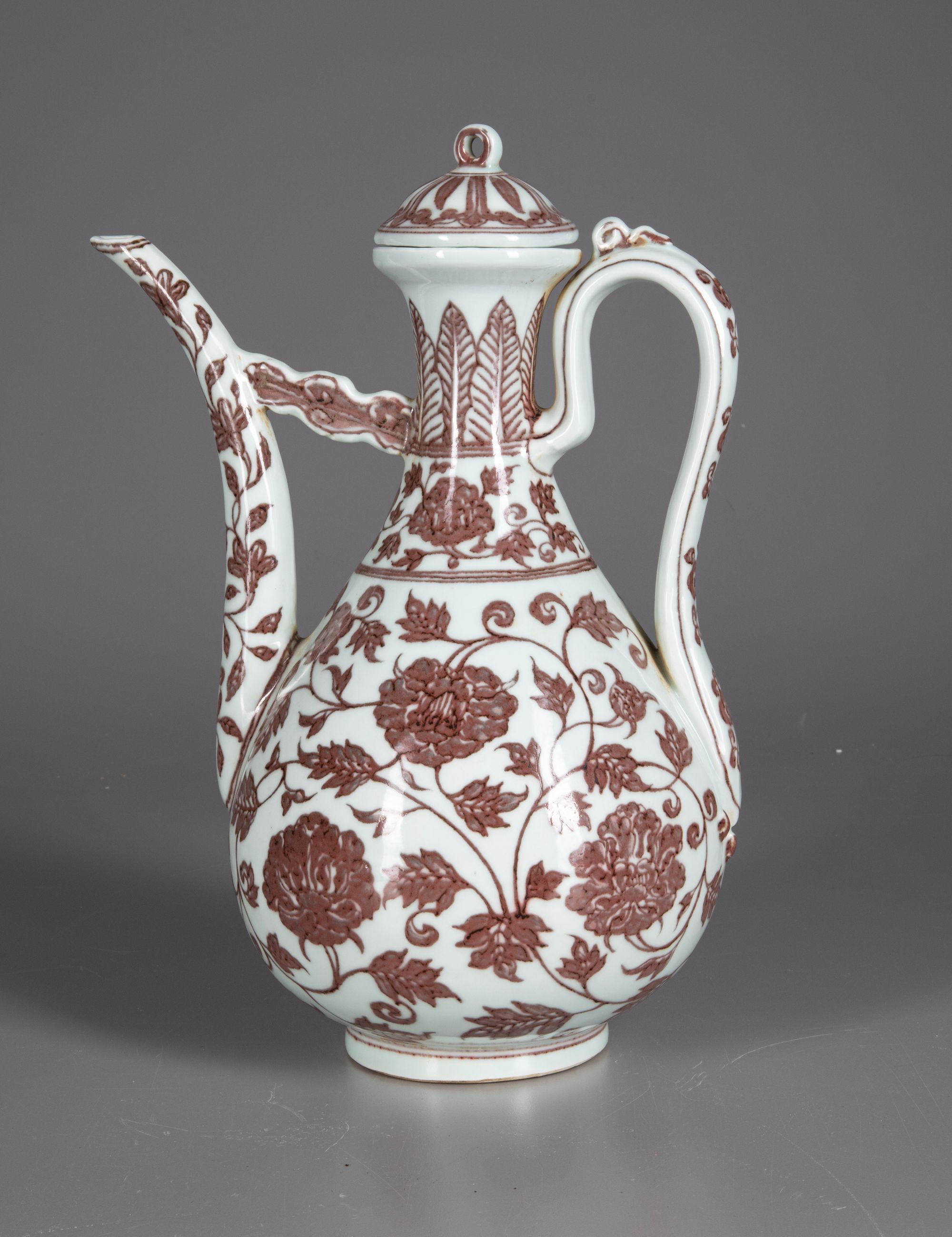 The pear-shaped body with a curved spout, joined to the neck with a cloud-shaped strut, opposite an arched loop handle terminating in three moulded bosses simulating pegs holding the handle in place, painted in copper red with characteristic 'heaping and piling', with a large composite floral meander, the open blooms including peony, musk mallow, lotus, camellia and chrysanthemum enclosed by scrolling stems with their characteristic leaves. further decorated with flower scrolls on the spout, a similar band on the handle, lotus-scroll below overlapping upright plantain leaves on the flaring neck.