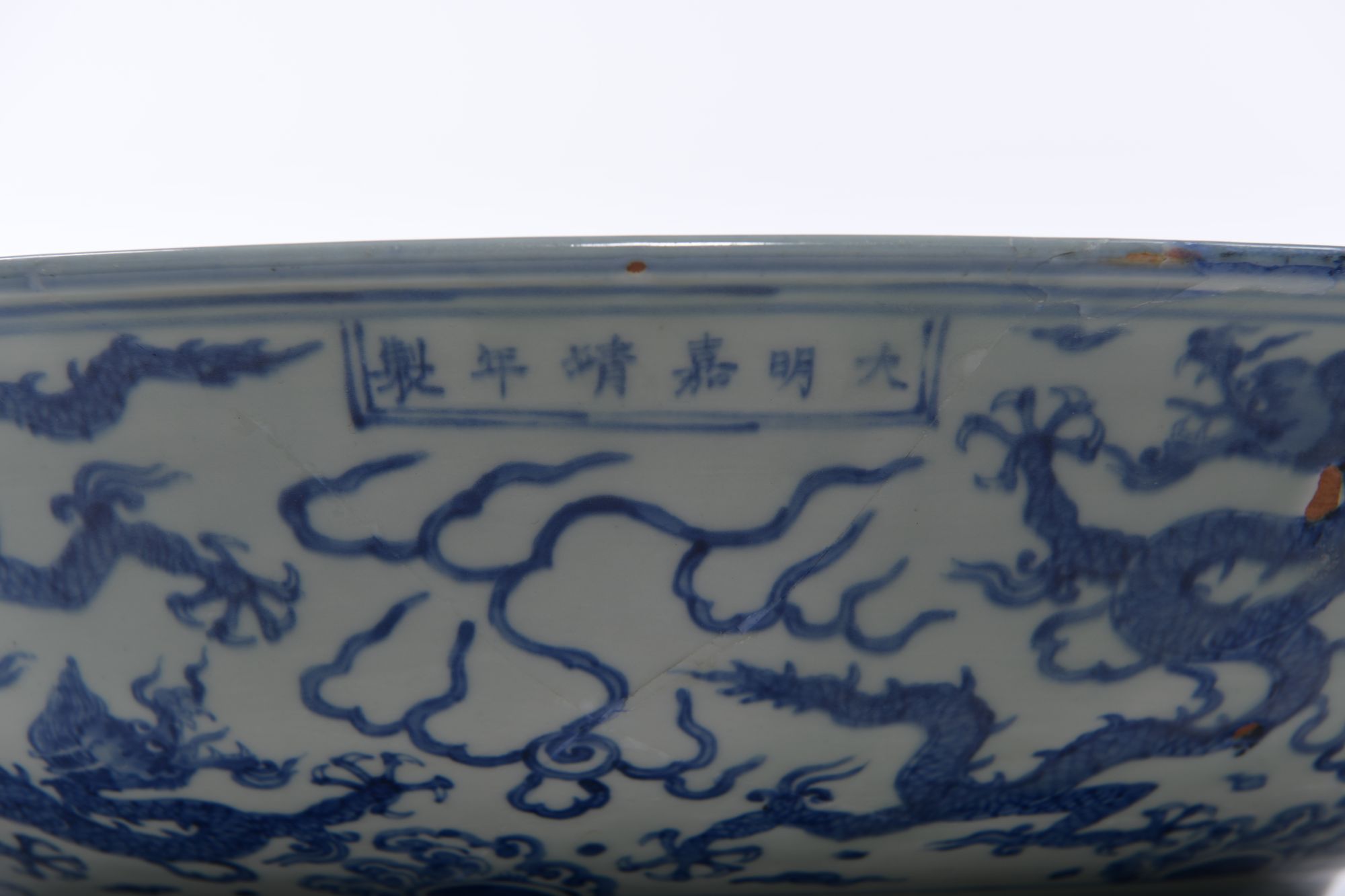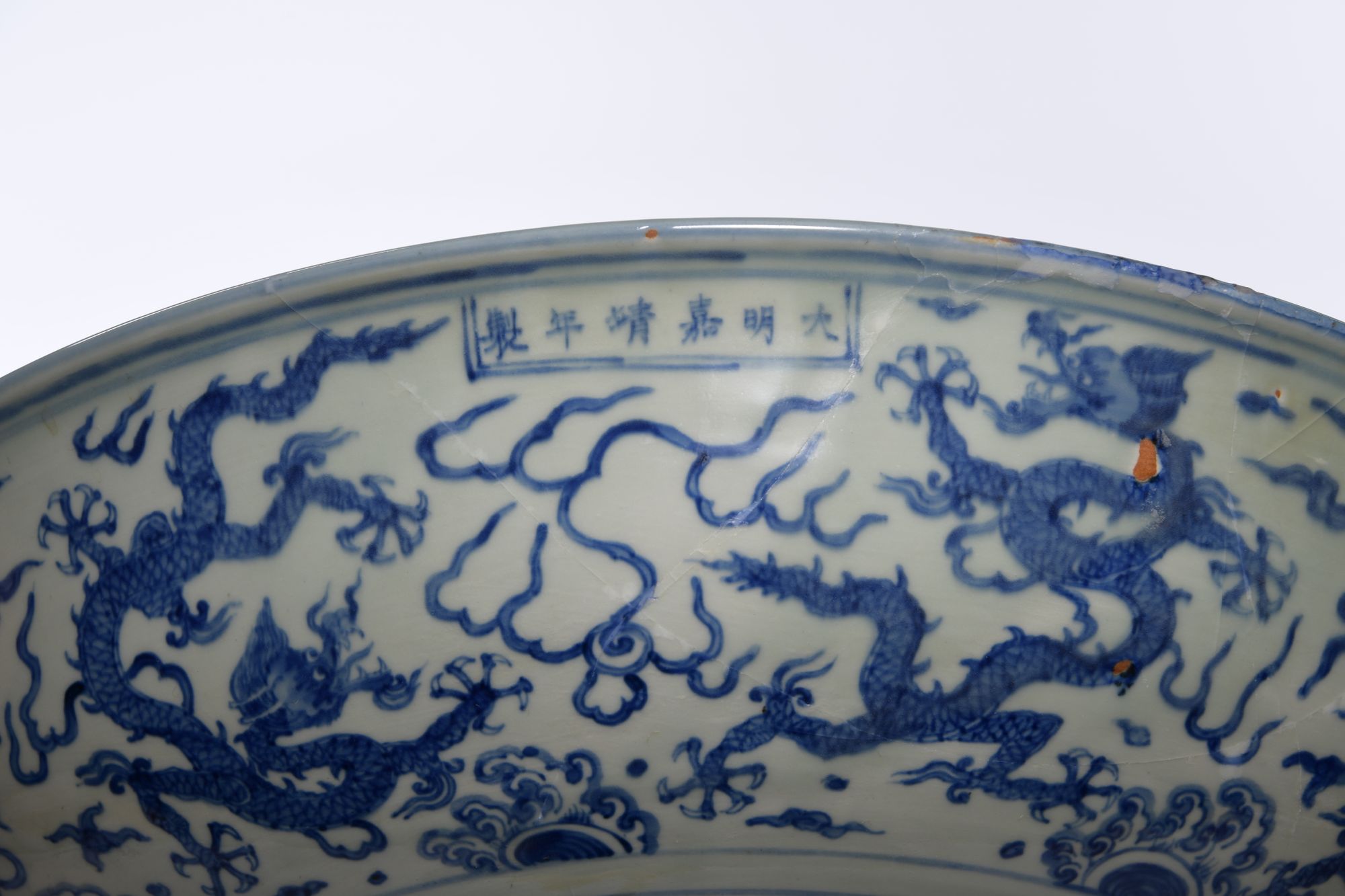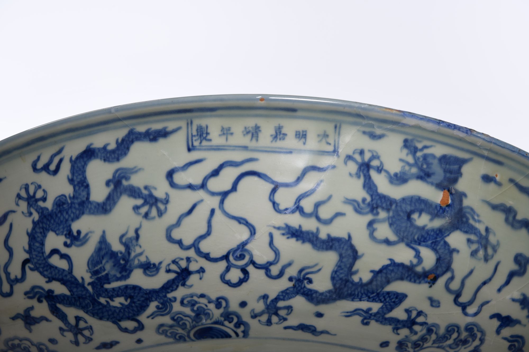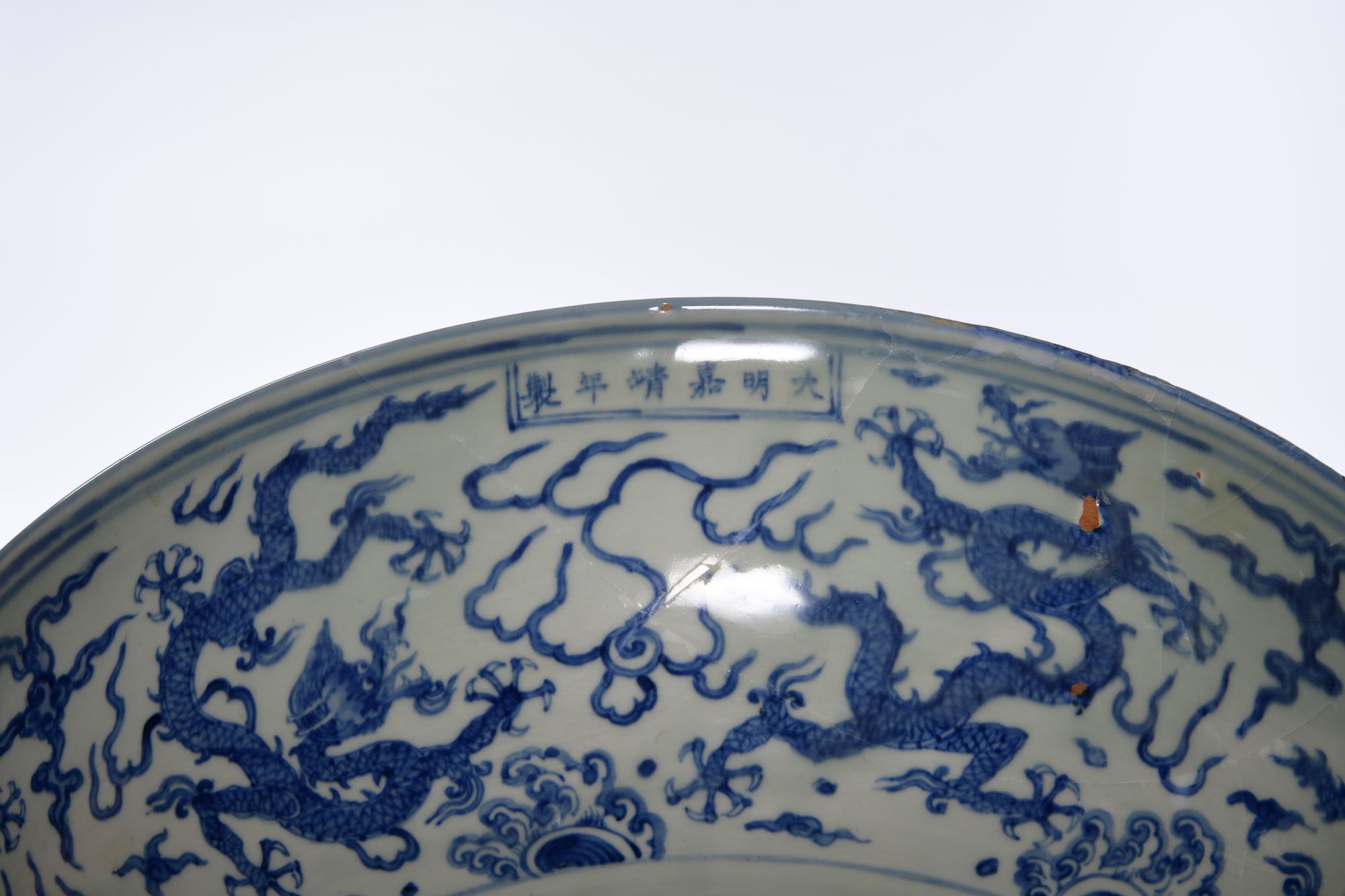 A large Chinese porcelain dish decorated to the interior with a central roundel enclosing two five-clawed dragons chasing a flaming pearl amongst clouds on seawaves. The exterior with nine dragons in different postures chasing flaming pearls and a Chinese Jiajing six character mark.