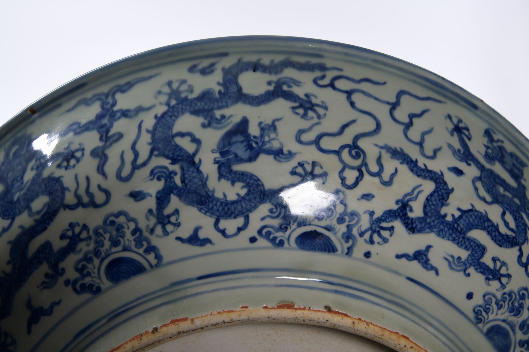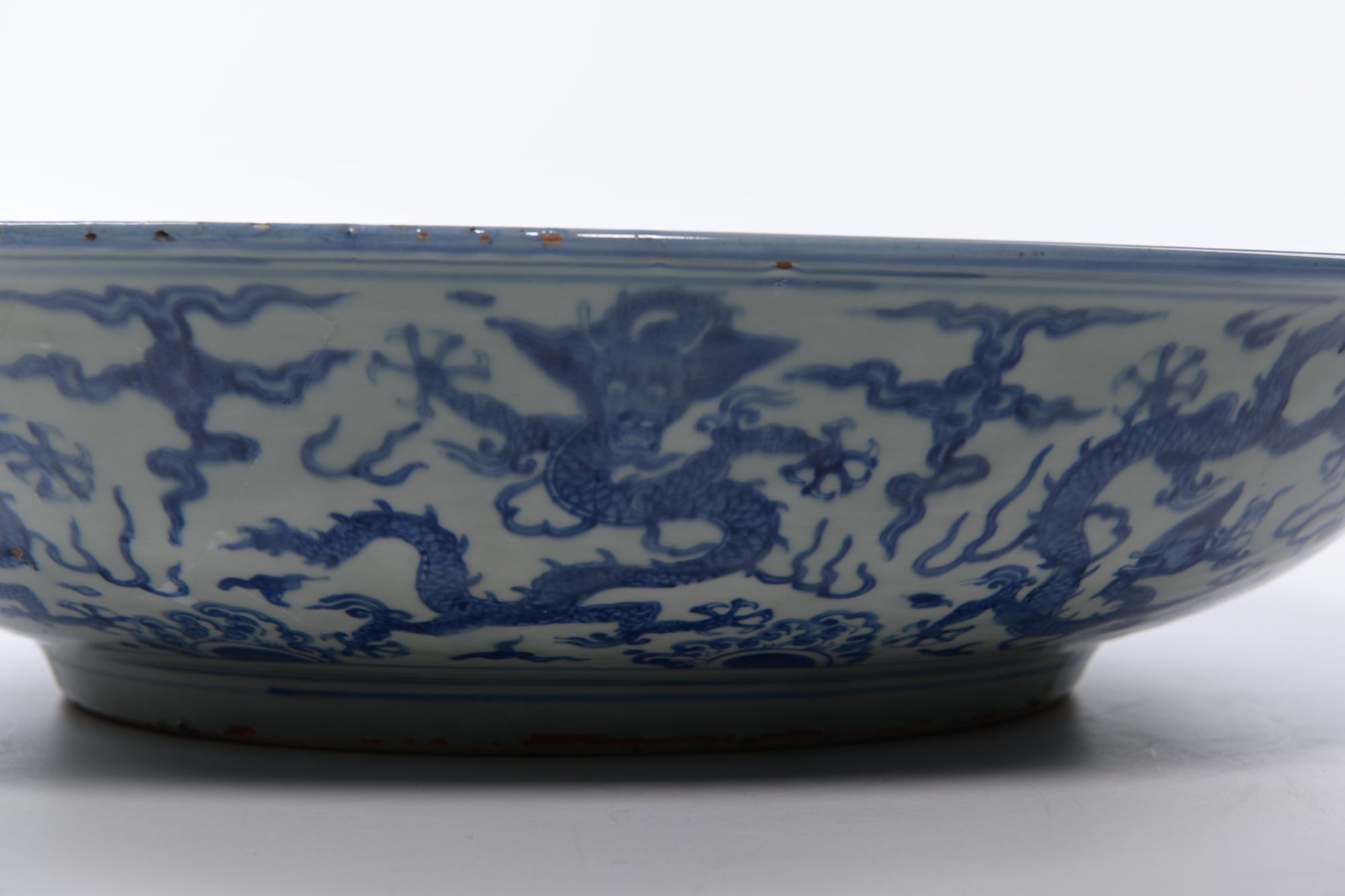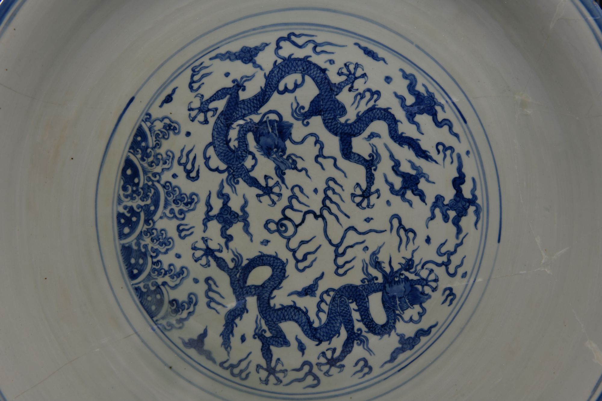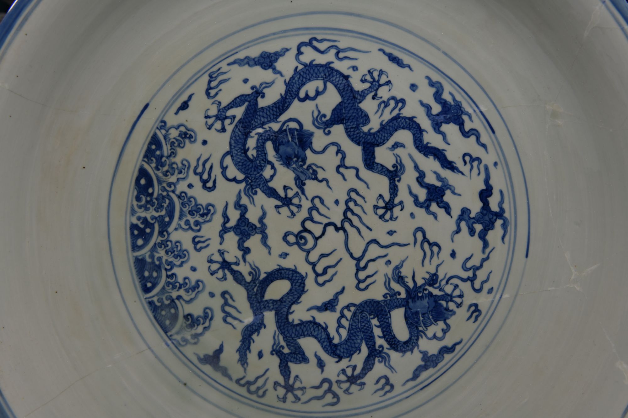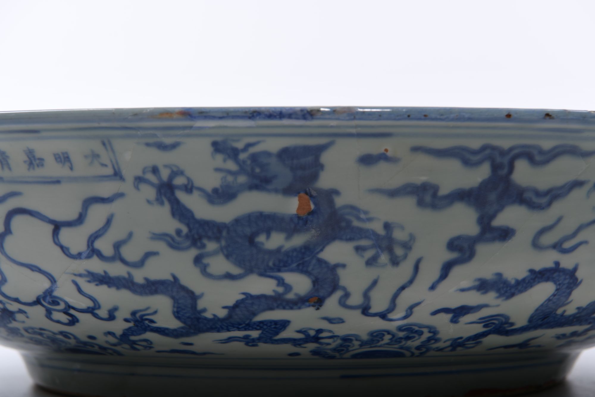 A large Chinese porcelain dish decorated to the interior with a central roundel enclosing two five-clawed dragons chasing a flaming pearl amongst clouds on seawaves. The exterior with nine dragons in different postures chasing flaming pearls and a Chinese Jiajing six character mark.