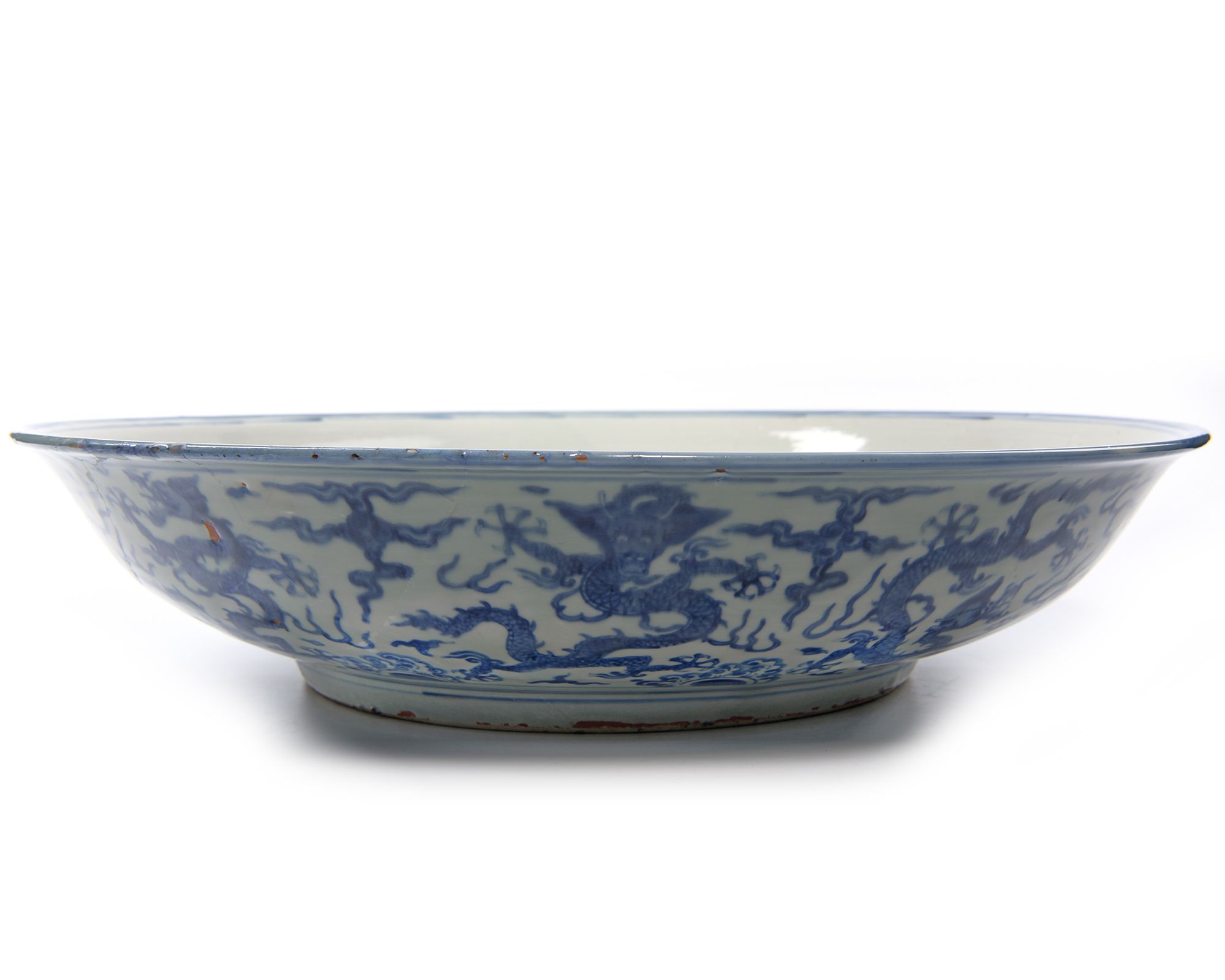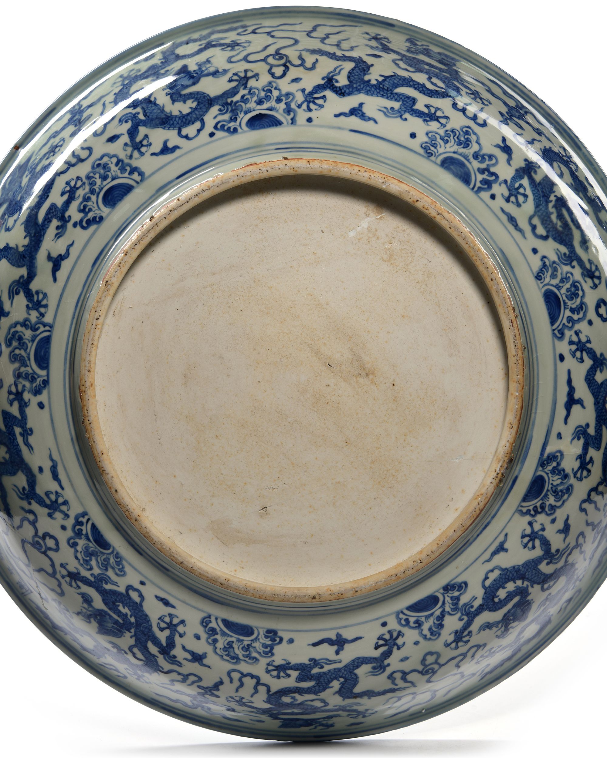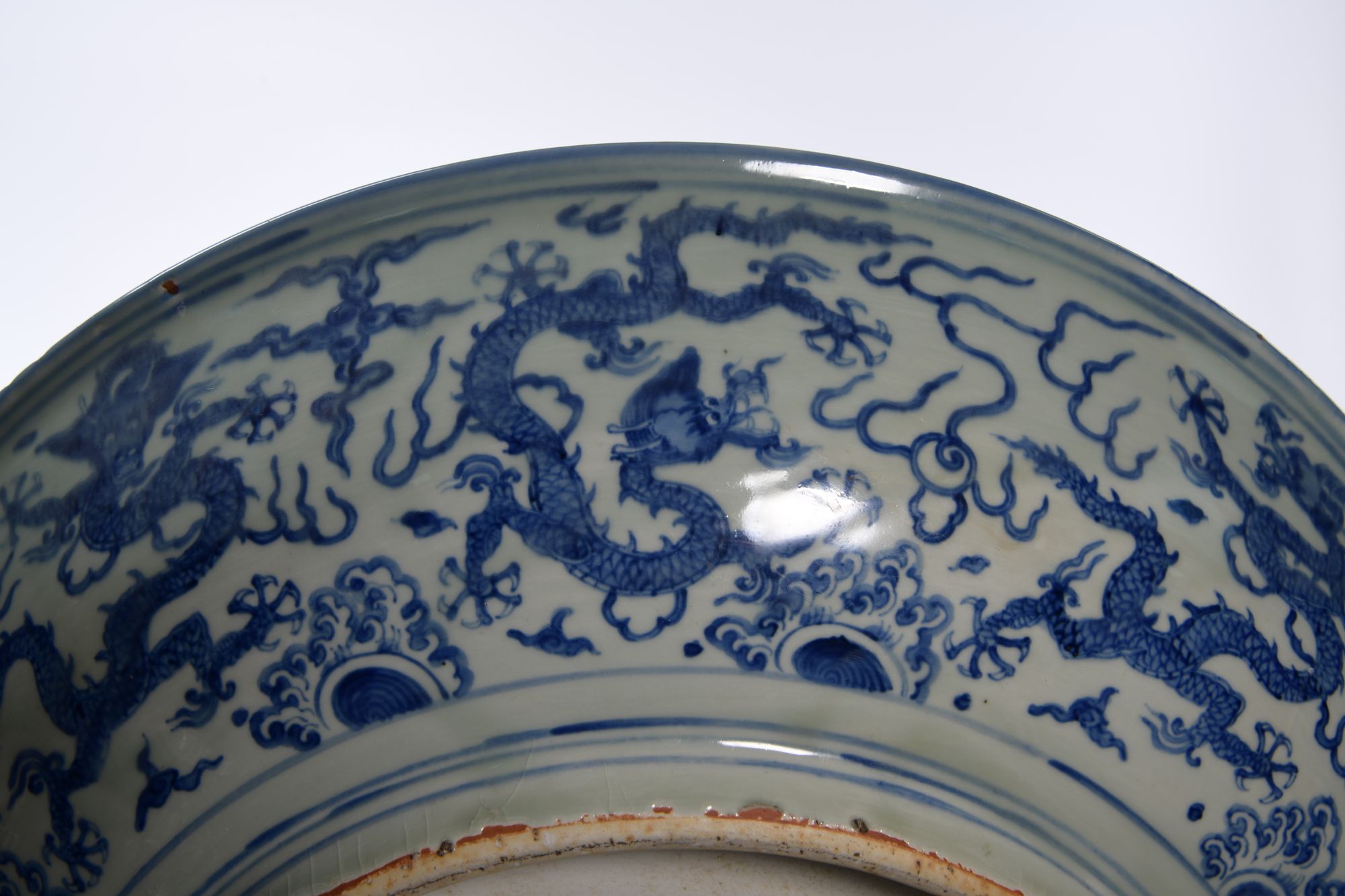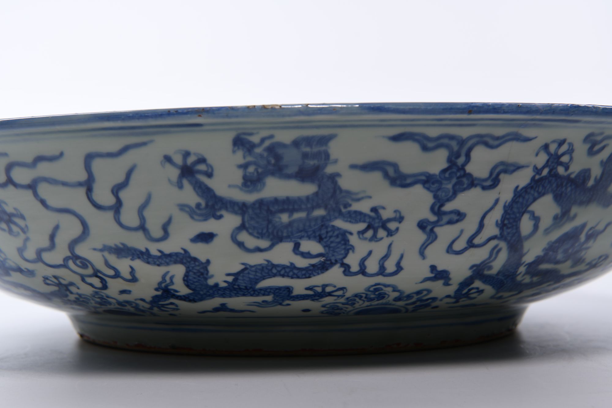 A large Chinese porcelain dish decorated to the interior with a central roundel enclosing two five-clawed dragons chasing a flaming pearl amongst clouds on seawaves. The exterior with nine dragons in different postures chasing flaming pearls and a Chinese Jiajing six character mark.