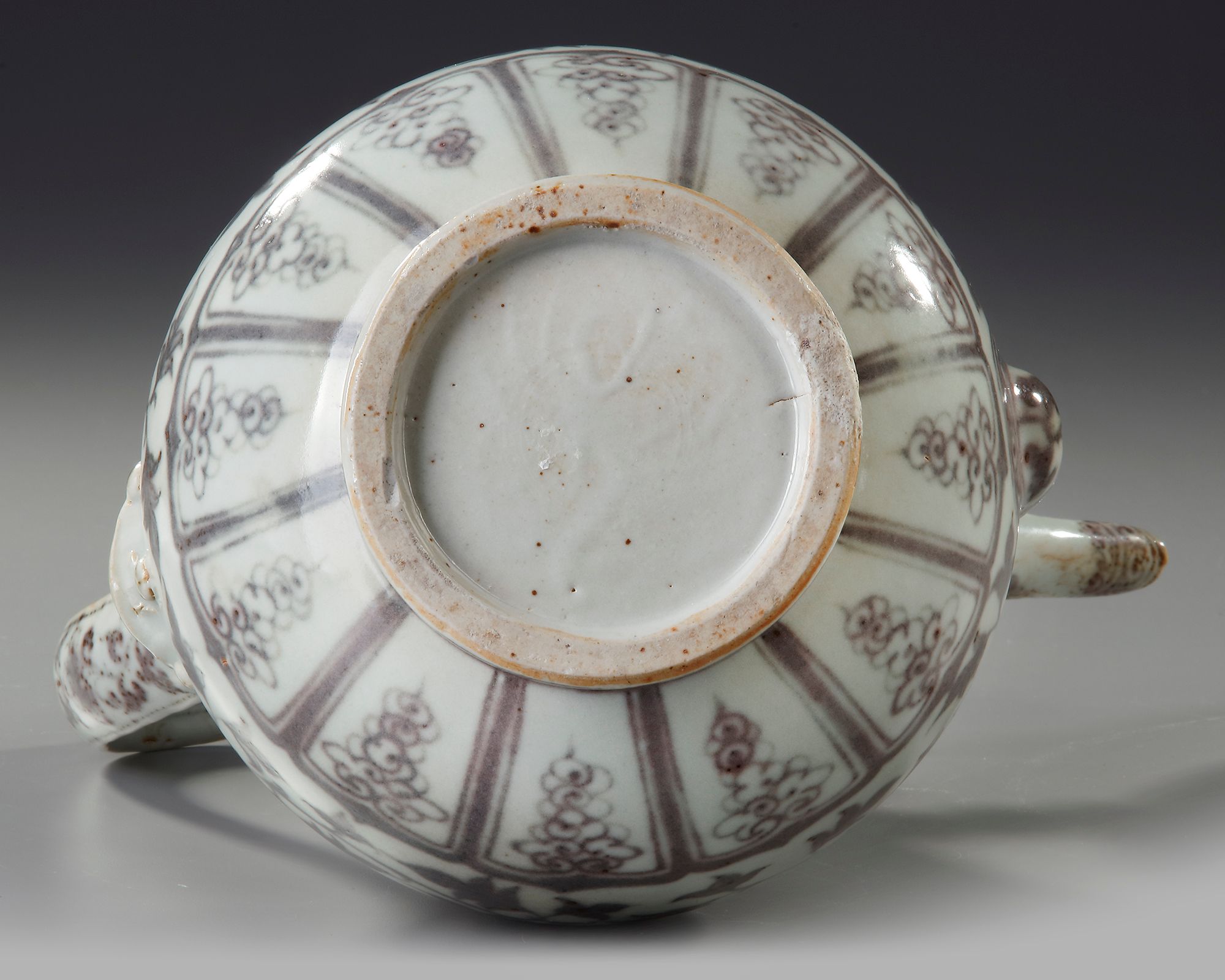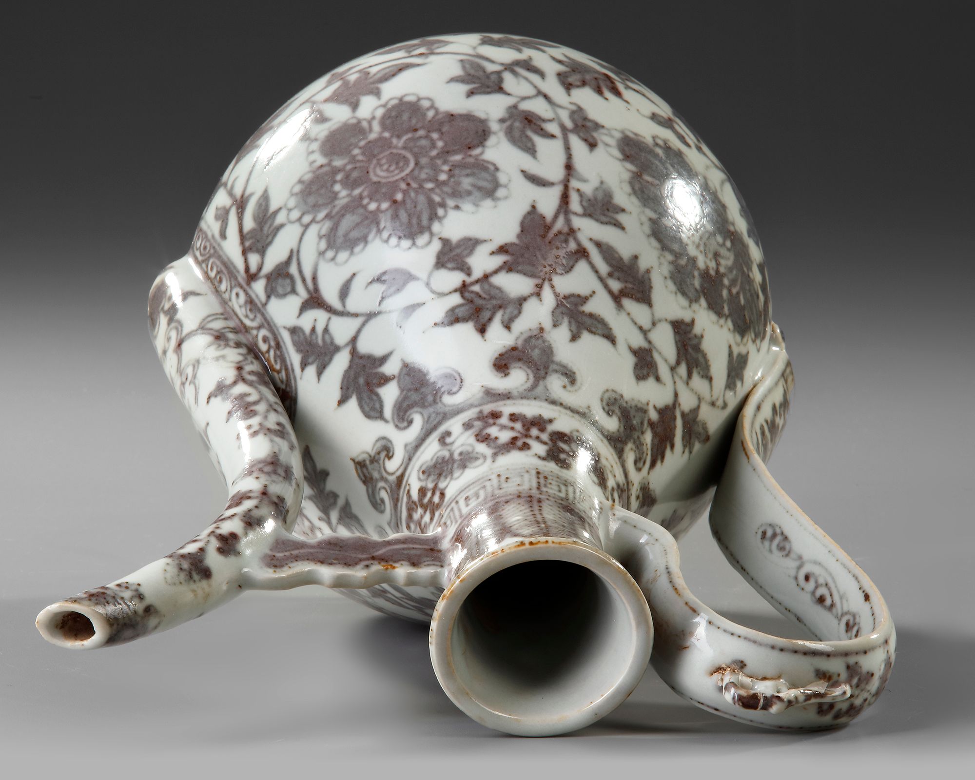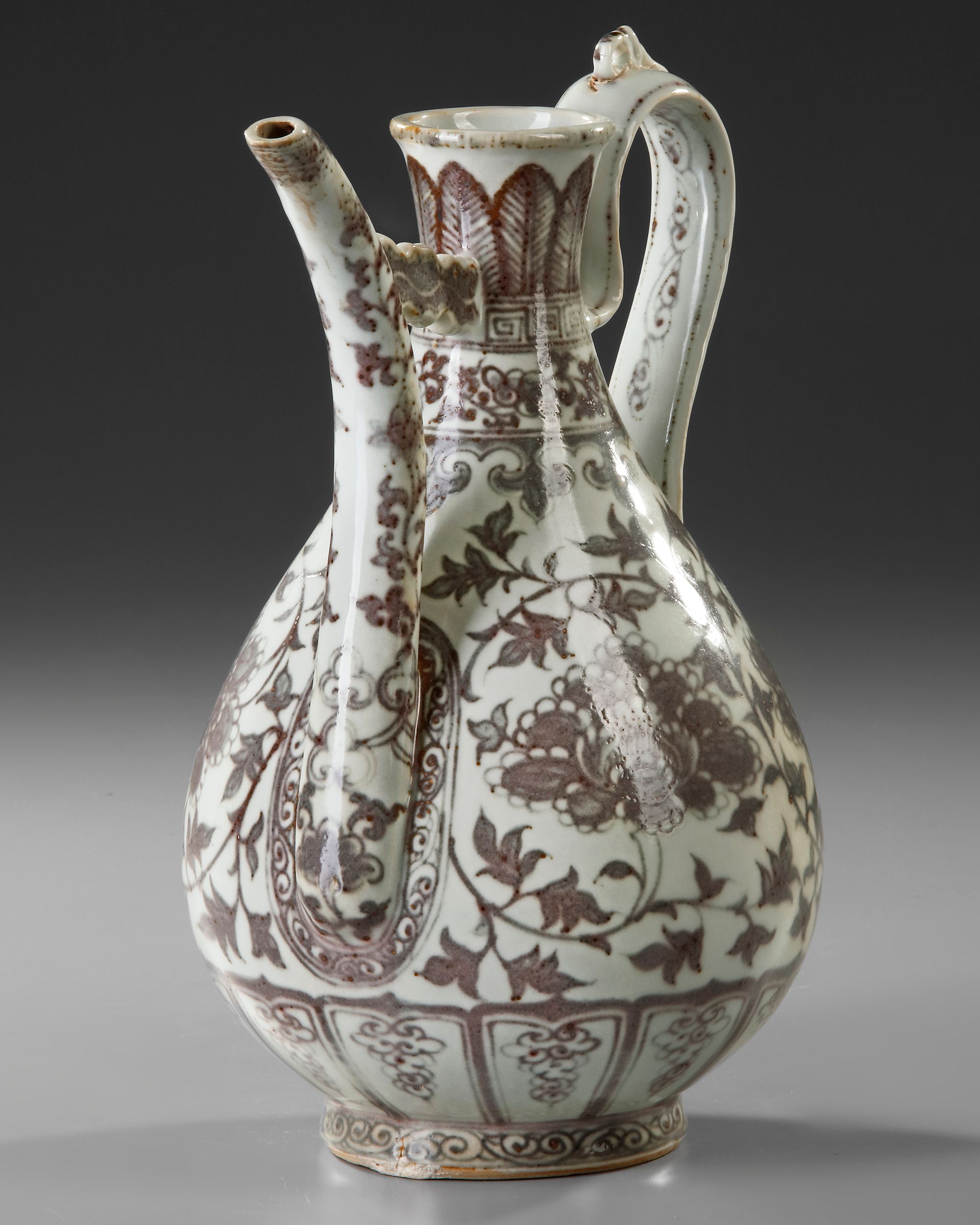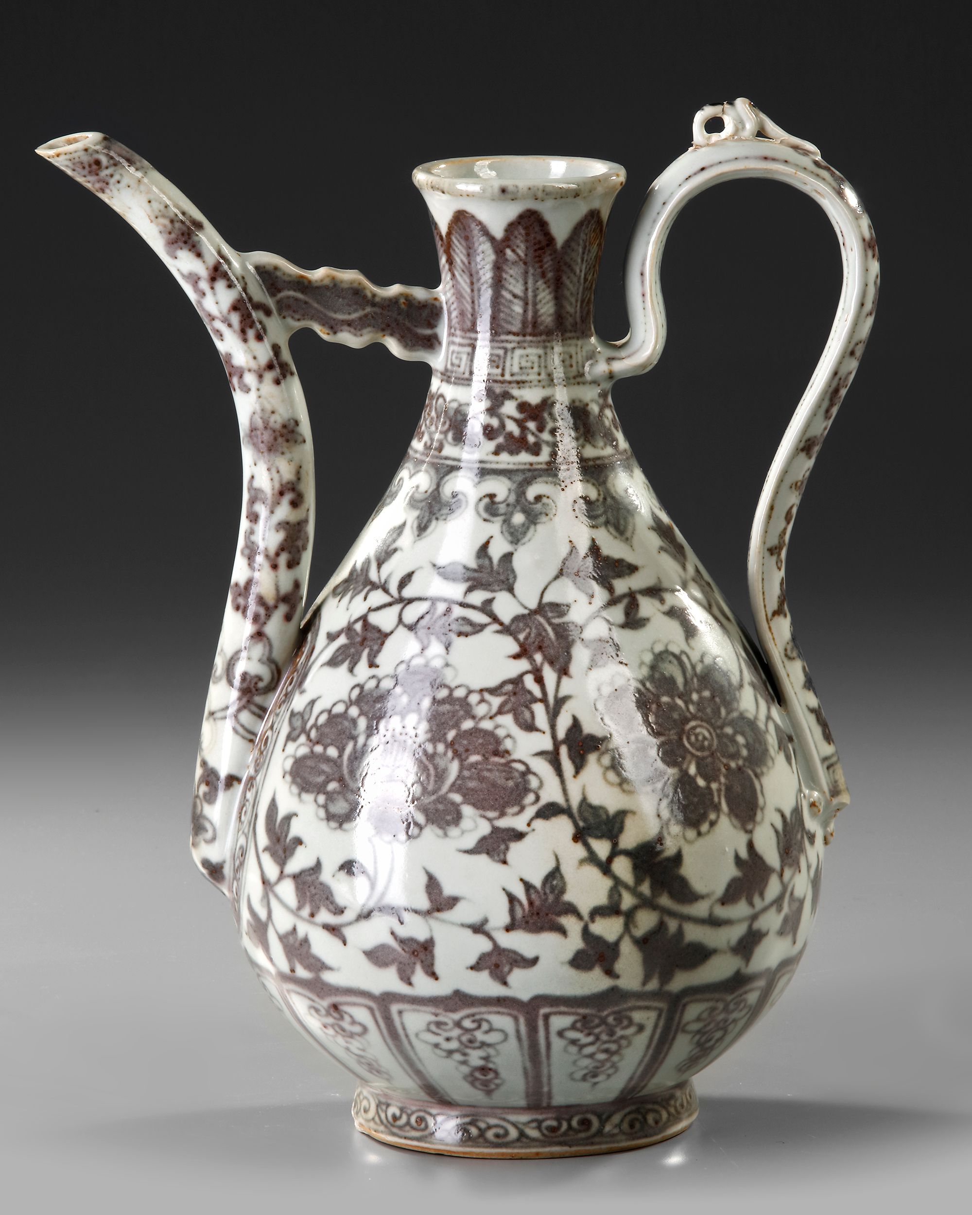 The pear-shaped body of the ewer painted with a peony blossoming scroll, issuing two large blossoms on each side with leaves along the vine, the slender neck decorated under the square-lipped rim with overlapping plantain leaves above a band of flower scroll and a key fret chain, the arched strap-handle with scrolling lingzhi, and tapered spout similarly decorated with scrolling lotus, all supported on a low foot painted with a classic scroll band.