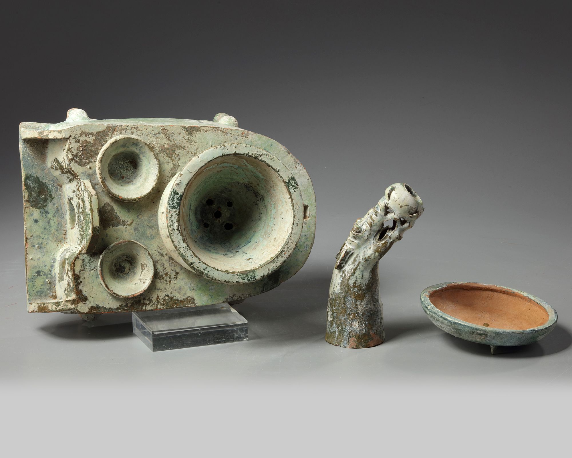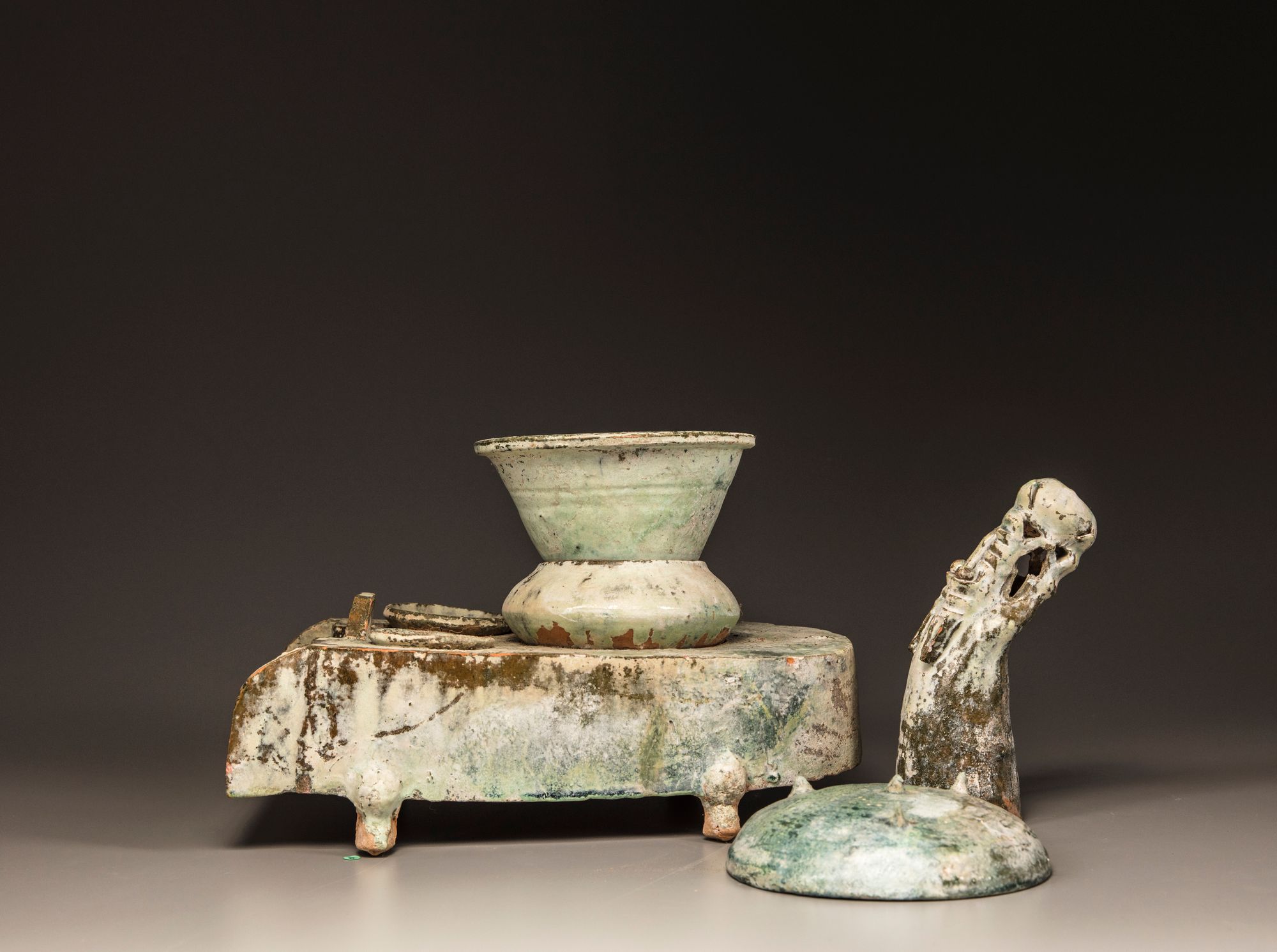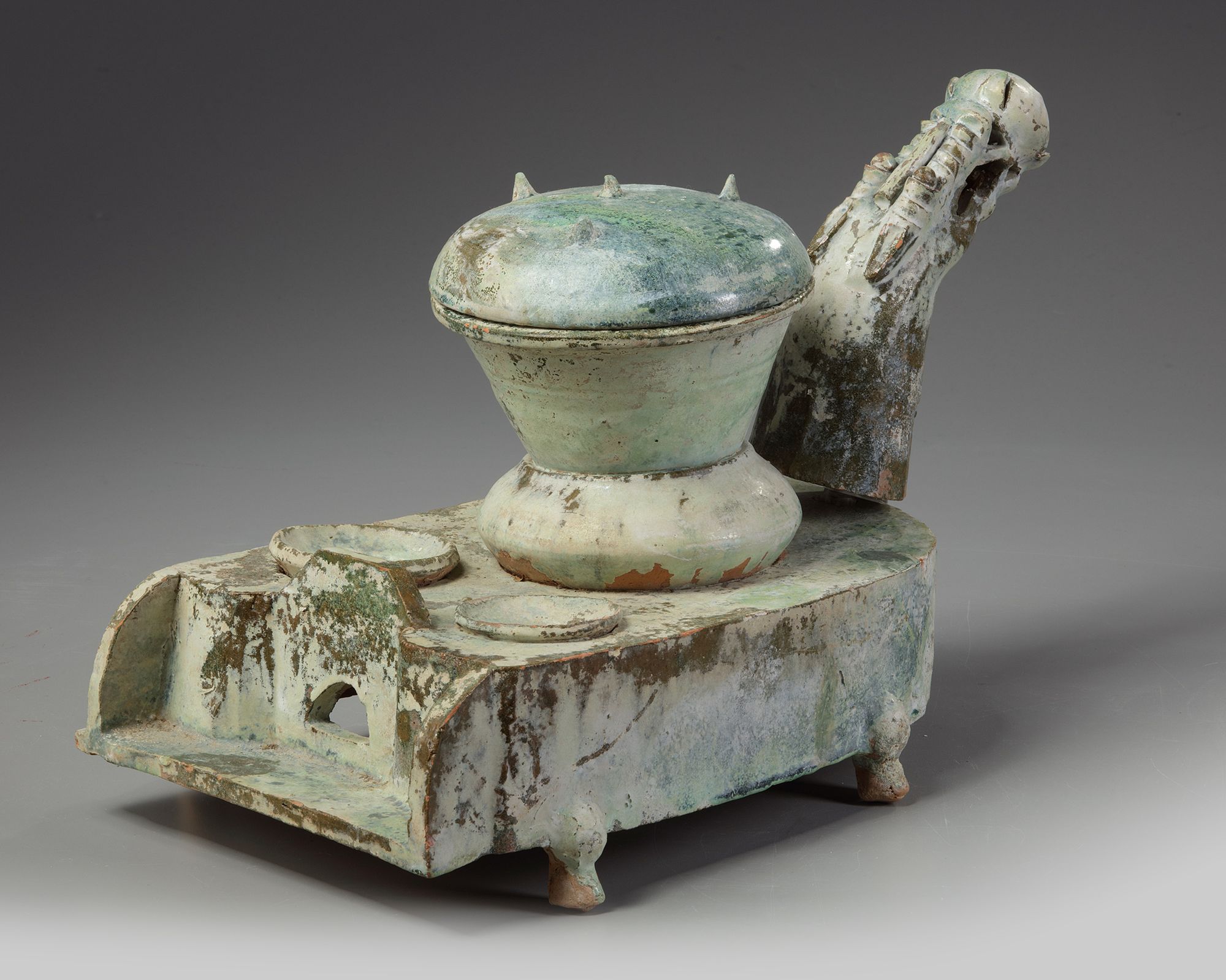 A similarly shaped stove with an undecorated chimney was excavated in Donggu River, Gaotang and resides in the collection of Shandong Provincial Museum and was featured in the China Institute Gallery exhibition, 'Providing For the Afterlife: ‘Brilliant Artifacts’ From Shandong', New York, 3 February - 4 June 2005, cat no. 25.