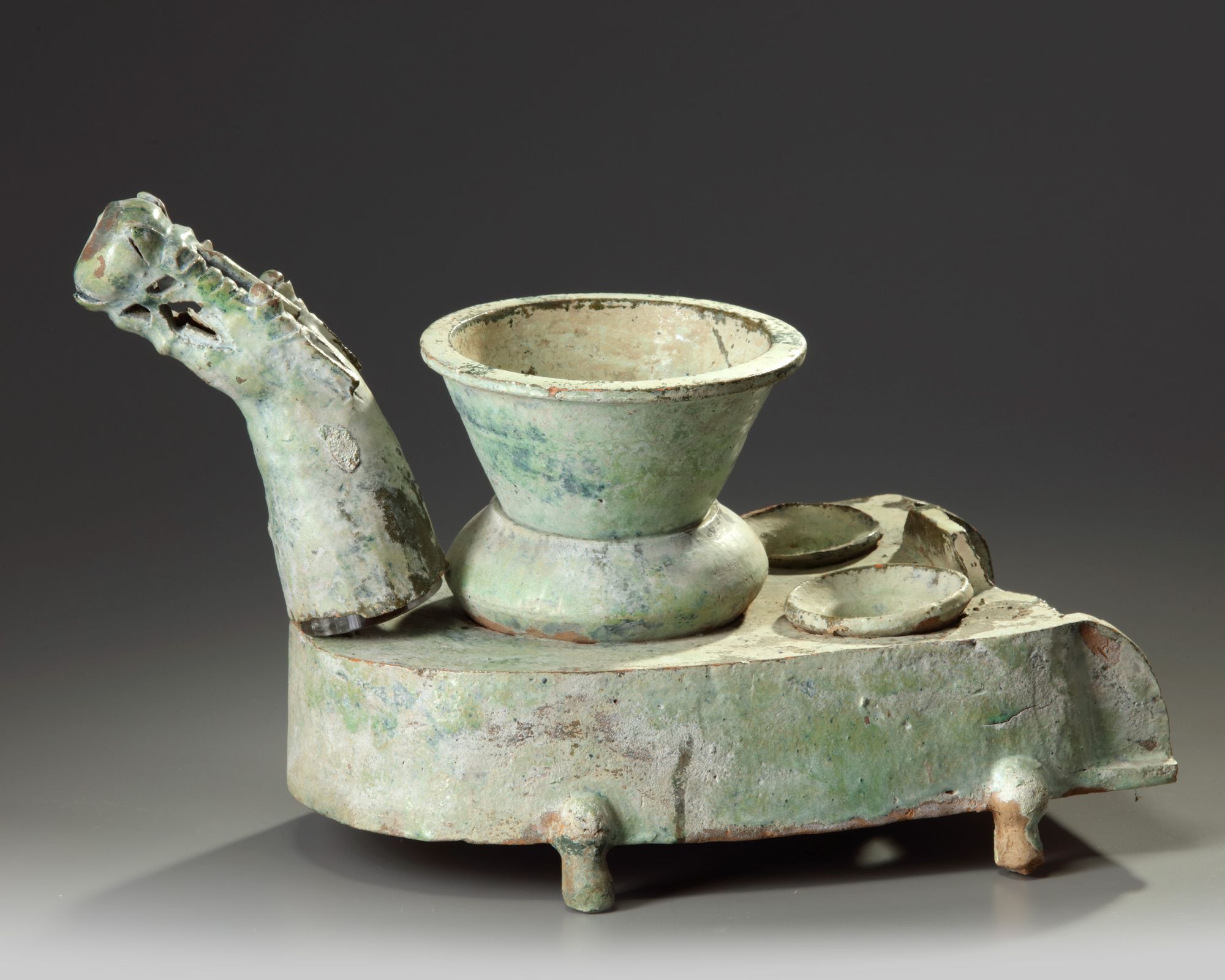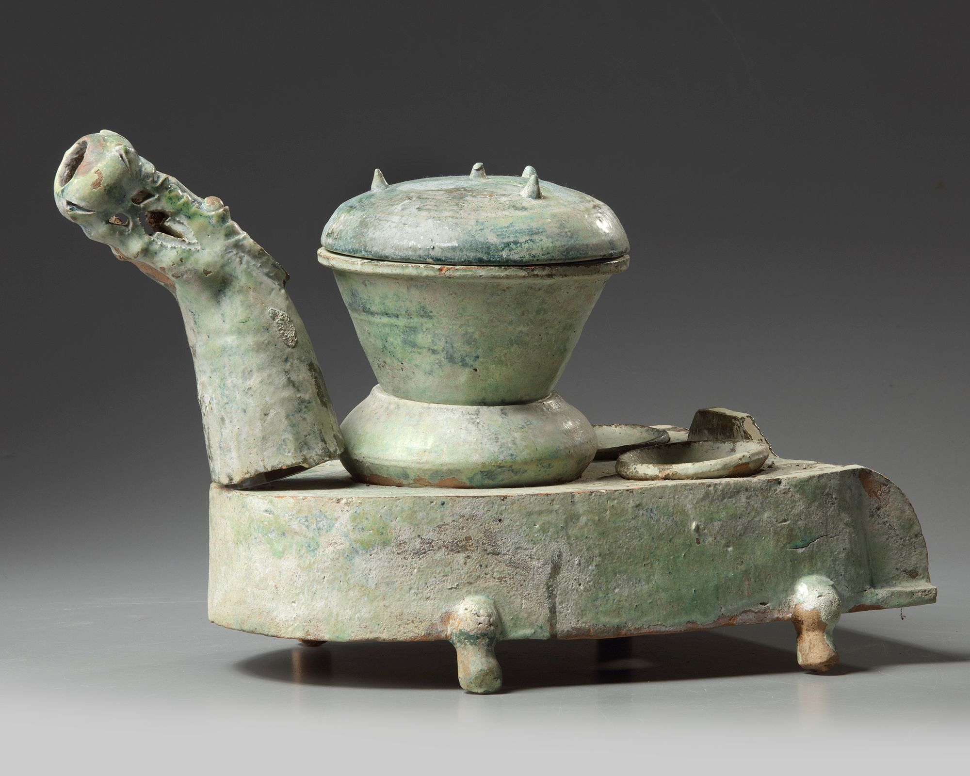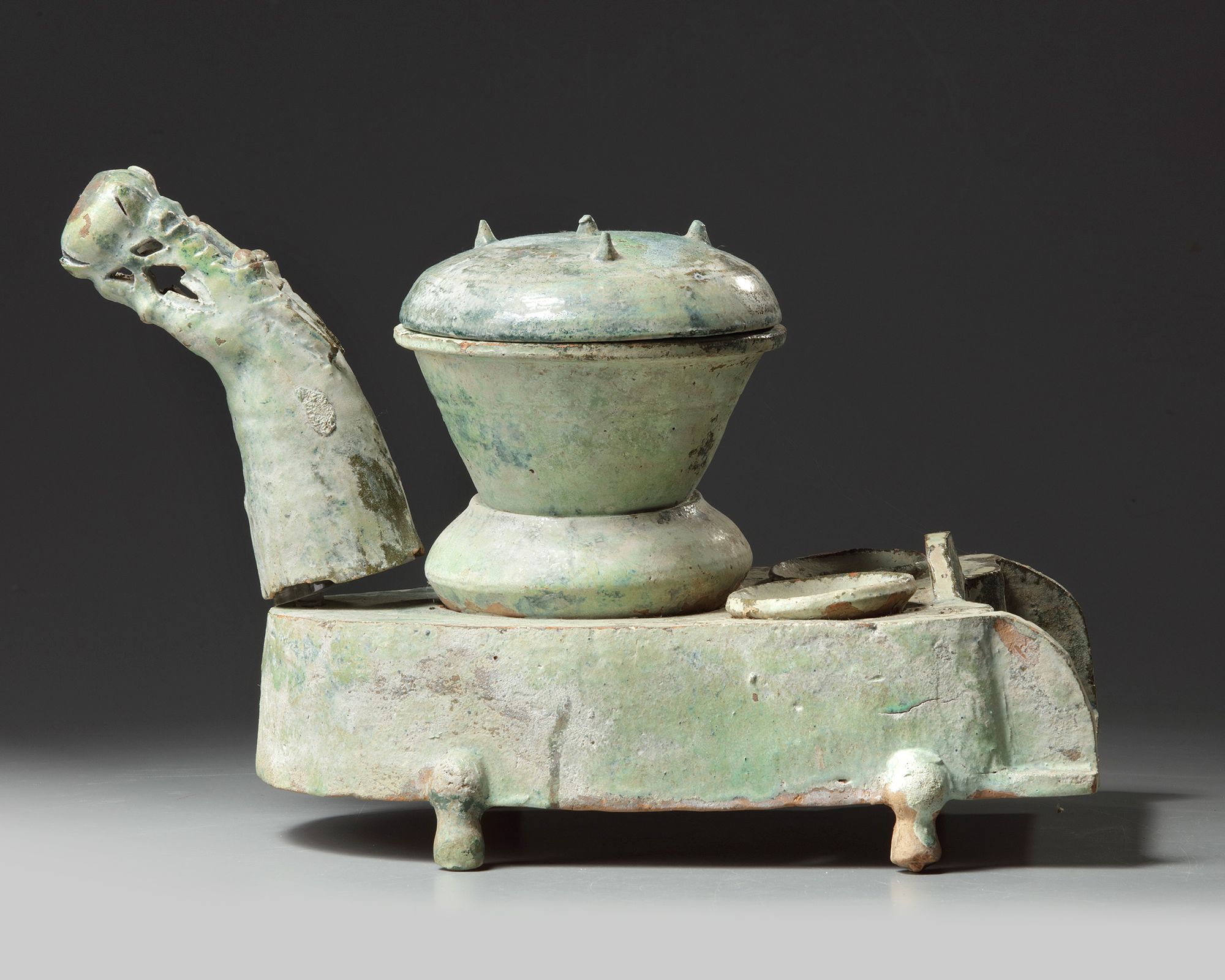 The elongated D-shaped stove stands on four cabriole feet with three cooktops, two with pans and one with a wok accompanied with a domed cover. The dragon head spout held with a pyrex attachment.