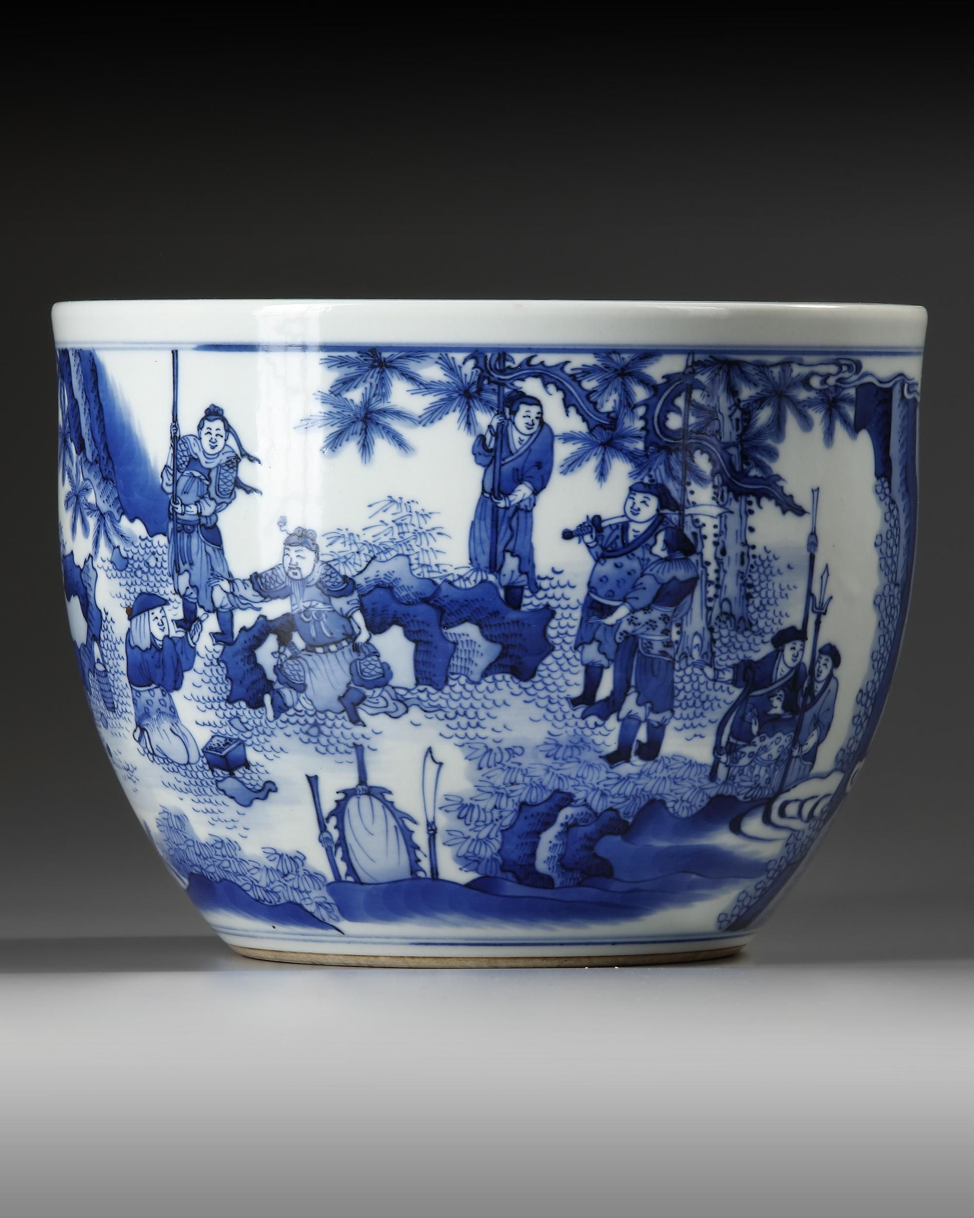 The exterior is decorated with a continuous scene of scholars, officials, soldiers, and attendants in a mountainous landscape. H 17by 23.5 cm diam