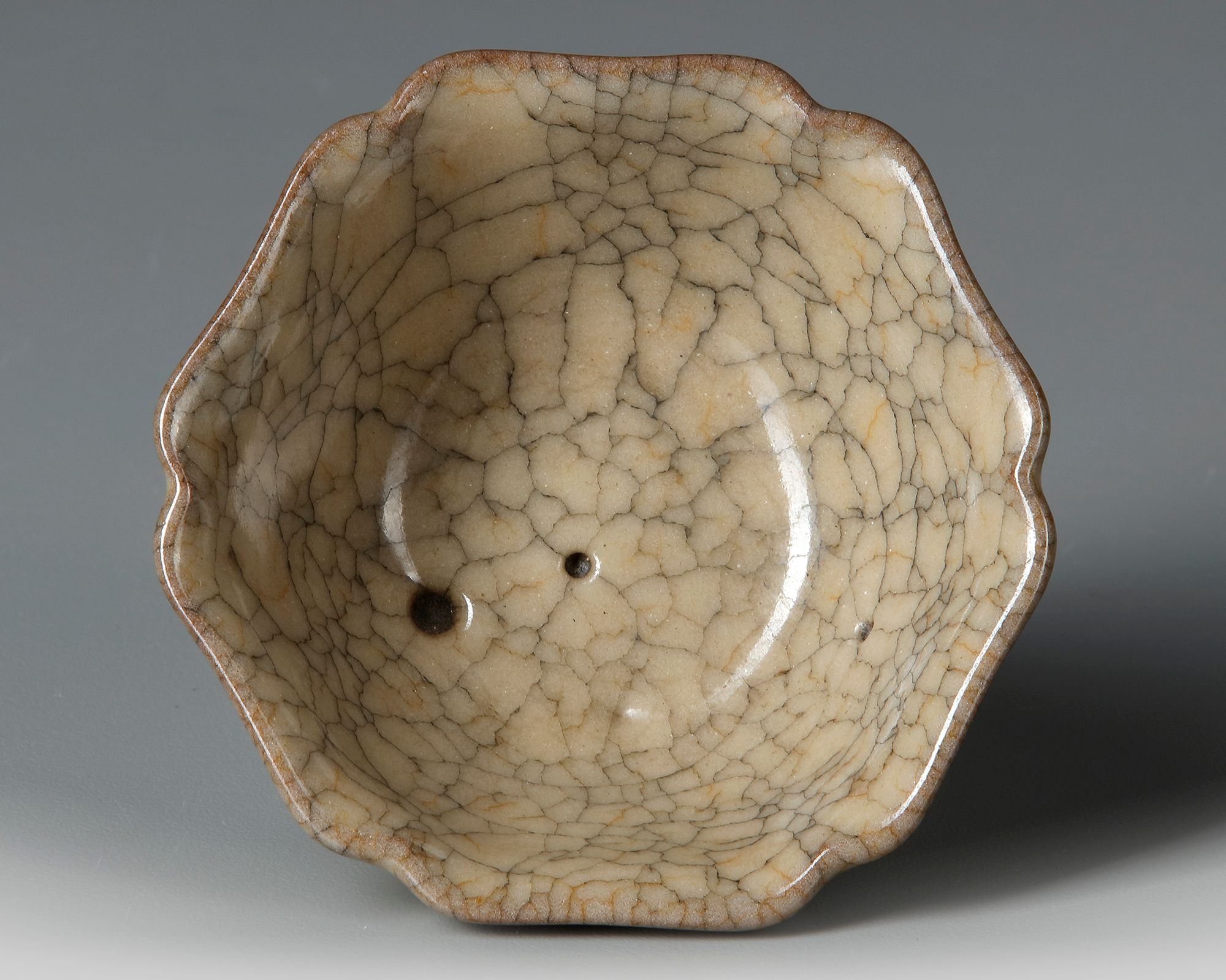 The hexagonal small bowl stands on a small unglazed base and covered with a network of black and brown crackle. 8.5 diam. 3.5 cm. height