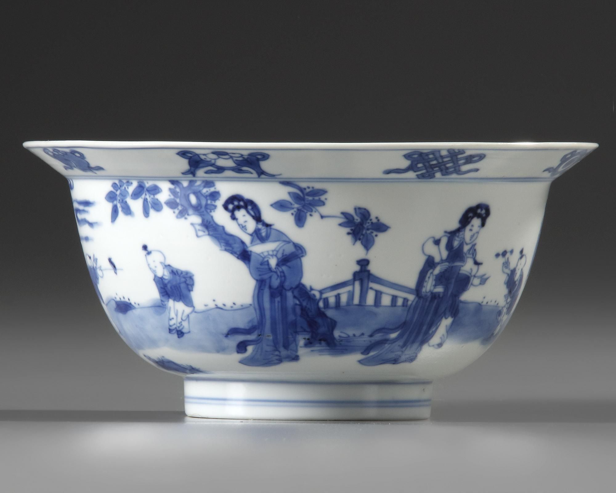 The bowl is decorated with a continuous scene of ladies and boys, below a diaper band with cartouches enclosing beribonned precious objects. The interior is decorated with boys at play in a fenced garden surrounded by a further diaper band with cartouches. The base has an apocryphal Kangxi mark in underglaze blue. H 7 D 15 cm.