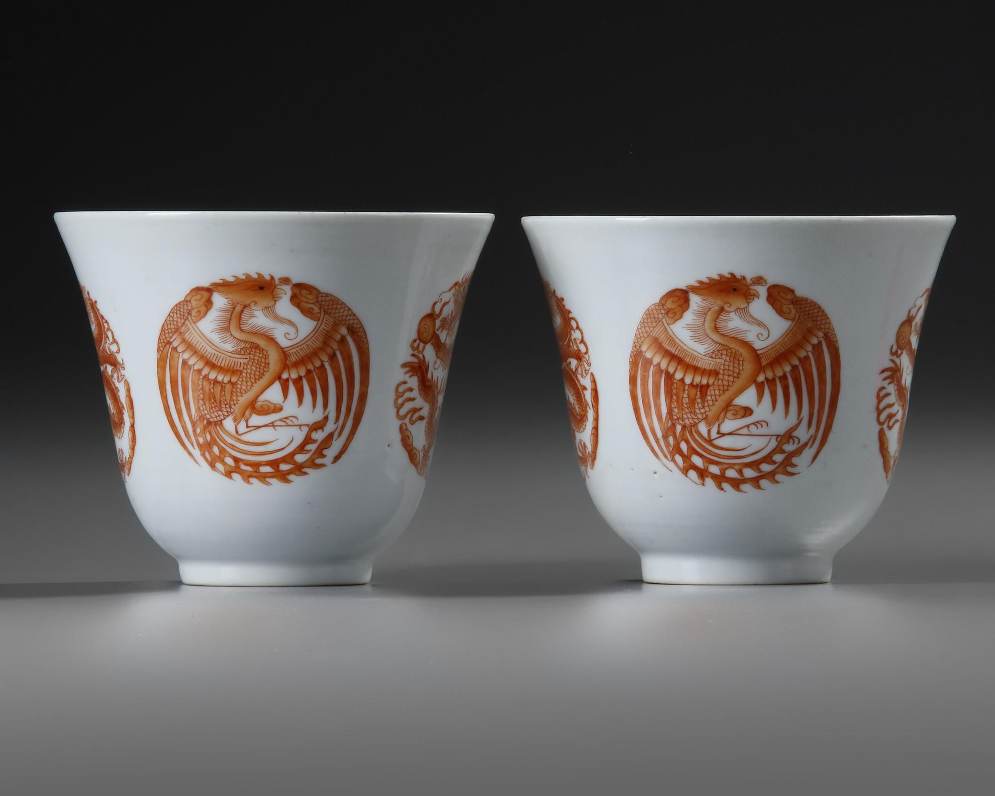 A PAIR OF CHINESE IRON-RED 'DRAGON AND PHOENIX' CUPS
