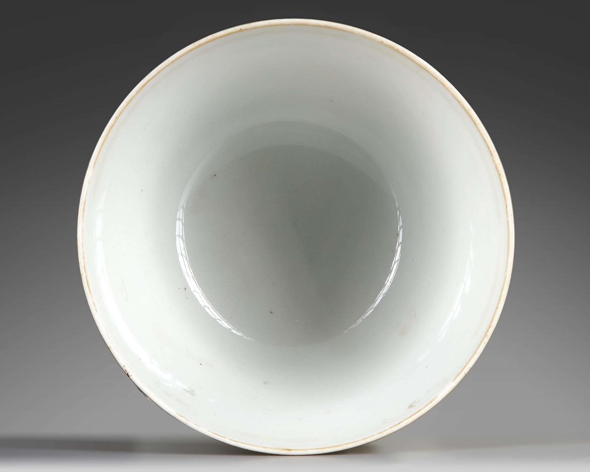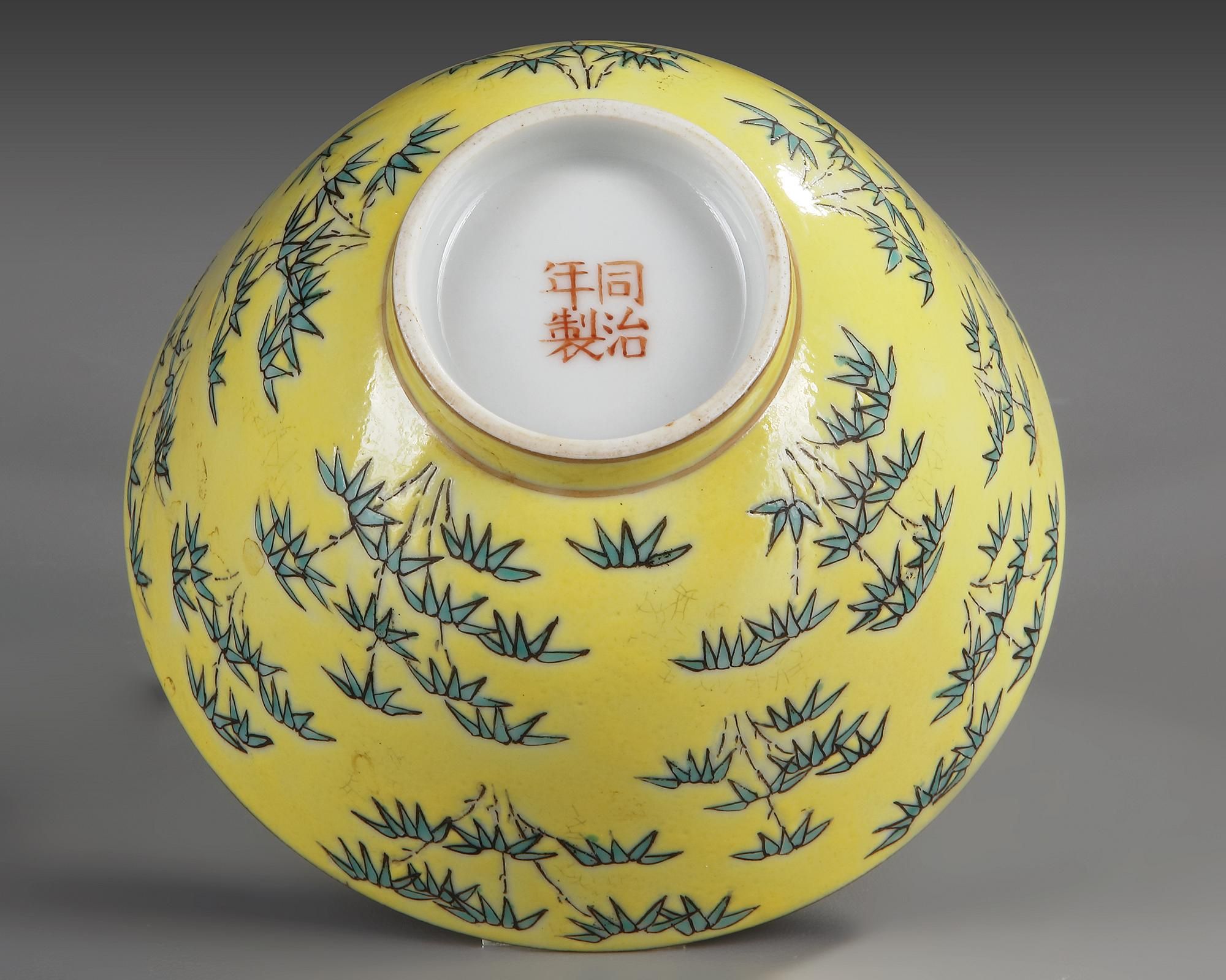 The tall flared body painted with sprays of bamboo on a bright yellow ground, the interior glazed white, a four character Tongzhi mark to the base.
